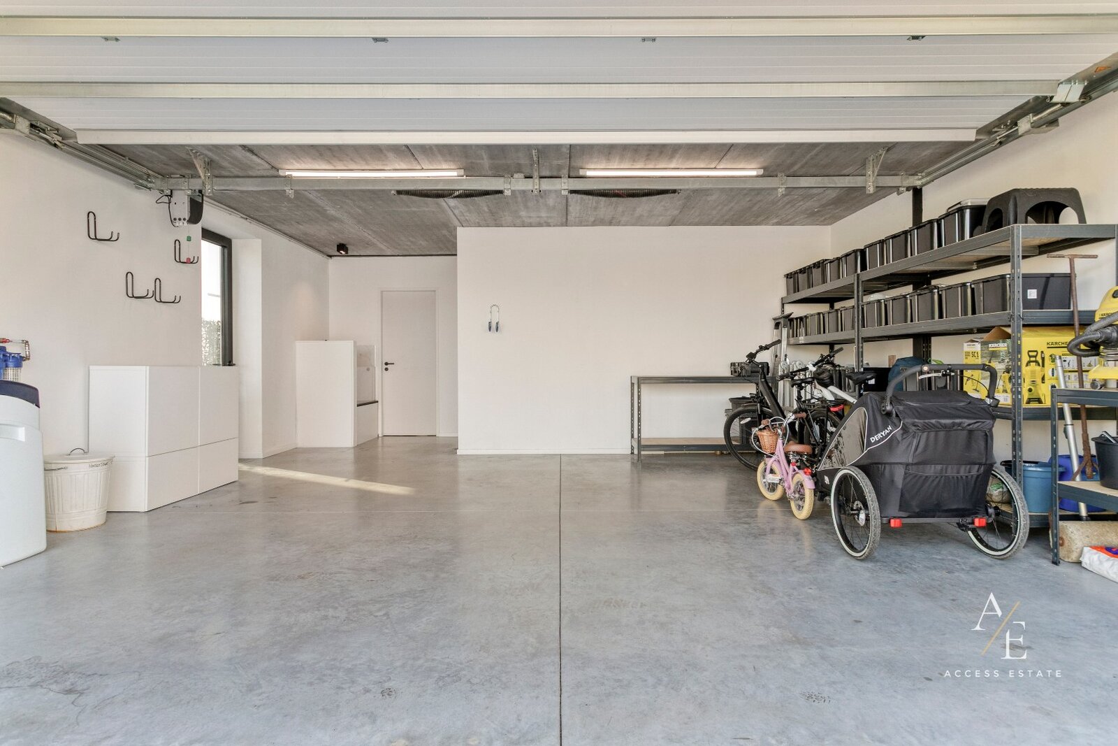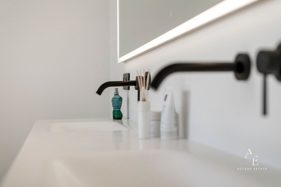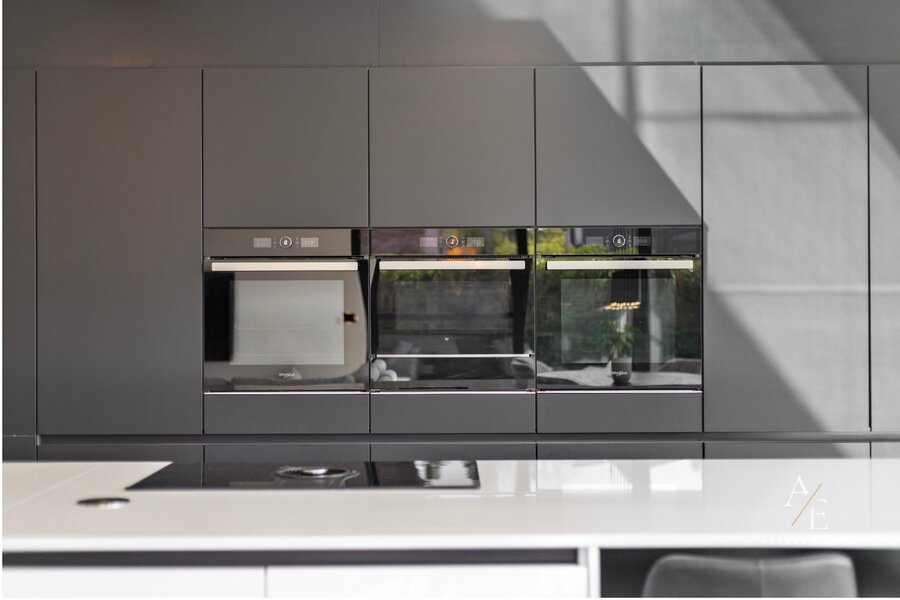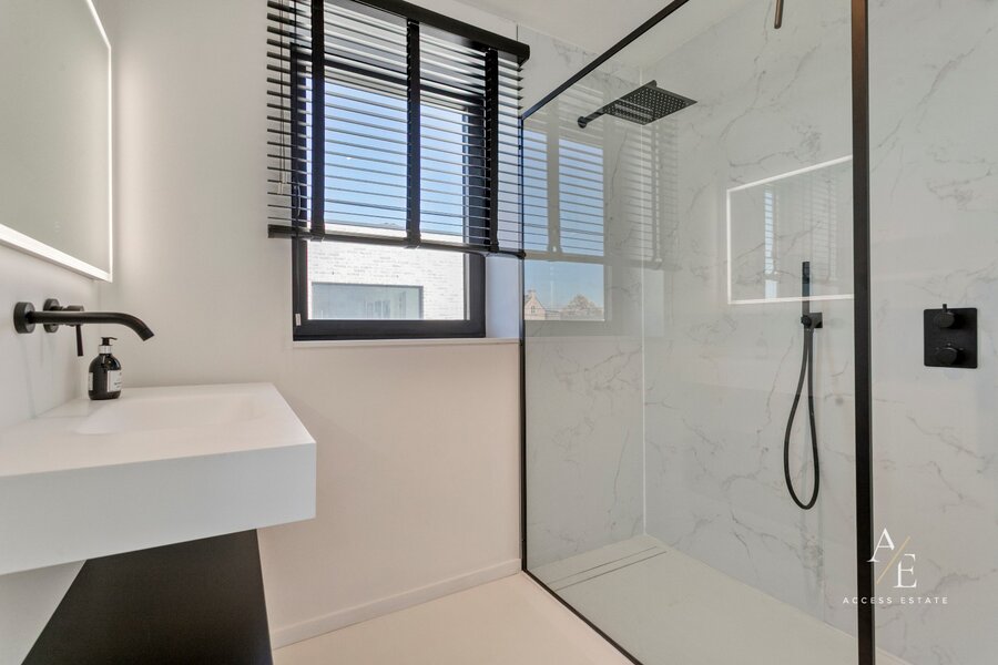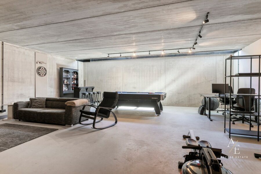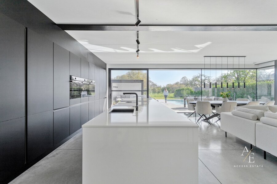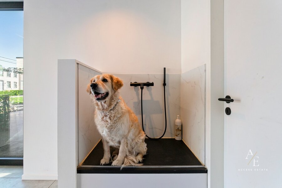Op het gelijkvloers bevinden zich een ruime garage voor meerdere wagens, een praktische wasplaats en een hondendouche. De luxueuze open leefkeuken met maatwerk vormt het hart van de woning.