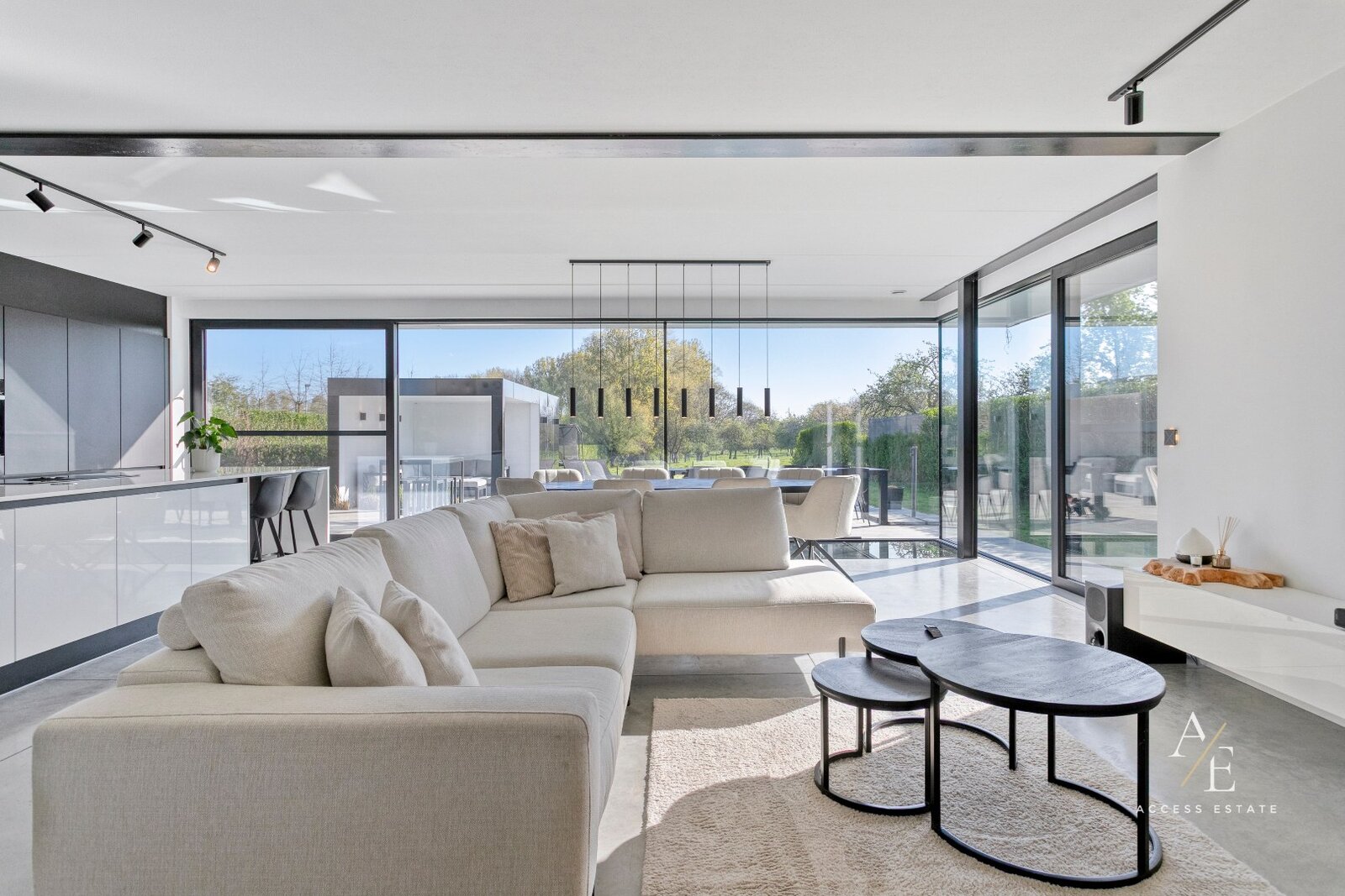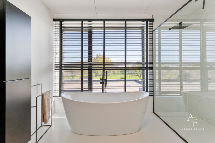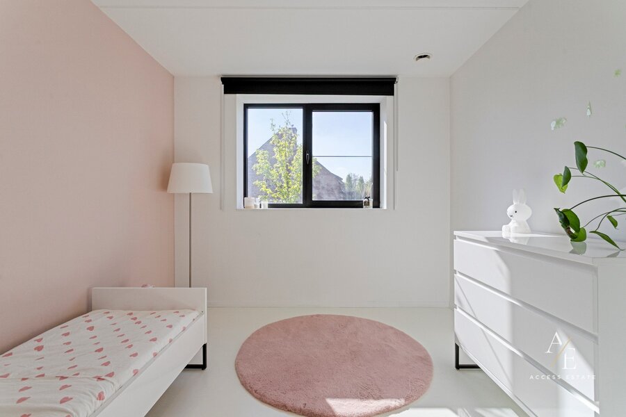 Dankzij de grote raampartijen en doordachte architectuur geniet elke ruimte van overvloedig licht en een prachtig zicht op de tuin en velden.