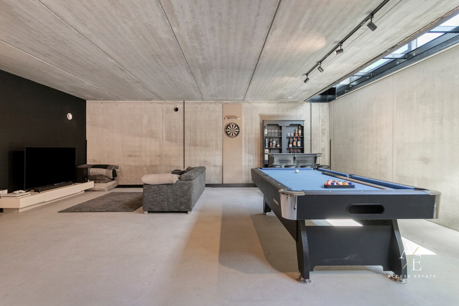 De kelderverdieping met natuurlijke lichtinval is multifunctioneel ingericht als kantoor, praktijkruimte of ontspanningsruimte met bar, tv-hoek, pooltafel en fitness.