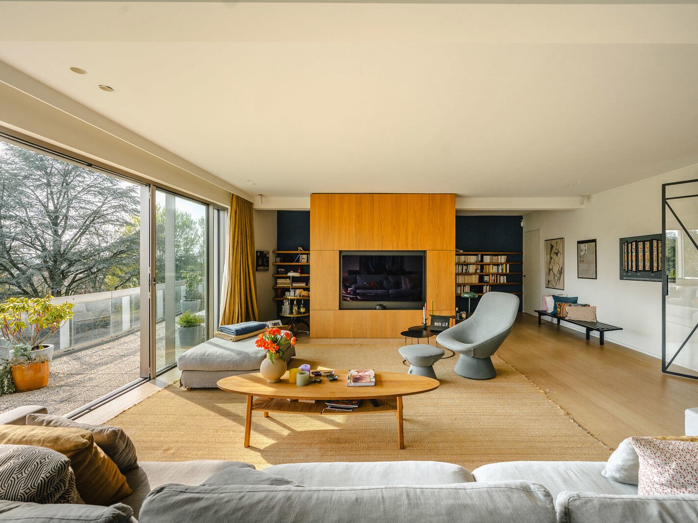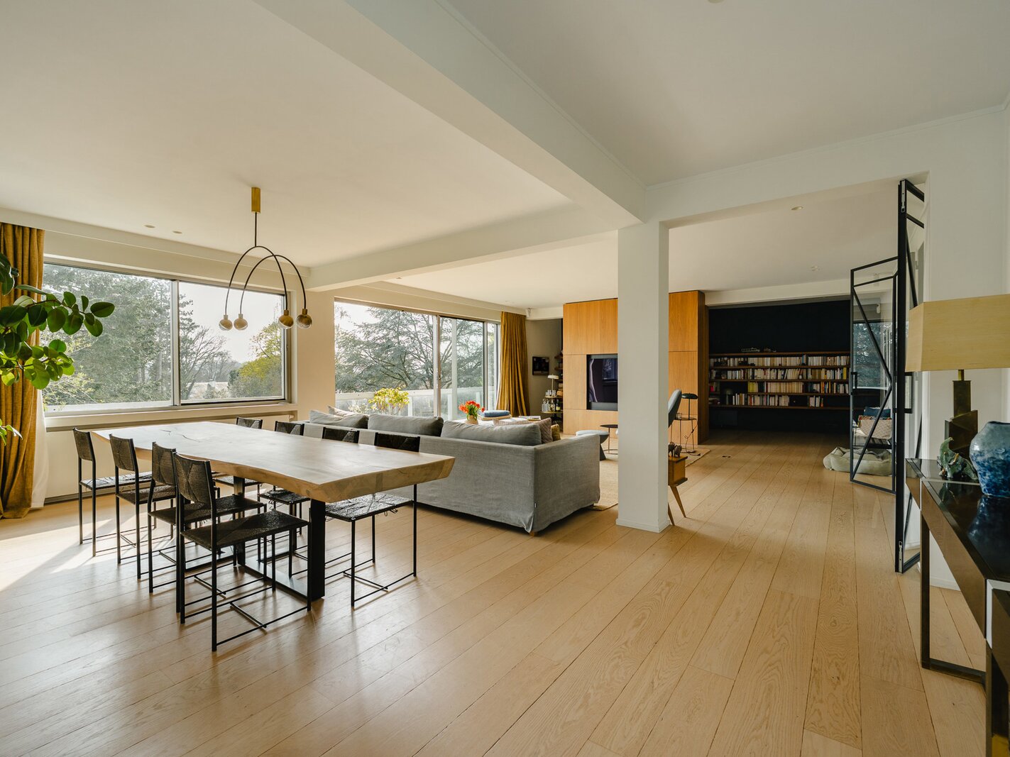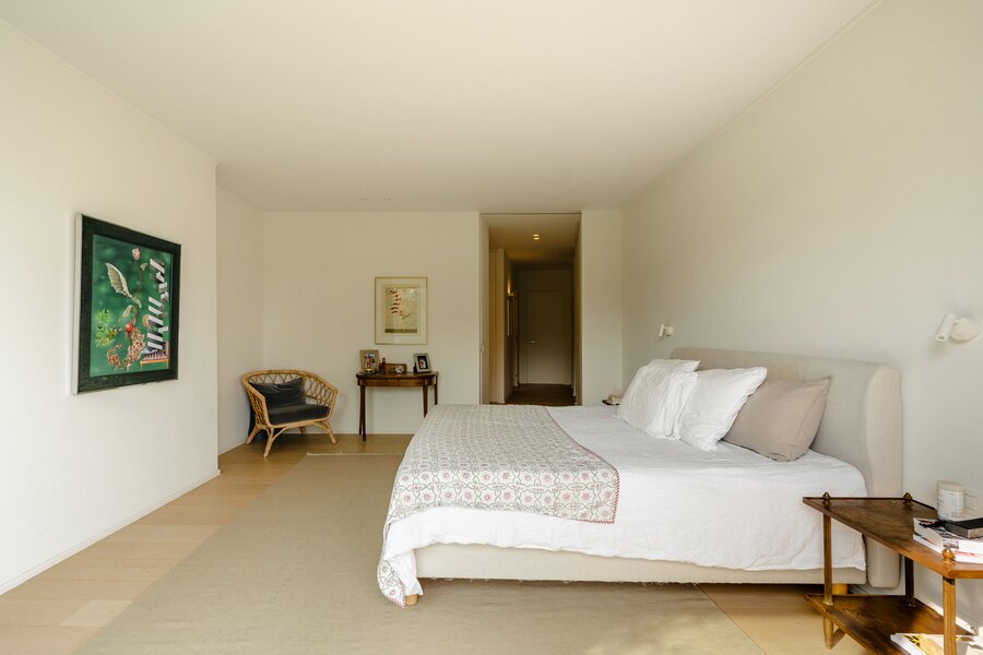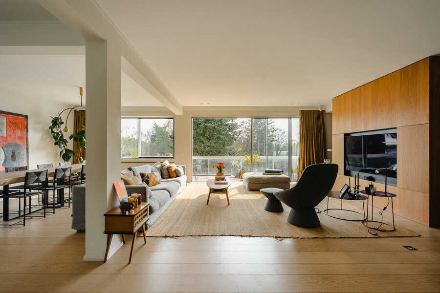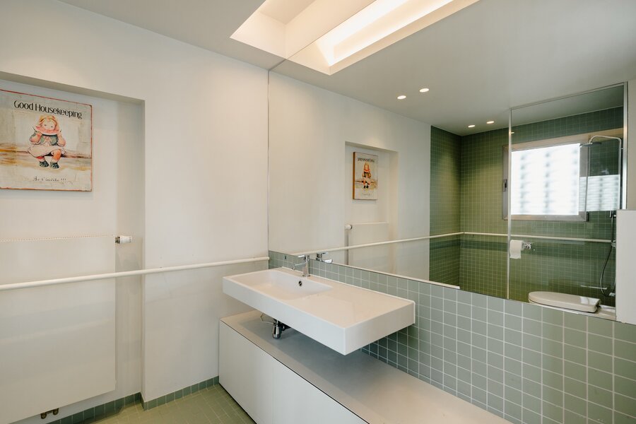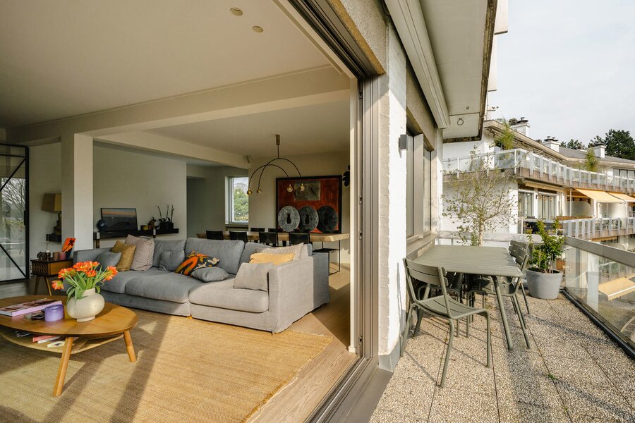Located in a modernist-style building, the apartment, renovated in 2020, opens onto an entrance hall with a cloakroom and guest toilet. This leads to the light-filled living areas, thanks to large bay windows that open onto the terrace and face the private park. These areas comprise a spacious living and dining room with integrated cabinetry, a fully equipped kitchen with a breakfast bar and breakfast nook, and an office. The sleeping quarters include a master bedroom with a separate dressing room, a full bathroom, a sauna, and access to the terrace, as well as three further bedrooms, each with a dressing room and en-suite bathroom. A separate laundry room completes the apartment. The apartment is adapted for people with reduced mobility.