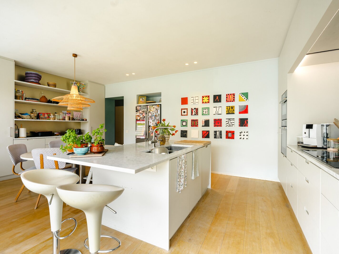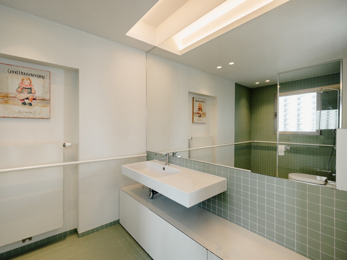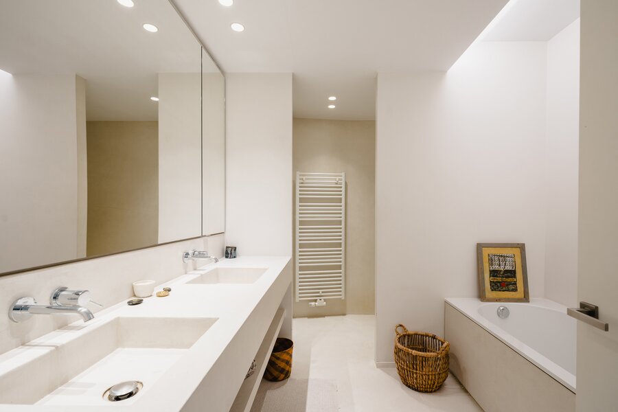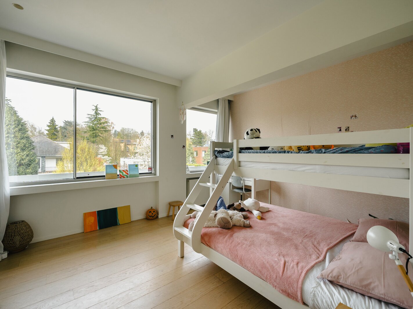 Located in a modernist-style building, the apartment, renovated in 2020, opens onto an entrance hall with a cloakroom and guest toilet. This leads to the light-filled living areas, thanks to large bay windows that open onto the terrace and face the private park. These areas comprise a spacious living and dining room with integrated cabinetry, a fully equipped kitchen with a breakfast bar and breakfast nook, and an office. The sleeping quarters include a master bedroom with a separate dressing room, a full bathroom, a sauna, and access to the terrace, as well as three further bedrooms, each with a dressing room and en-suite bathroom. A separate laundry room completes the apartment. The apartment is adapted for people with reduced mobility.