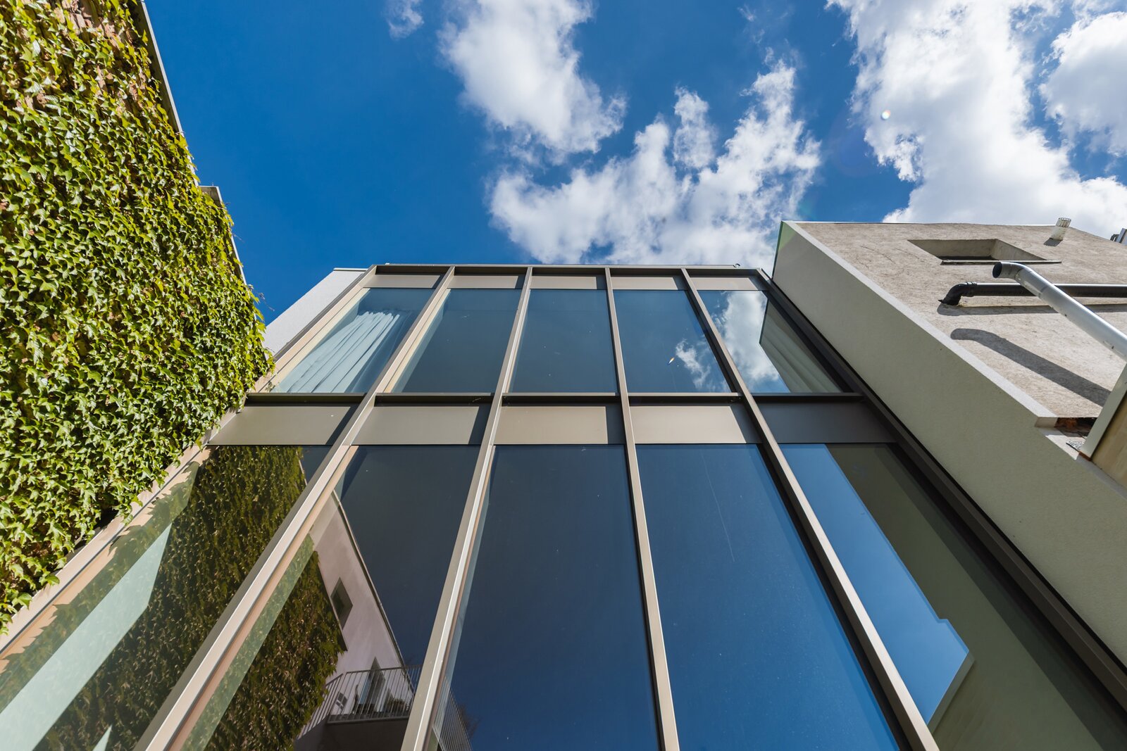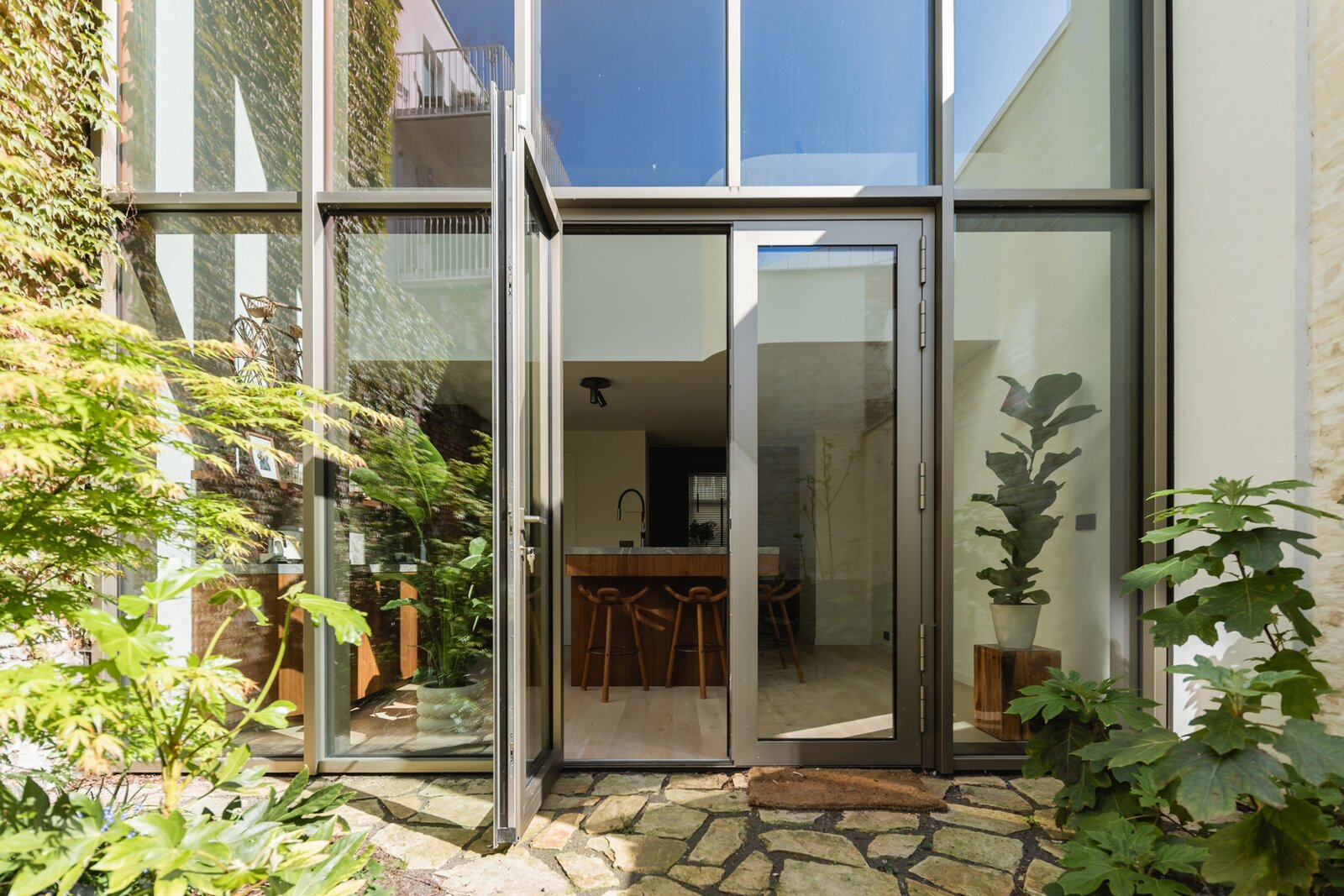 The impressive rear façade, spanning three floors, provides exceptional light and a strong sense of space. The first mezzanine houses a comfortable home cinema.