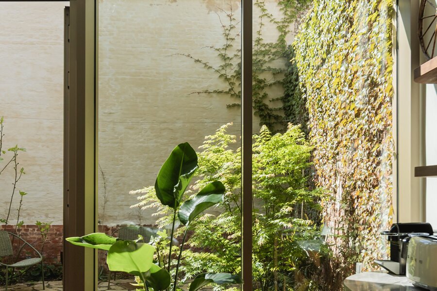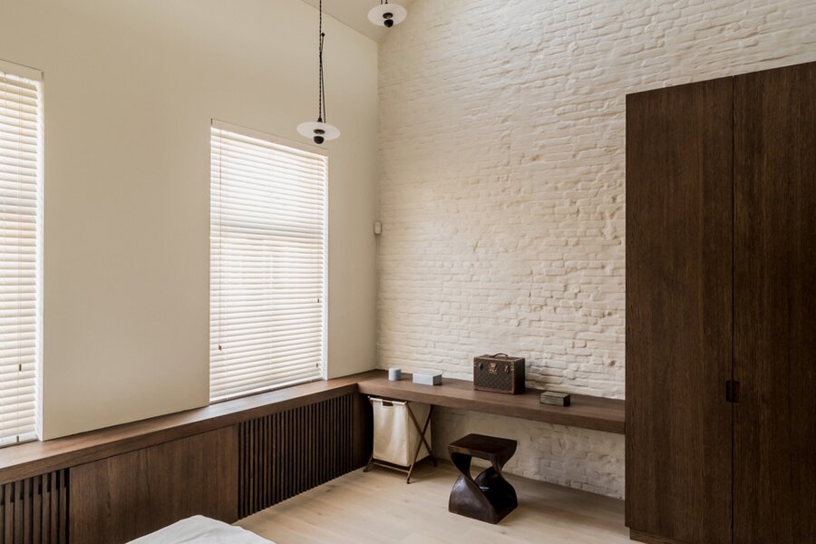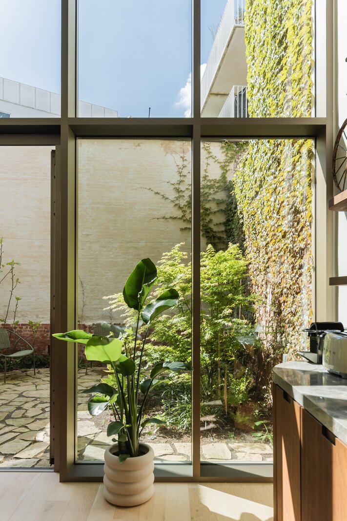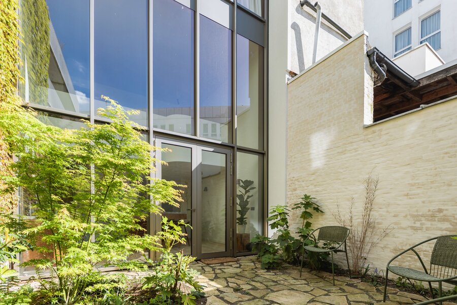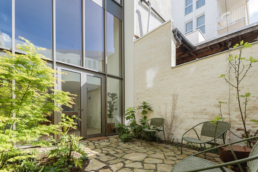 Upon entering, you are immediately enveloped in a serene wabi-sabi atmosphere. The ground floor features a luxurious kitchen in natural stone and walnut veneer, an open-plan living and dining area, and a cozy city patio that basks in the afternoon sun (W).