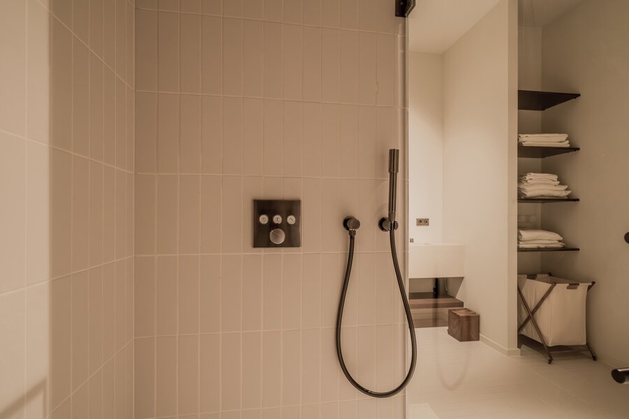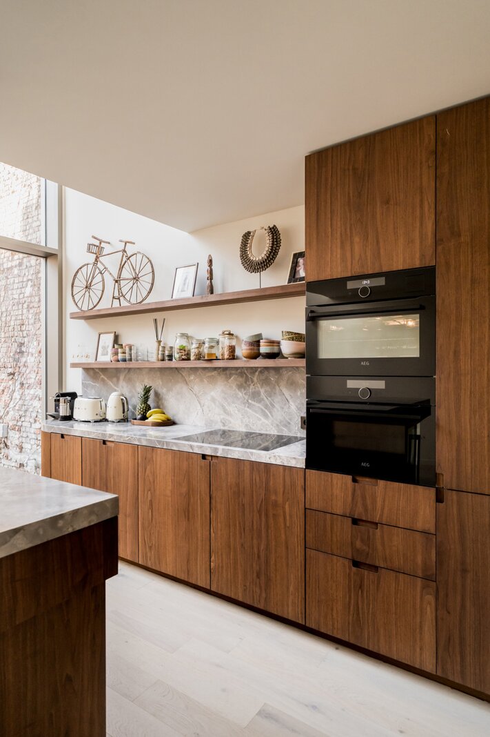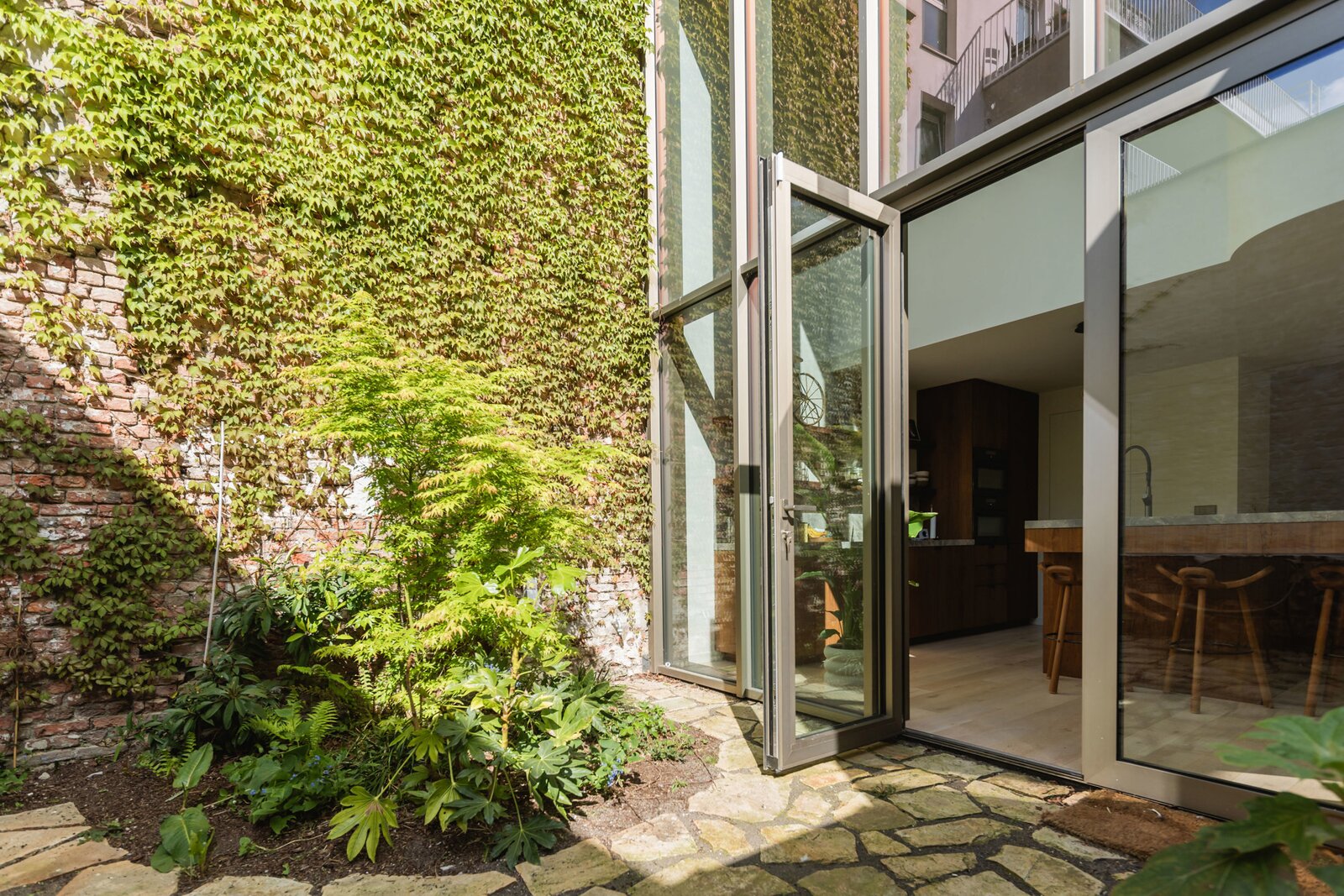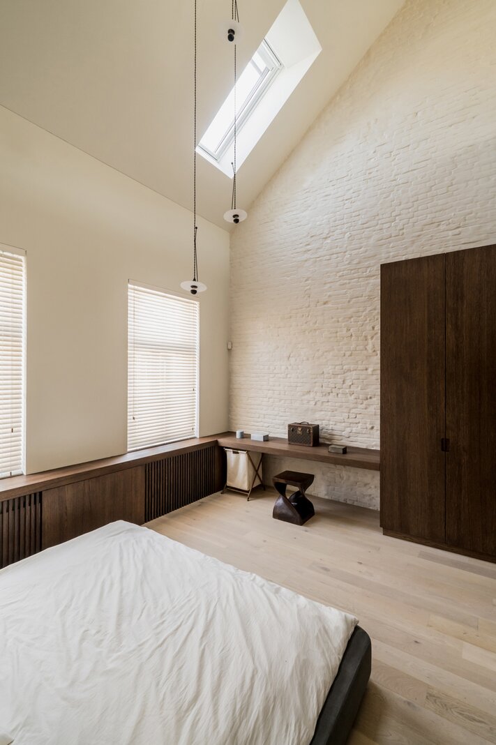 Upon entering, you are immediately enveloped in a serene wabi-sabi atmosphere. The ground floor features a luxurious kitchen in natural stone and walnut veneer, an open-plan living and dining area, and a cozy city patio that basks in the afternoon sun (W).