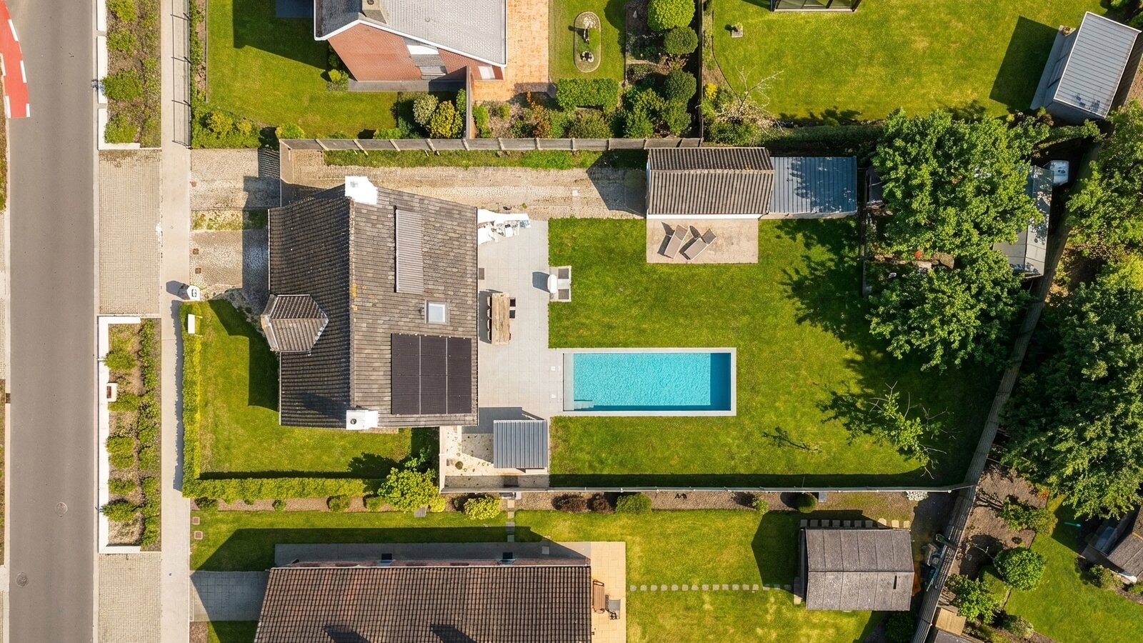 The kitchen provides access to the garage with an automatic door, where two solar panels and three home batteries are also installed. There is also a practical storage/laundry room. Outside, you can enjoy two landscaped terraces and private parking in front of and alongside the house, with space for several cars. Additional storage is available in a separate outdoor garage/shed.