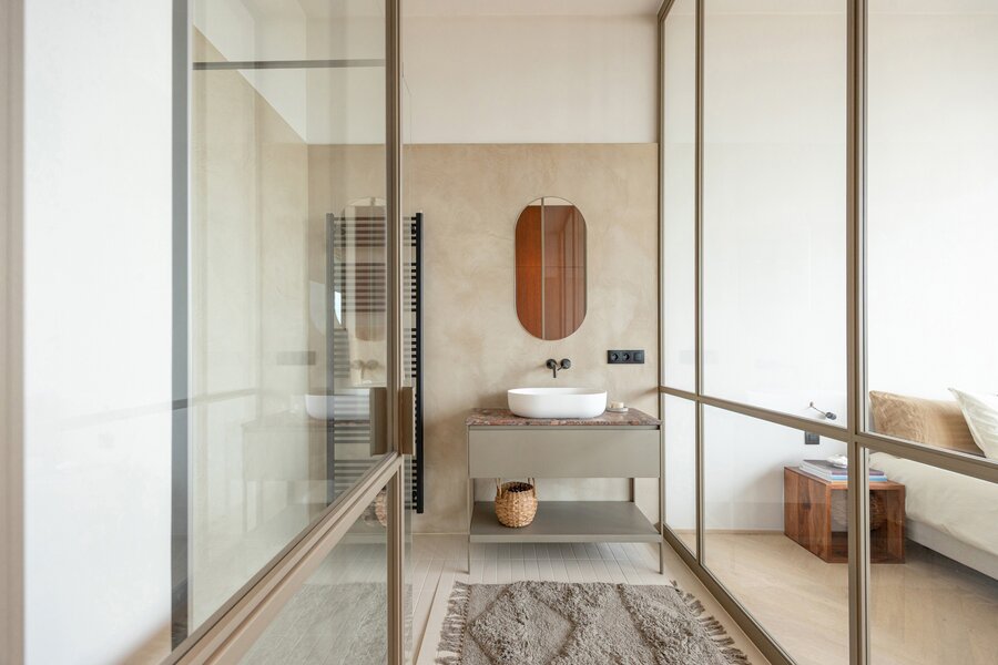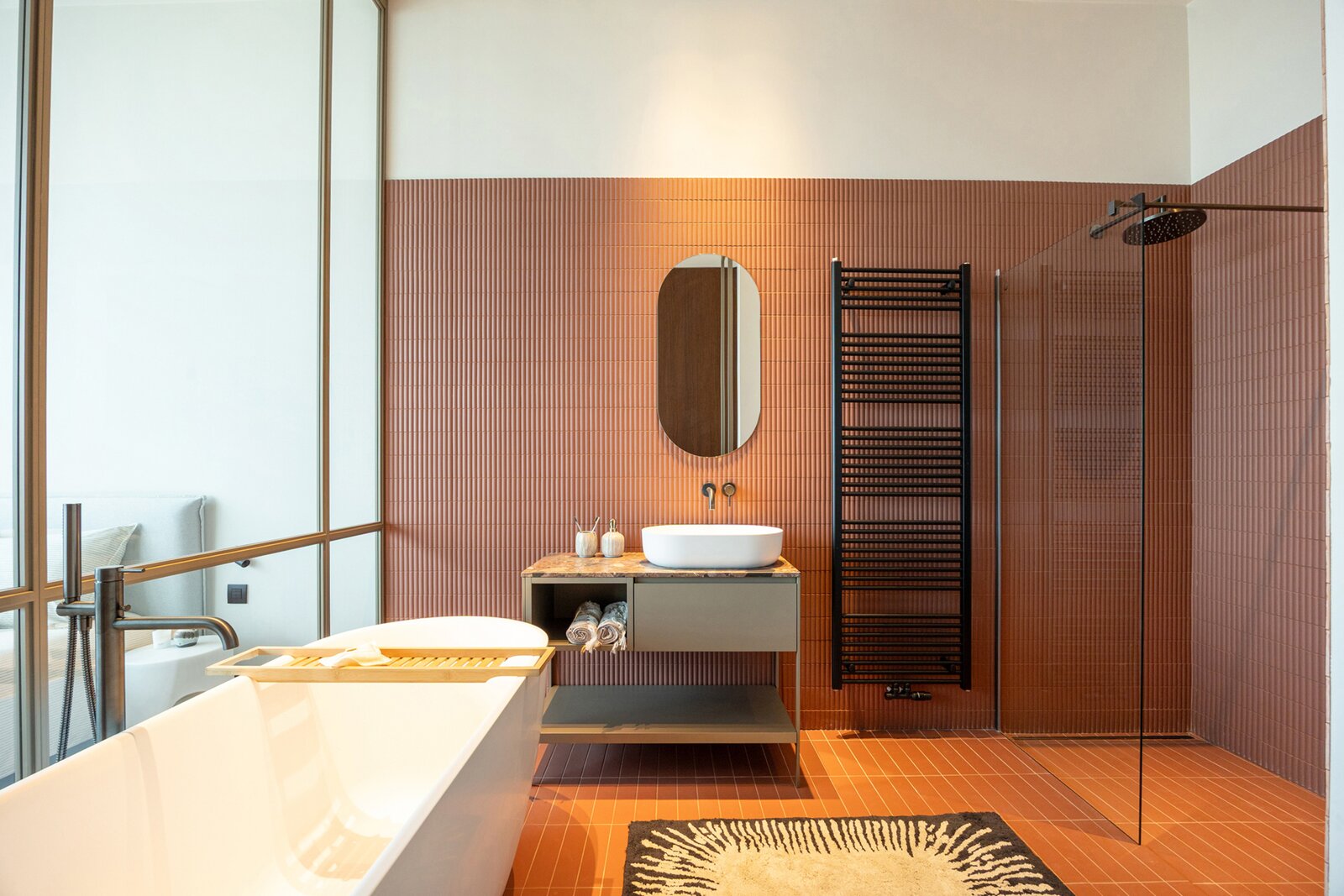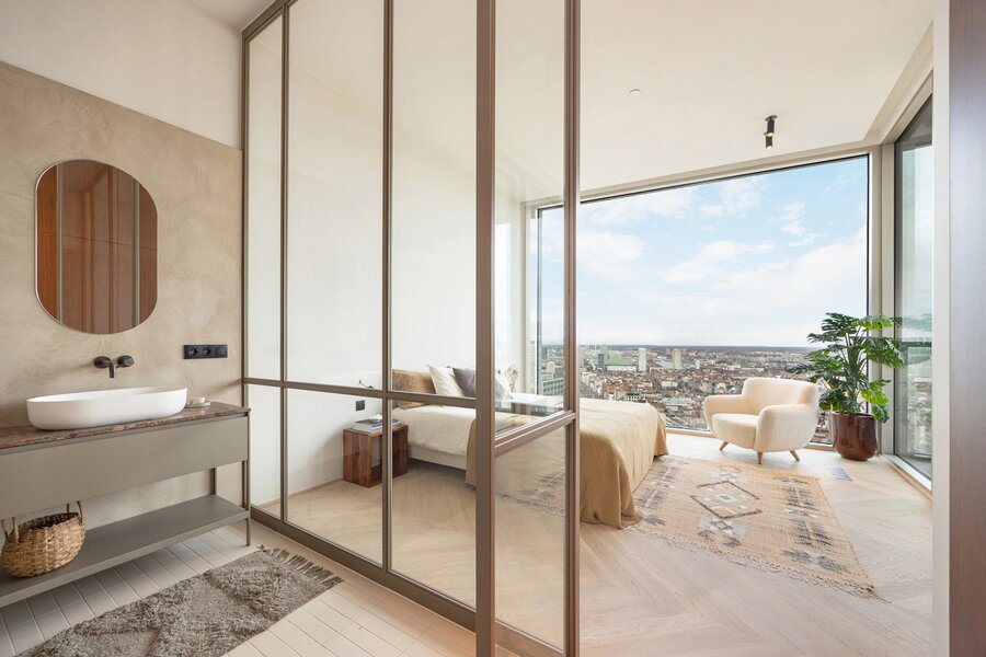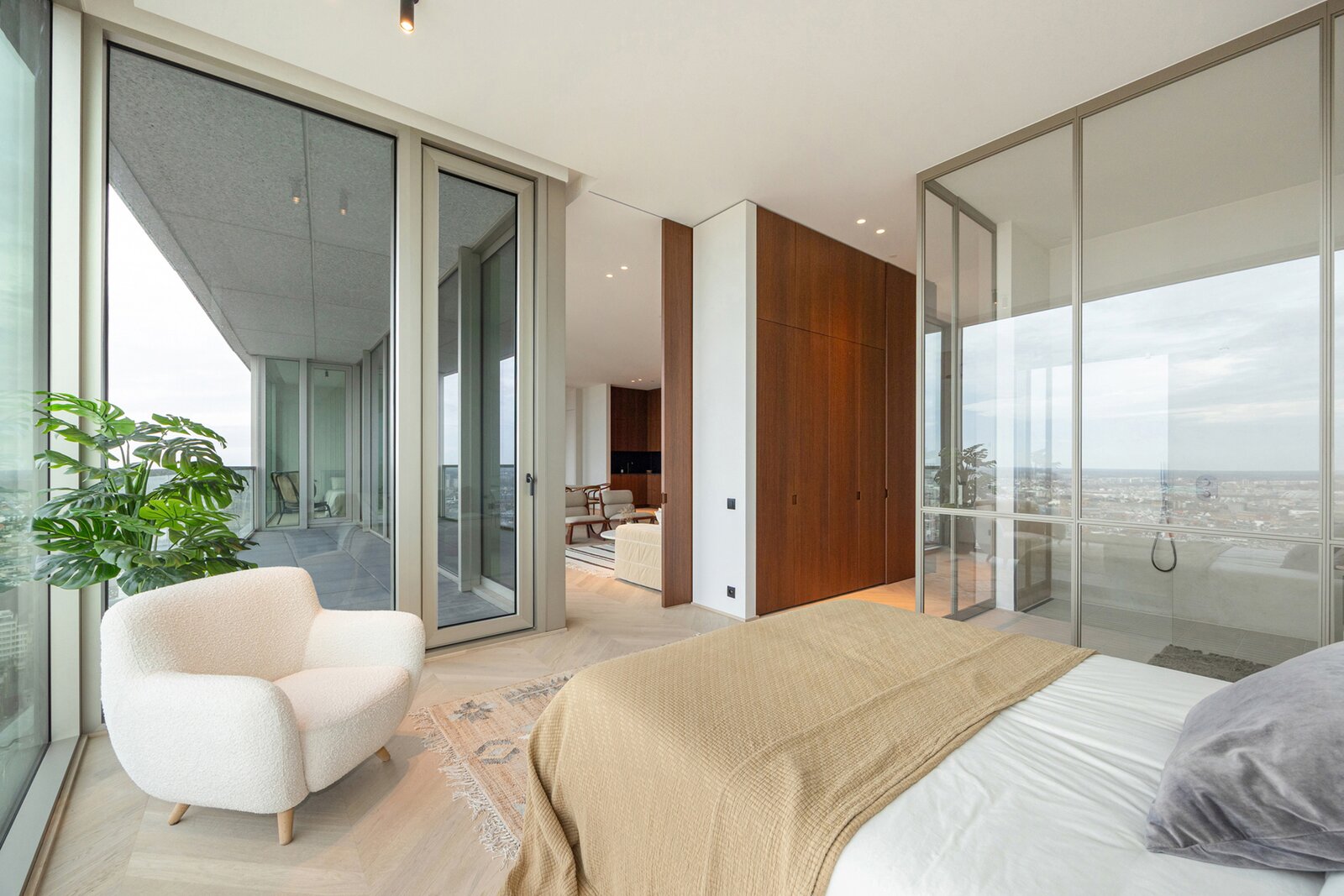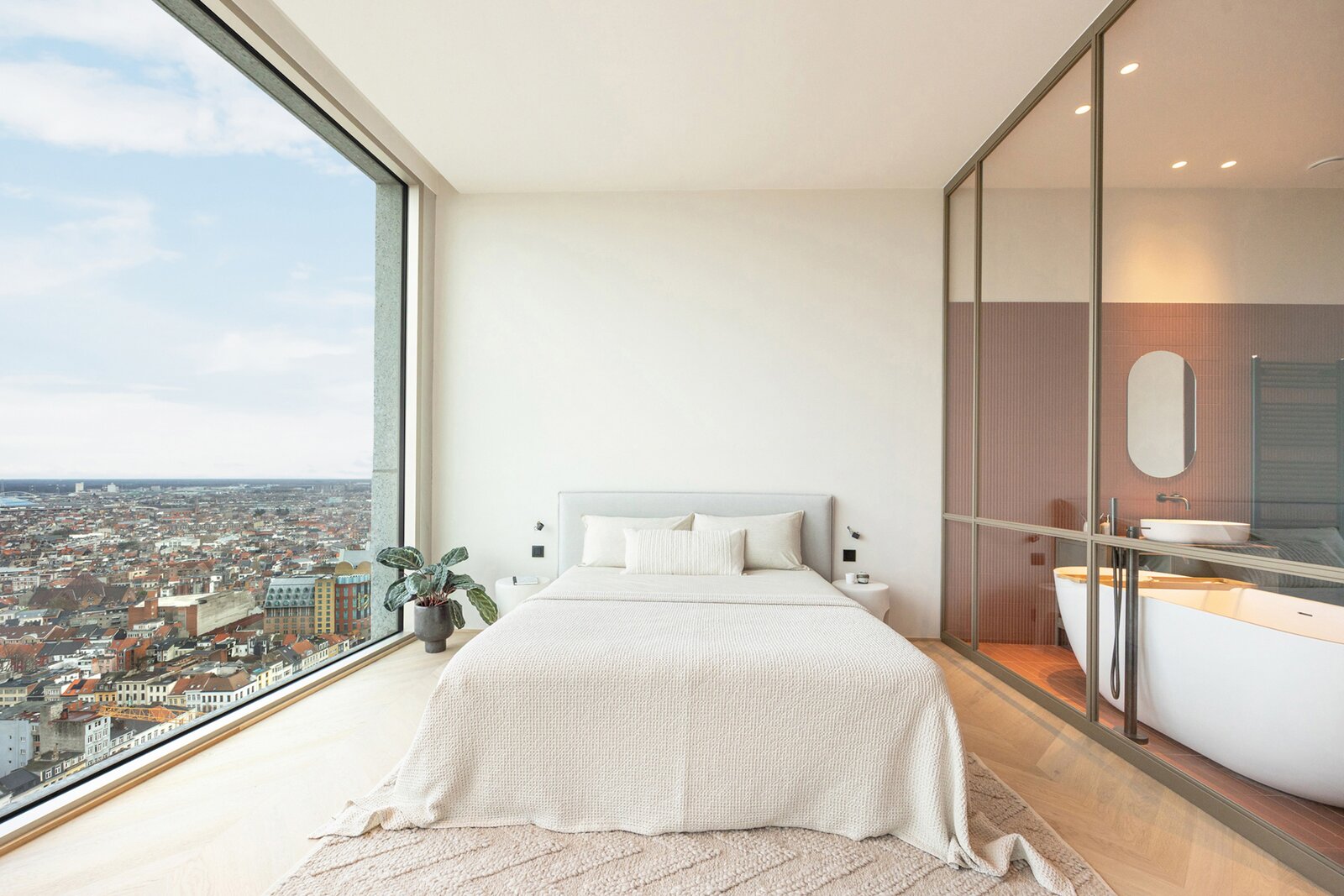 Sustainability and quality are the building blocks of the Antwerp Tower. For example, each apartment enjoys underfloor heating thanks to the solar collectors on the roof, solar shading on the inside increases your living comfort and a tailor-made high-quality finish. Wide polished concrete with seamless and floor-to-ceiling windows characterize the apartments.
