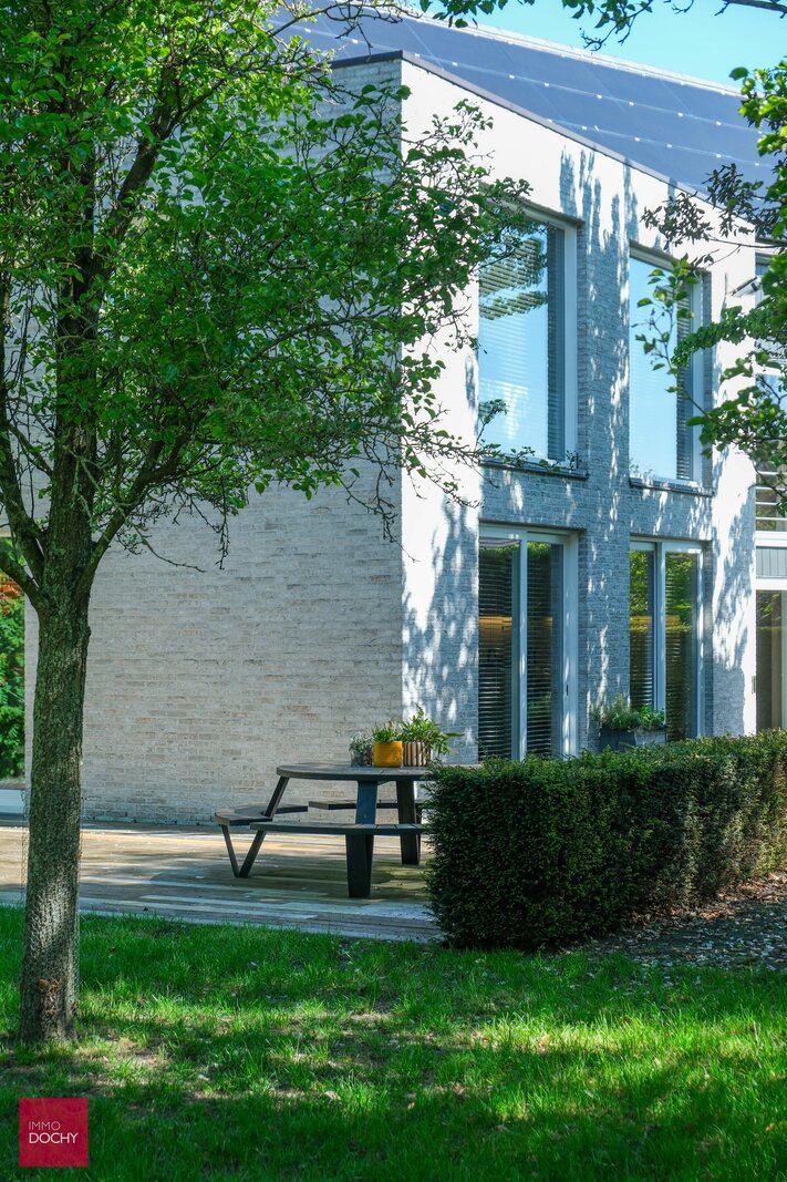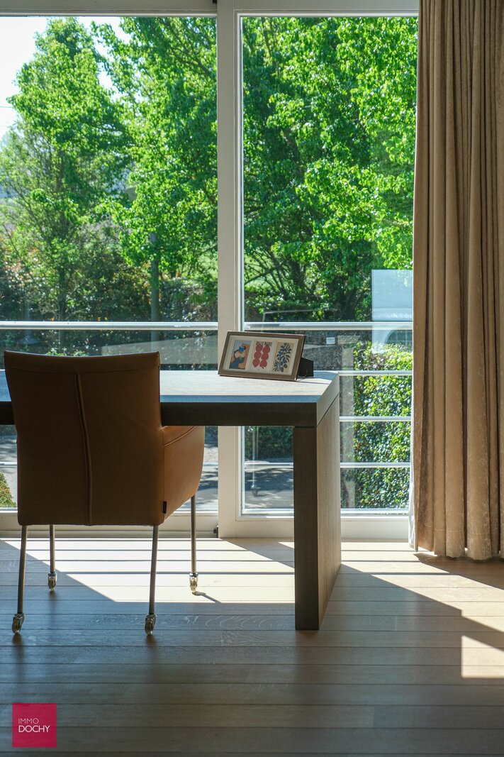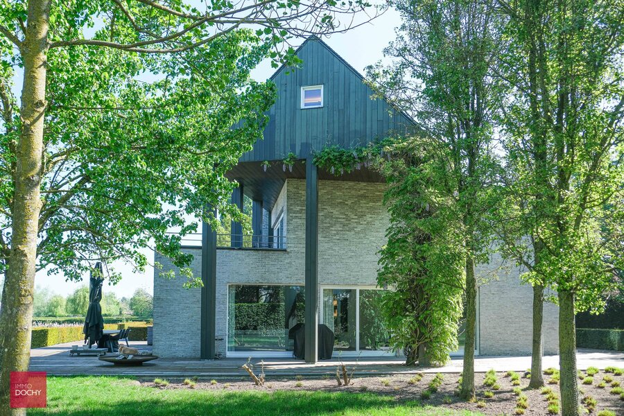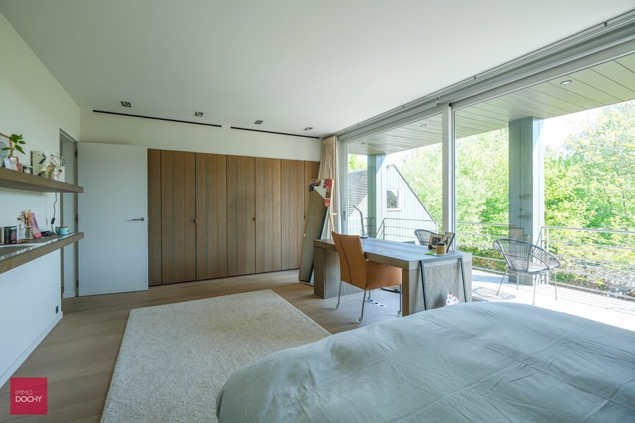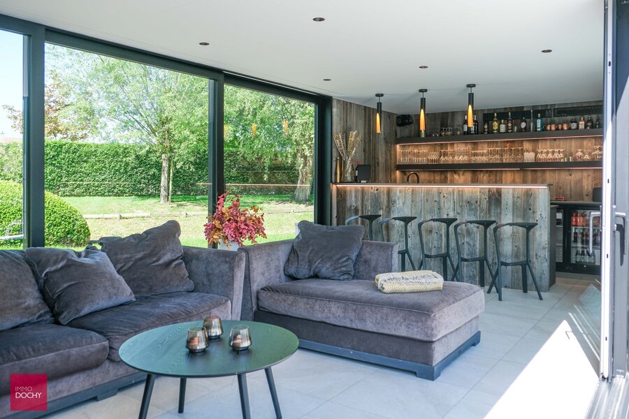 Inkomhal, ruime living, ingerichte keuken, bijkeuken, bureau, 4 slaapkamers (waaronder master bedroom met dressing, sanitair en zonneterras), 3 badkamers, hobbykamer/cinema-kamer, volledig onderkelderd (wijnkelder, cv via warmtepomp, fitnessruimte), garage voor 3 wagens, parking, verwarmd buitenzwembad (5x 24m), bijgebouw (bar), aangelegde tuin, vijver en weiden voor paardenliefhebbers. Overal airco aanwezig en zonnepanelen. Architect Corbiau