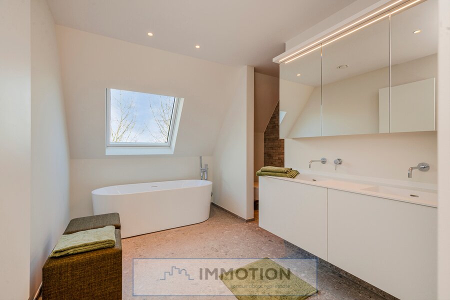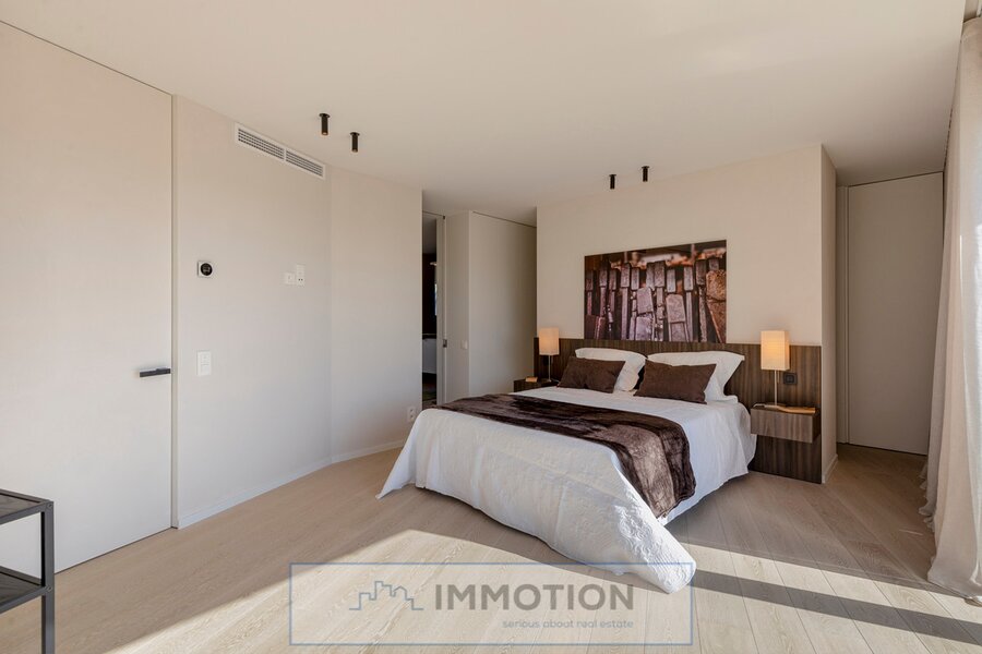 Een nachthal leidt naar het gastentoilet, de master bedroom met dressing en een luxe badkamer met ligbad en douche, evenals een terras.