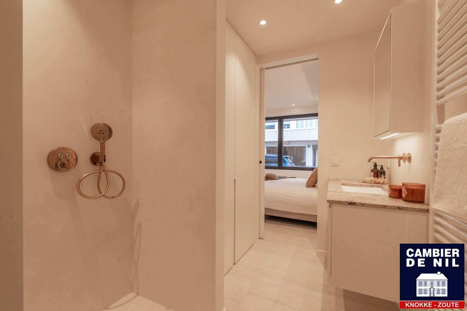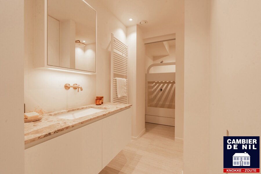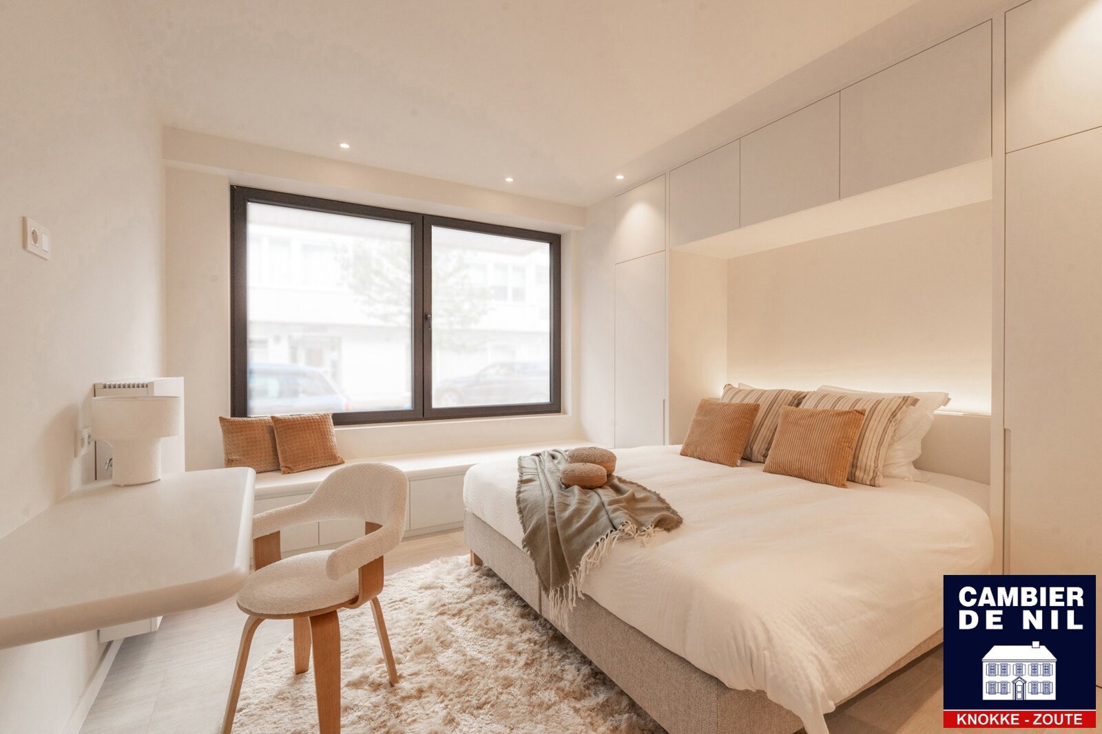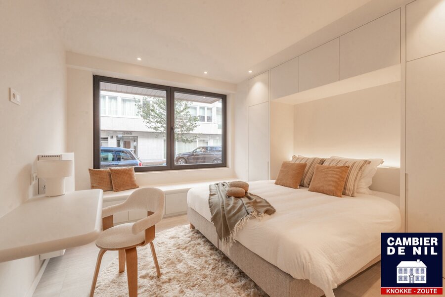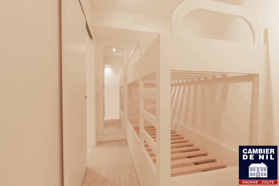 Appartement magnifiquement rénové avec jardin de ville et terrasse couverte dans un endroit calme mais central à Knokke. Composition : Hall d'entrée avec vestiaire et toilettes séparées. Espace de vie lumineux avec salon cosy. Une cuisine ouverte (électroménagers Miele intégrés) et coin repas. Débarras séparé. Grandes fenêtres avec une superbe vue sur le jardin et la terrasse couverte. Une chambre parentale avec bureau et placards intégrés. Une 2ème chambre avec lit superposé intégré. Une salle de douche commune avec 2 entrées vers les deux chambres.