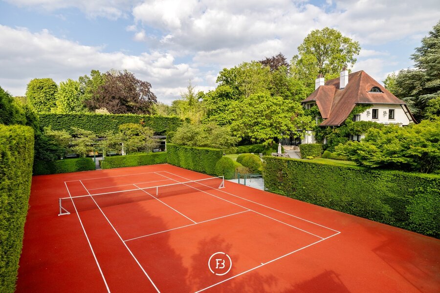 L'espace extérieur est tout aussi impressionnant avec une piscine à débordement, une terrasse ensoleillée et un court de tennis. Le jardin est caractérisé par quelques arbres remarquables et est en outre magnifiquement éclair