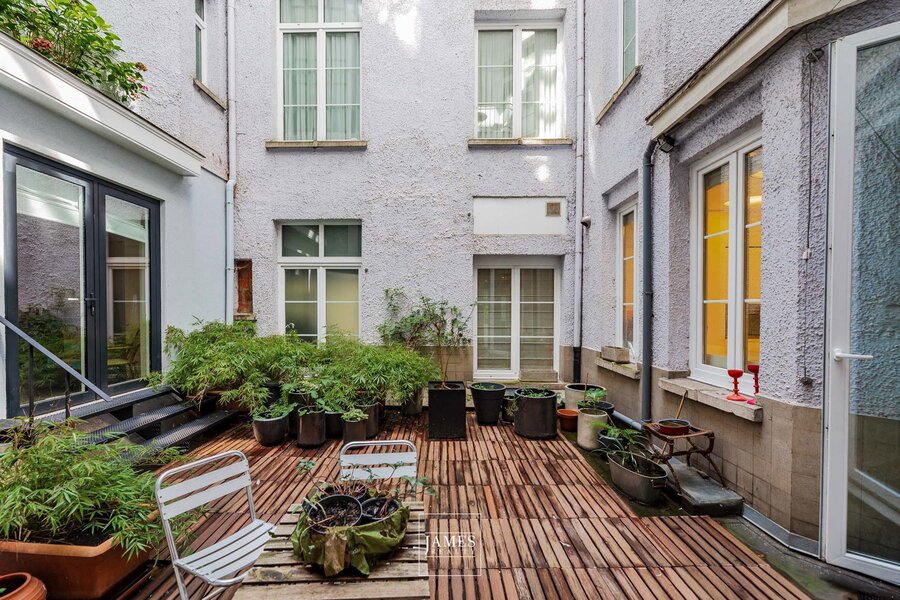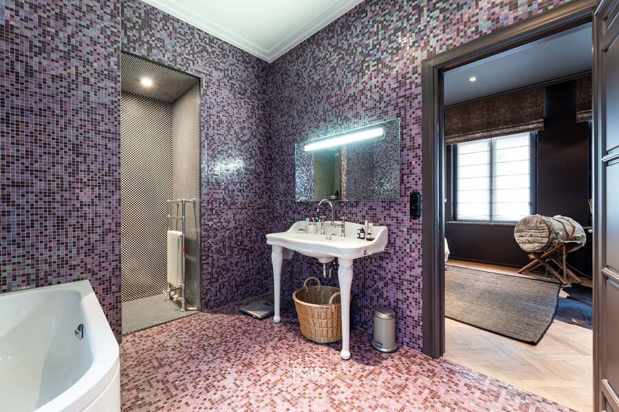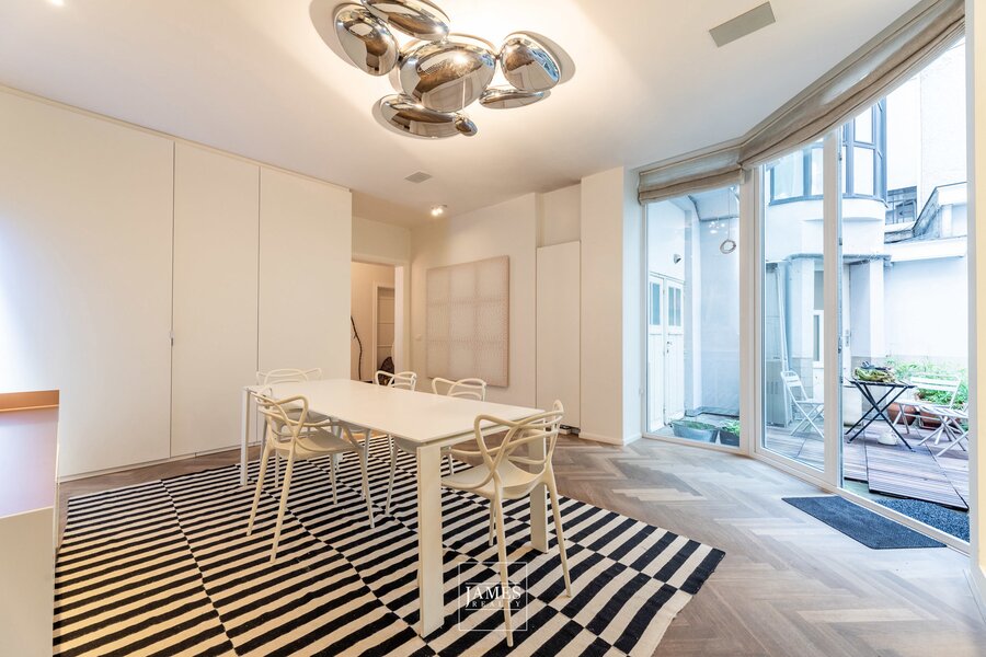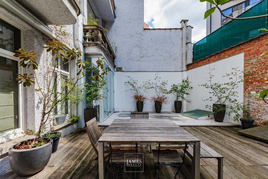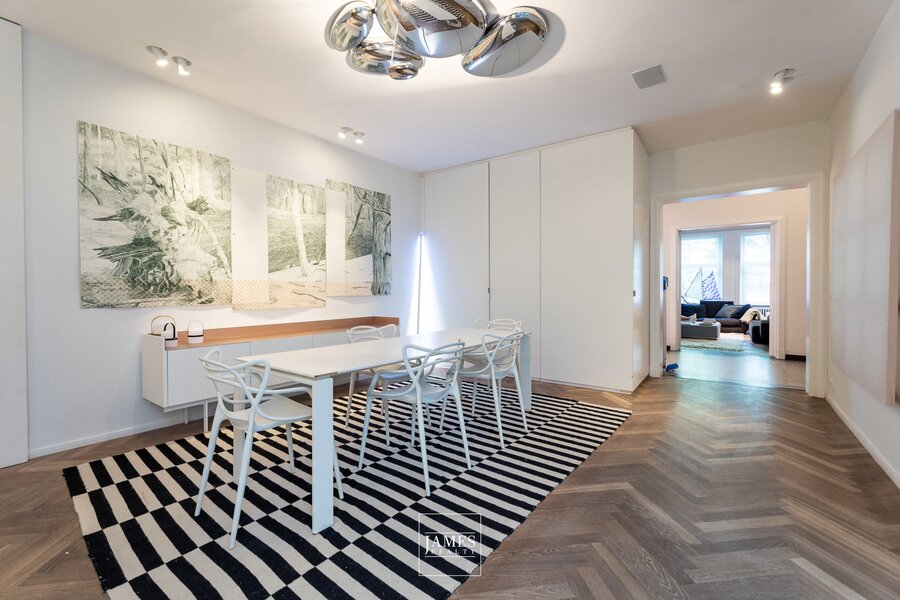 Face au site classé de l'Abbaye de la Cambre, superbe appartement de +- 233m2 rénové avec goût et caractère. On y retrouve, passé le hall d'entrée, un grand salon avec sa partie bureau ou salon TV, une cuisine dînatoire hyper-équipée et sa salle à manger s'ouvrant sur un ravissant patio. la partie nuit compte deux chambres en suite dont la suite parentale avec son dressing et sa salle de bains complète. On accède à un ravissant petit jardin privatif via la partie nuit. Nombreux rangements sur-mesure, cave et bel emplacement de parking: rare