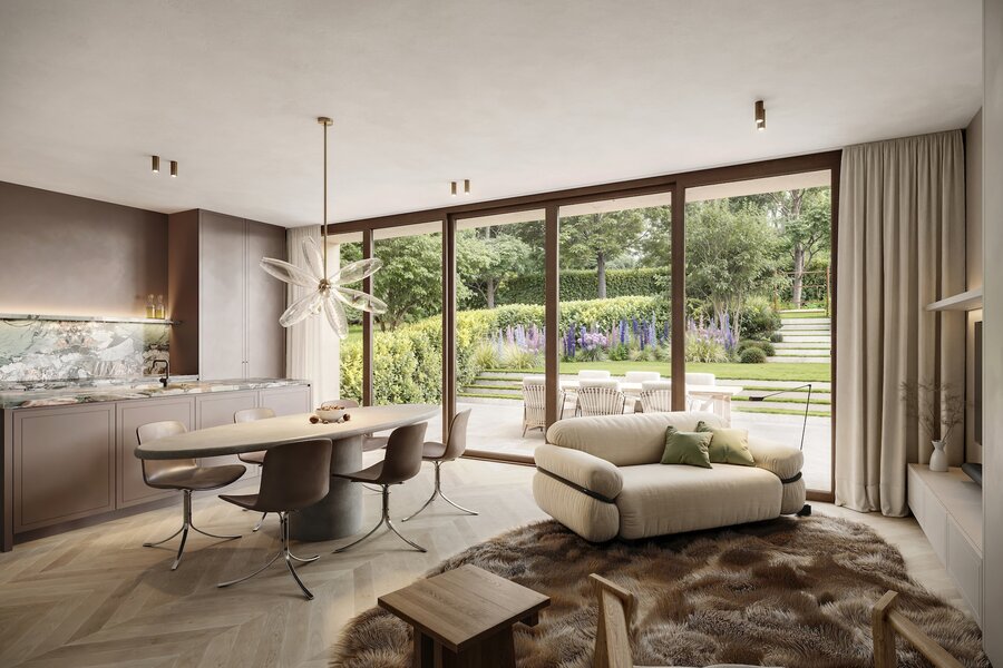 Le jardin central prolonge naturellement le Parc Tenbosch, offrant des vues verdoyantes et panoramiques depuis chaque résidence.