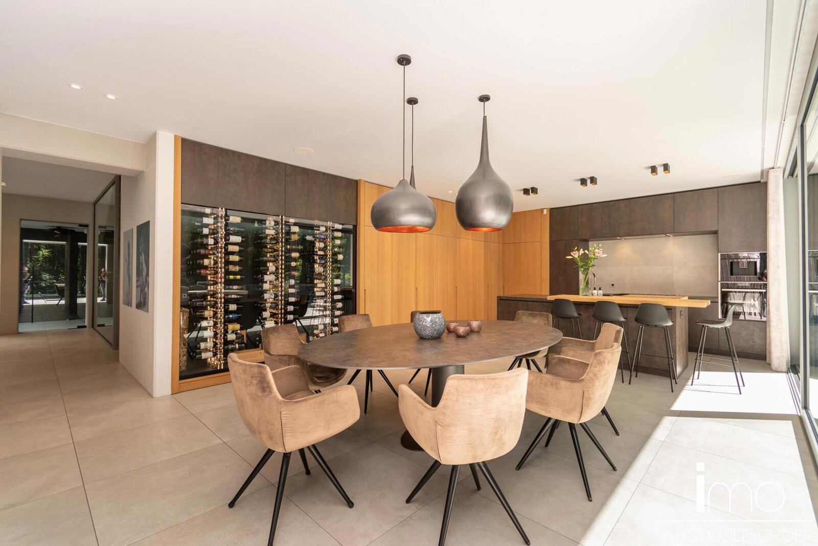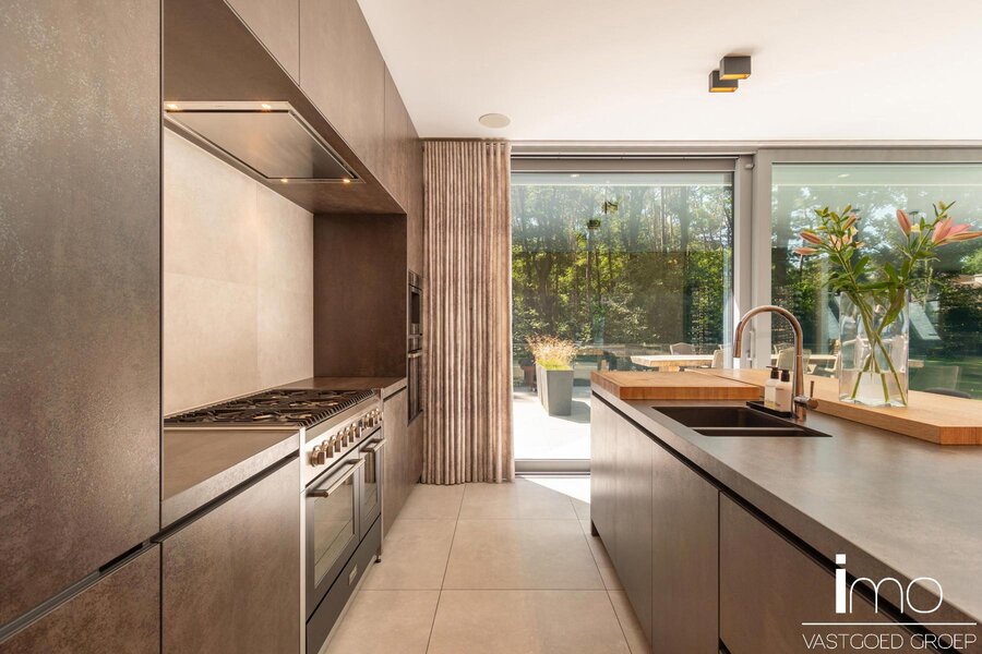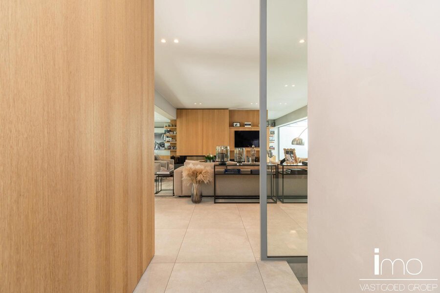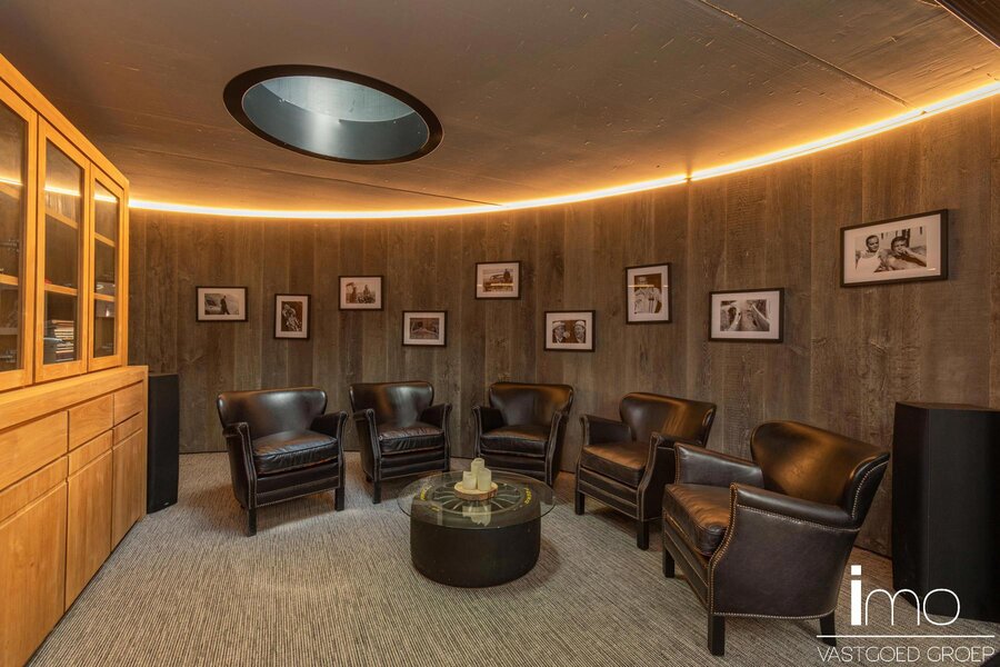 Bij het betreden van dit pand worden we meteen verbaasd door de dakramen naast de woonkamer en de aandacht voor bijzondere, exclusieve materialen. De leefruimte is voorzien van een mooie gashaard en wordt door een kastenwand gescheiden van de bureau-ruimte. Aansluitend is er een eetplaats met geweldige wijnkast, alsook een volledig uitgeruste keuken met speciale kookapparatuur.