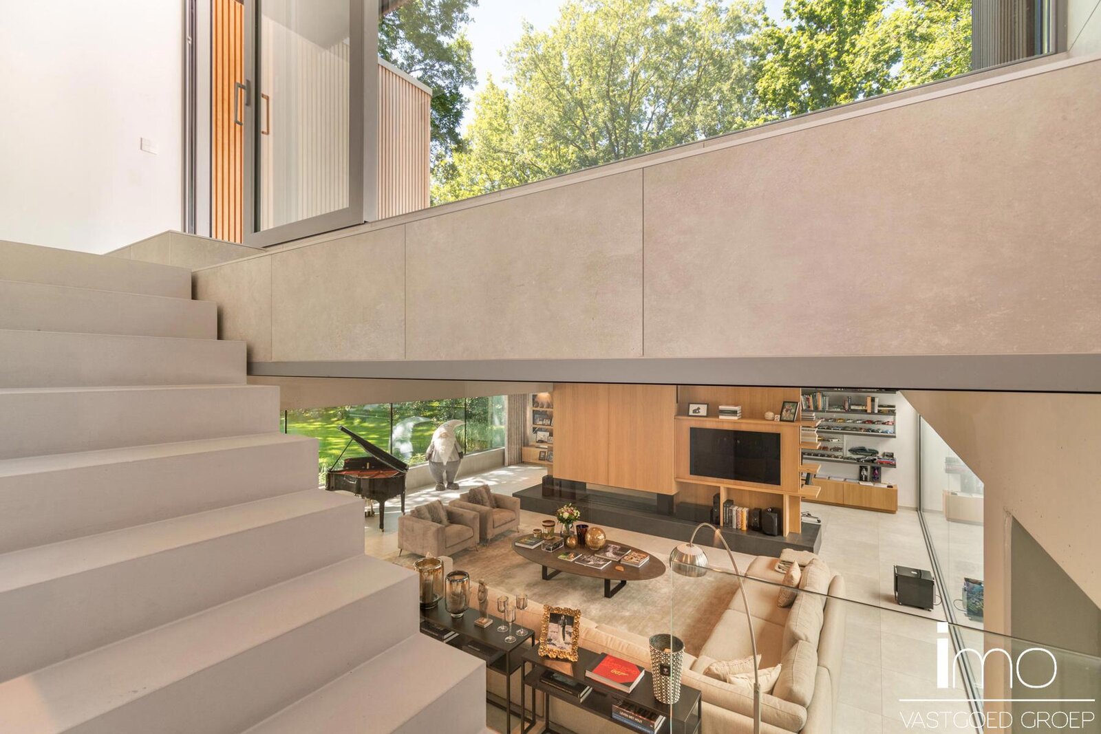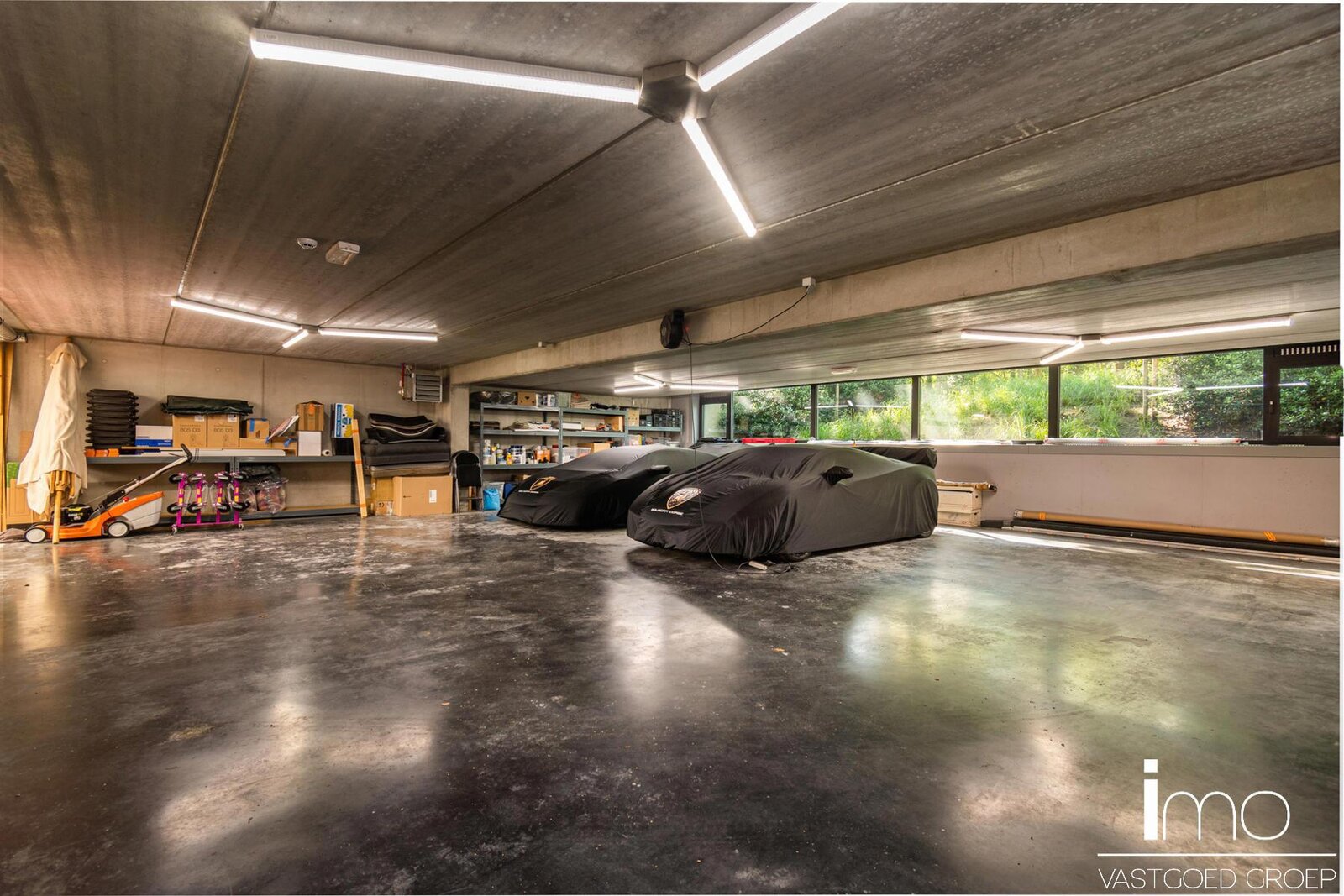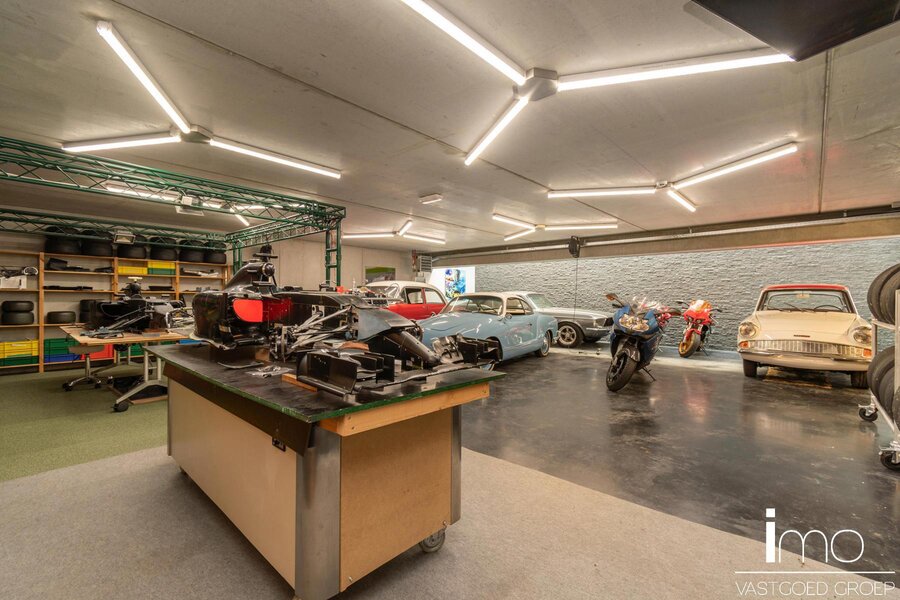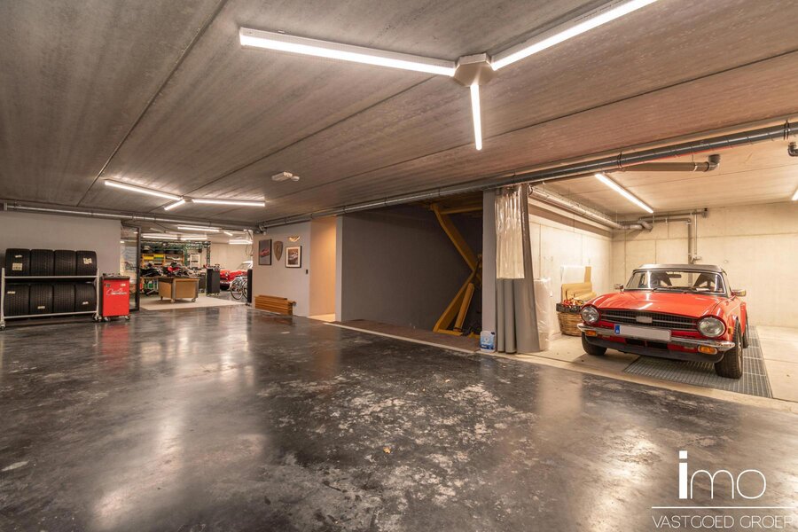 Behalve het bijzondere leefconcept met rijkelijke lichtinval overal op de bovengrondse verdiepingen, heeft de woning nog een ruime kelder dewelke langs binnen en met een autolift langs buiten toegankelijk is. Deze ruimte van 350 m2 kan aangewend worden tot een enorm atelier of een bijzondere stalplaats voor een prachtige autocollectie. Andere invullingen zijn natuurlijk ook mogelijk gezien er natuurlijk licht binnenvalt en er ook op de ondergrondse verdieping ramen voorzien zijn.