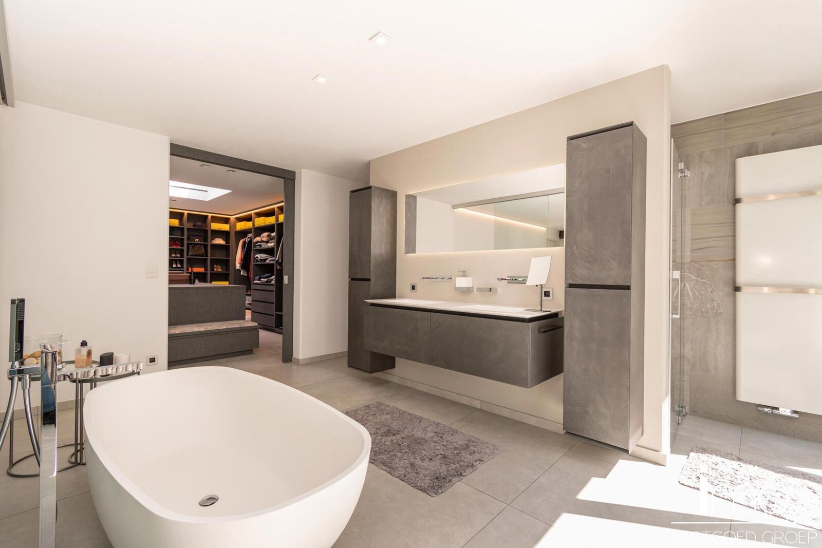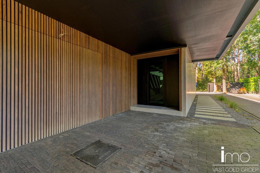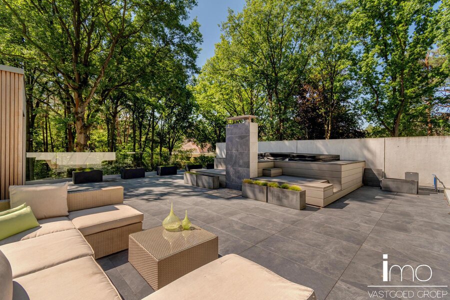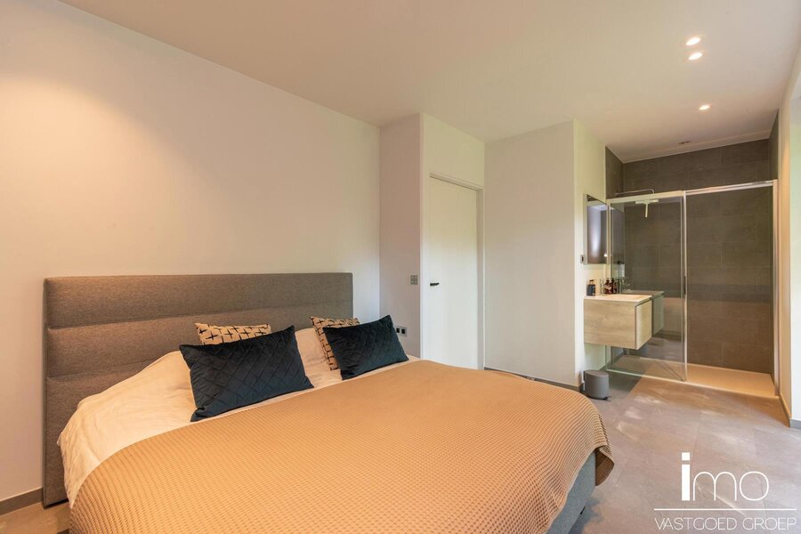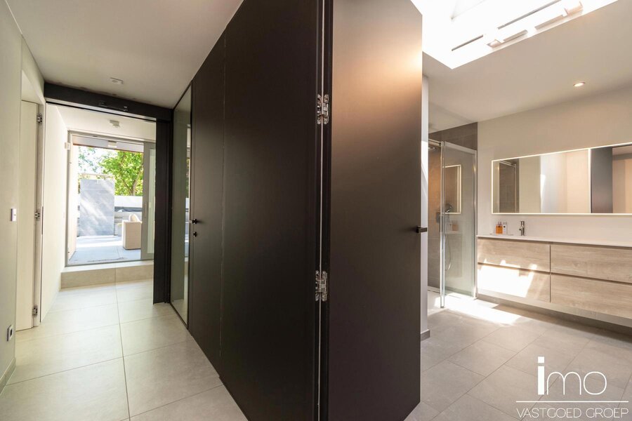 Op de eerste verdieping vinden we een ruime master-bedroom met eigen haard die 180° zicht biedt over de aangelegde tuin. Hierbij werd zowel een bad als douche voorzien met op het dakterras tevens een stoomcabine en whirlpool. Naast de badkamer vinden we een inloopdressing met indirecte verlichting en lichtkoepel voor overdag.