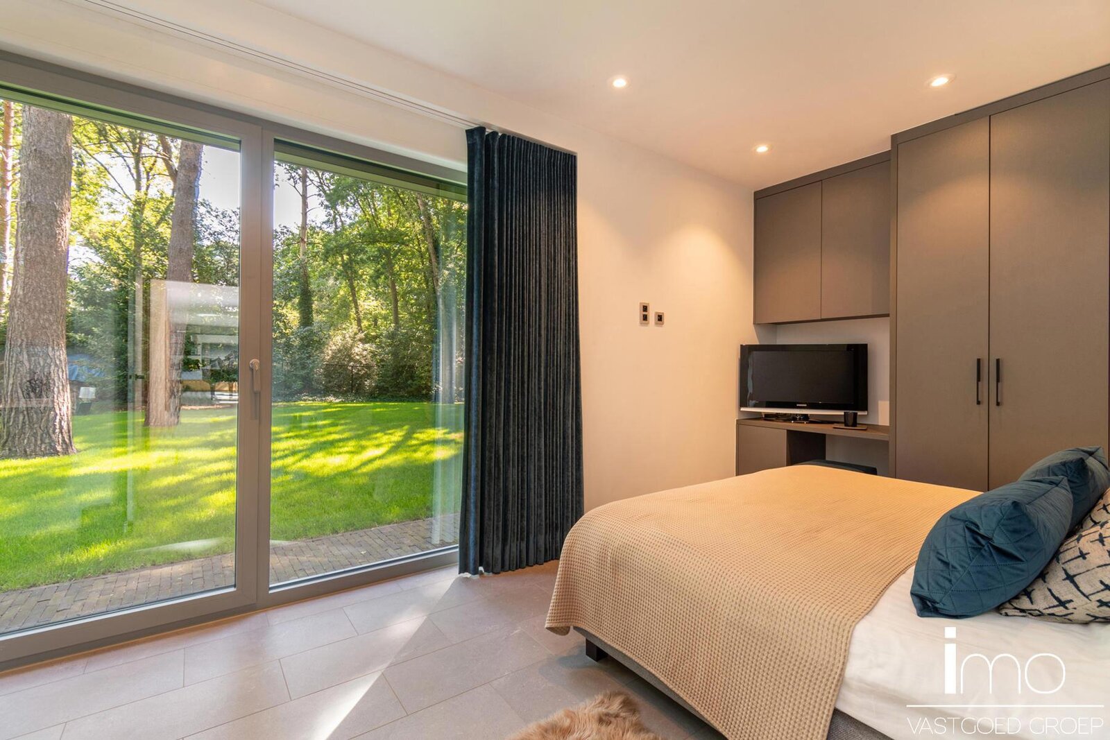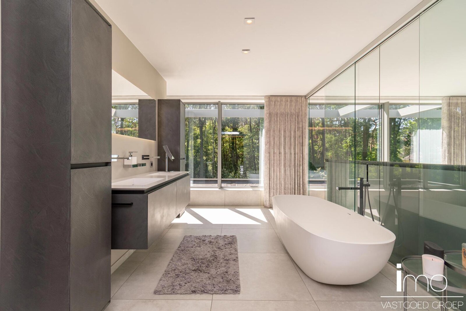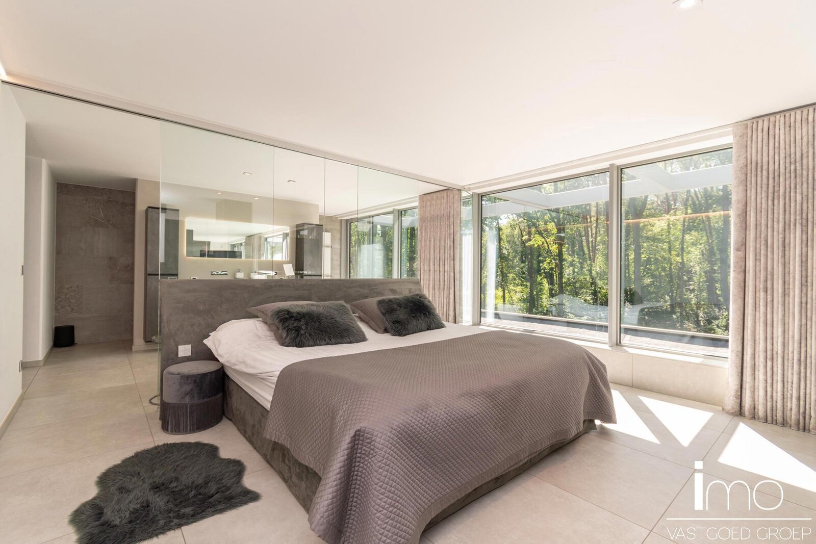 Op de eerste verdieping vinden we een ruime master-bedroom met eigen haard die 180° zicht biedt over de aangelegde tuin. Hierbij werd zowel een bad als douche voorzien met op het dakterras tevens een stoomcabine en whirlpool. Naast de badkamer vinden we een inloopdressing met indirecte verlichting en lichtkoepel voor overdag.