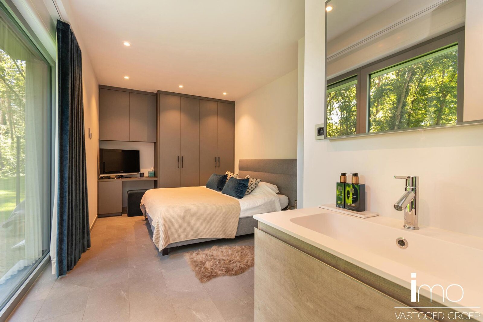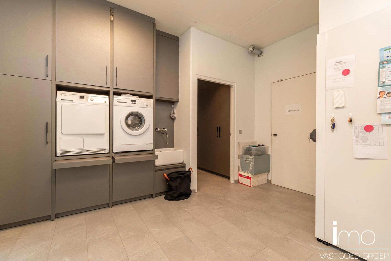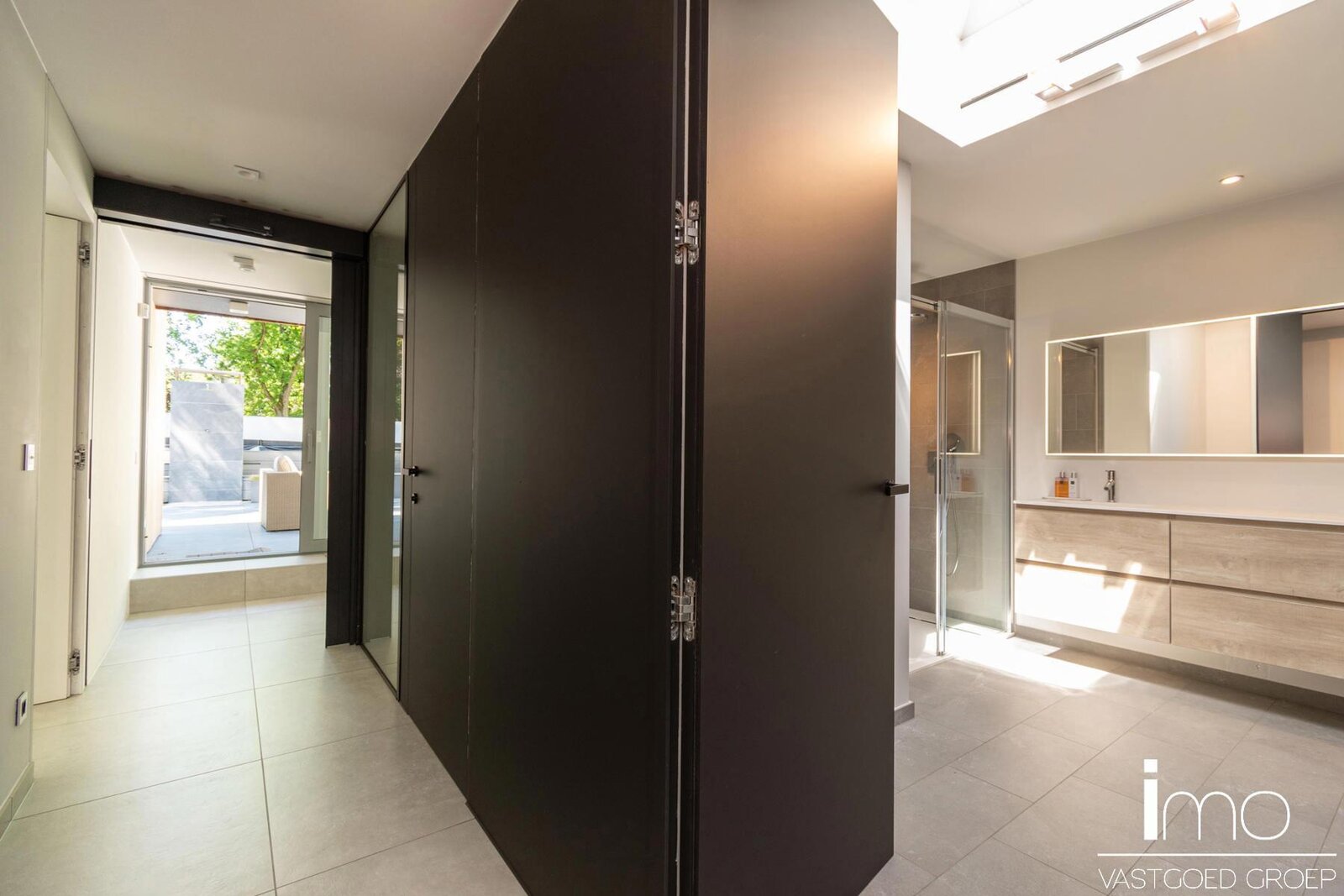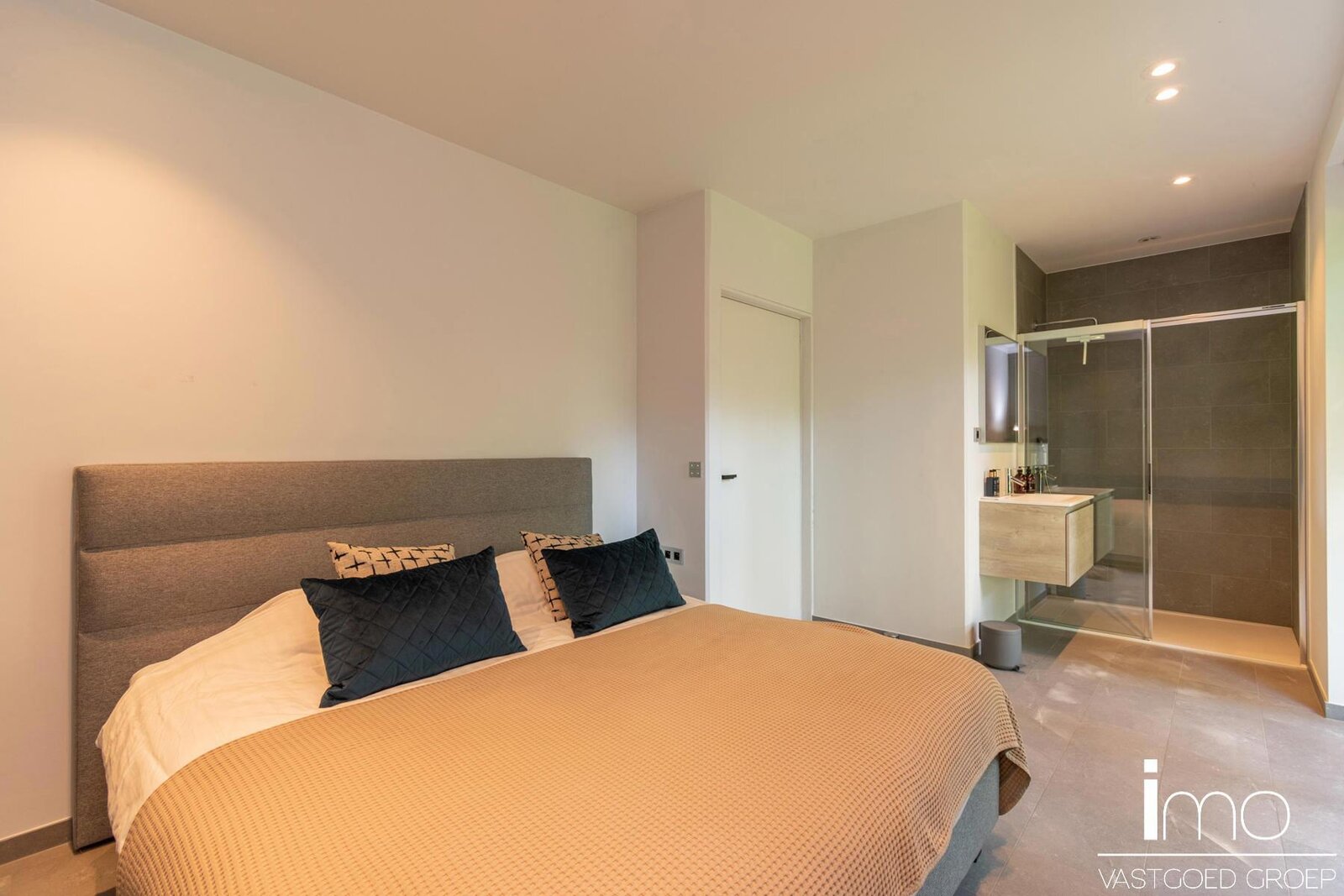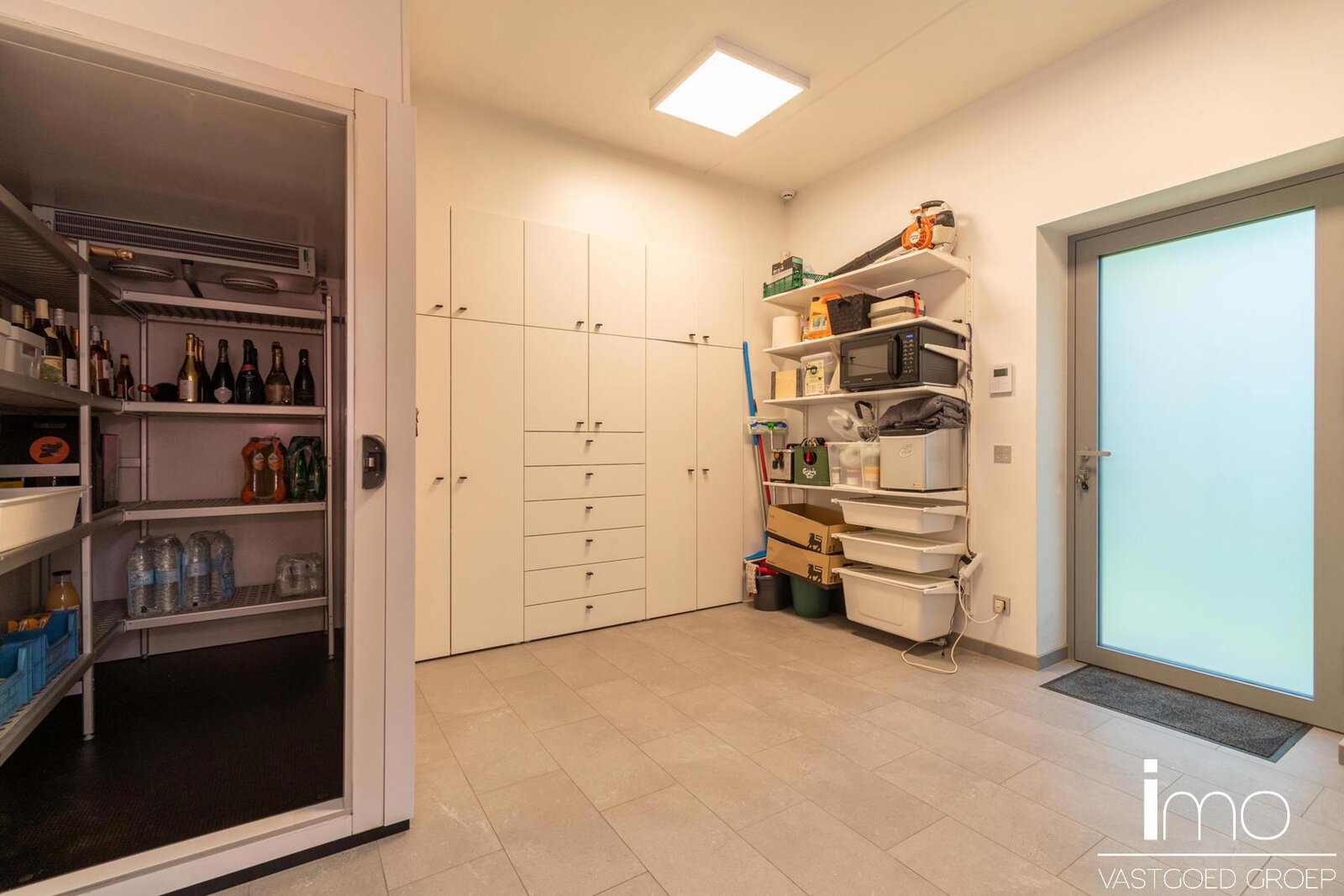 Naadloos weggewerkt in de keukenwand vinden we een deur die toegang biedt tot de gelijkvloerse slaapkamer met eigen badkamer, de berging en wasplaats met koelcel en gelijkvloerse staanplaats voor de wagen.