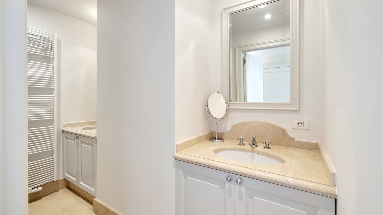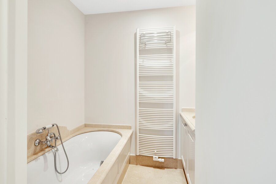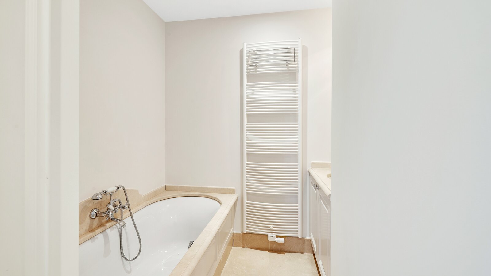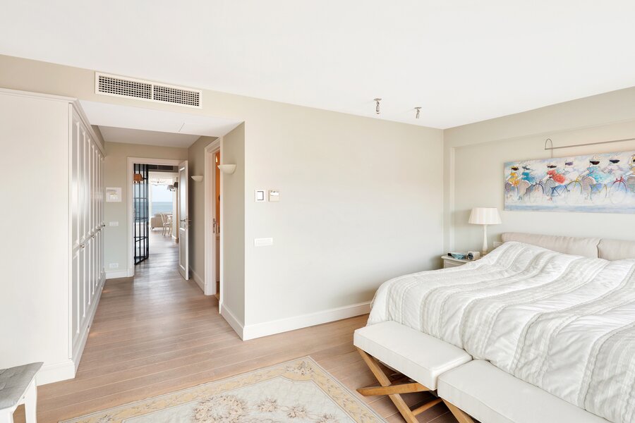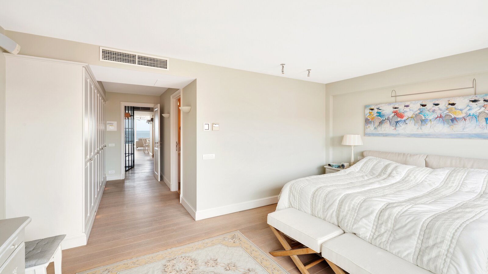 Au calme, à l'arrière de l'appartement, se trouve la spacieuse chambre principale, équipée d'un grand dressing et d'un accès direct à une terrasse ensoleillée offrant des vues dégagées.