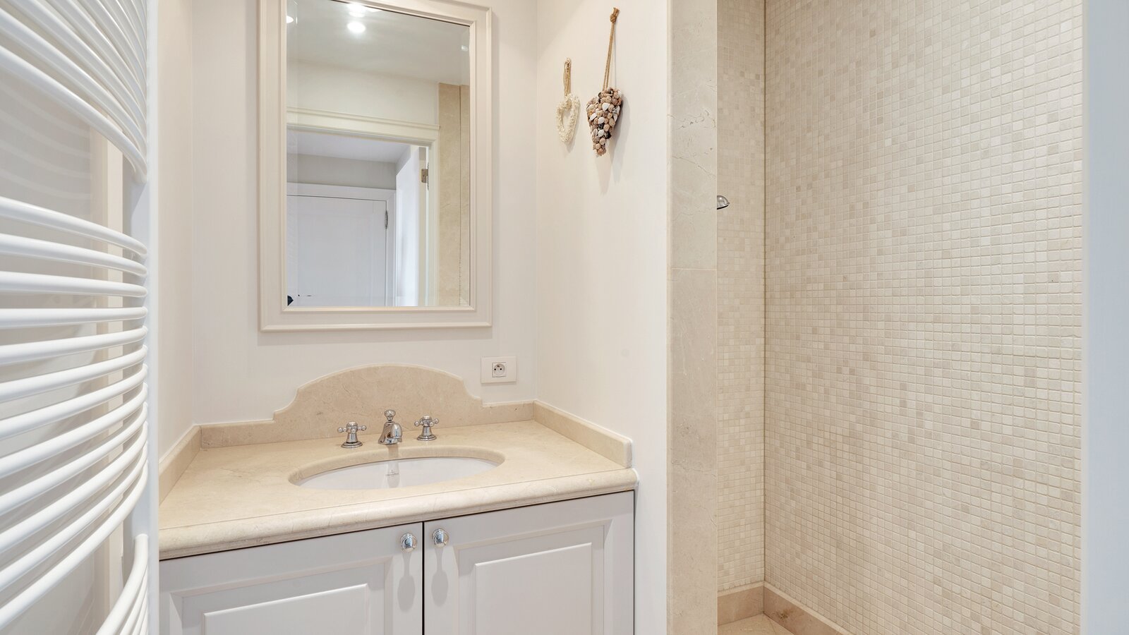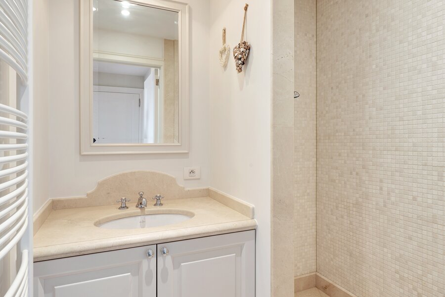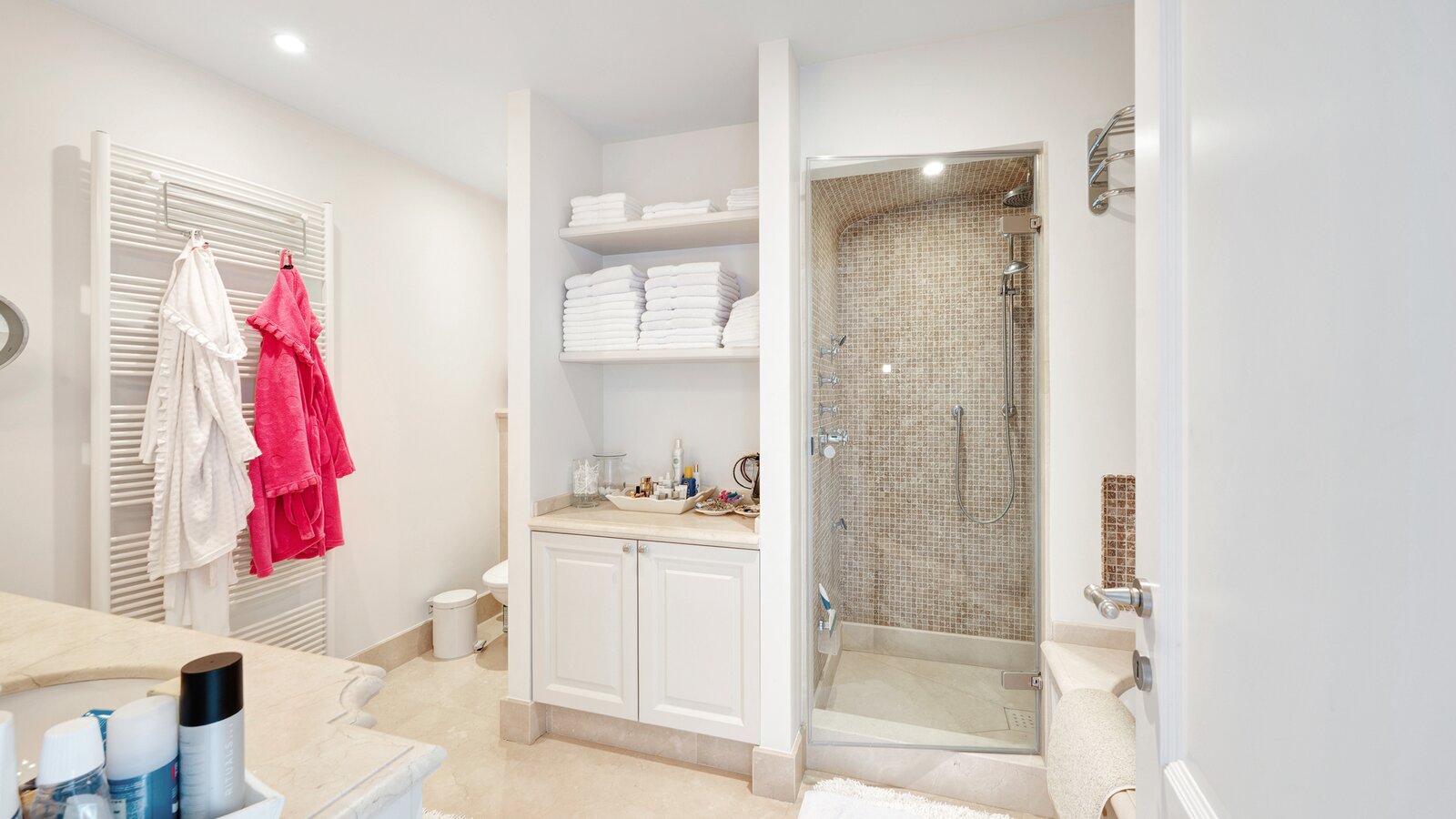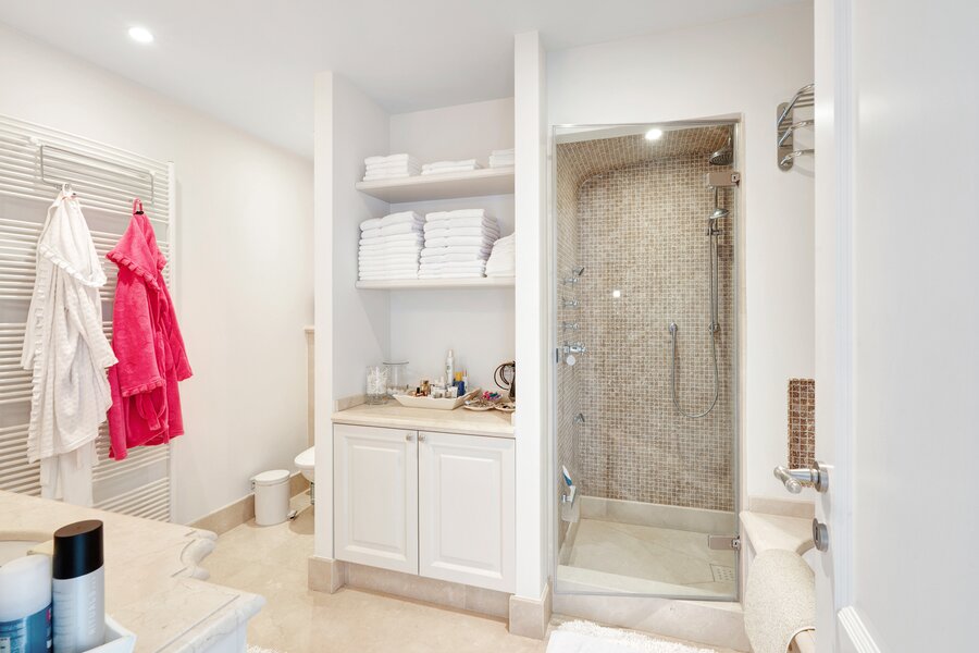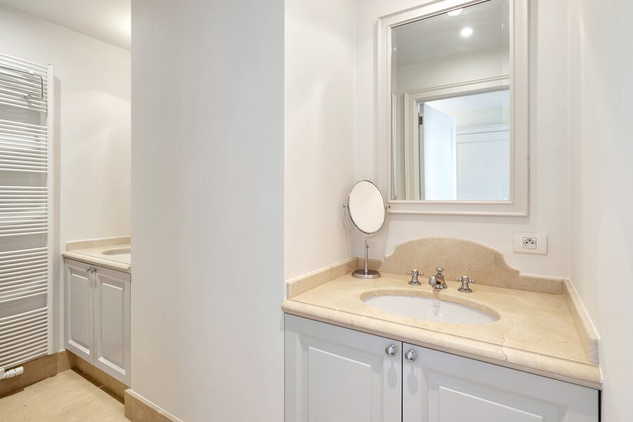 Au calme, à l'arrière de l'appartement, se trouve la spacieuse chambre principale, équipée d'un grand dressing et d'un accès direct à une terrasse ensoleillée offrant des vues dégagées.