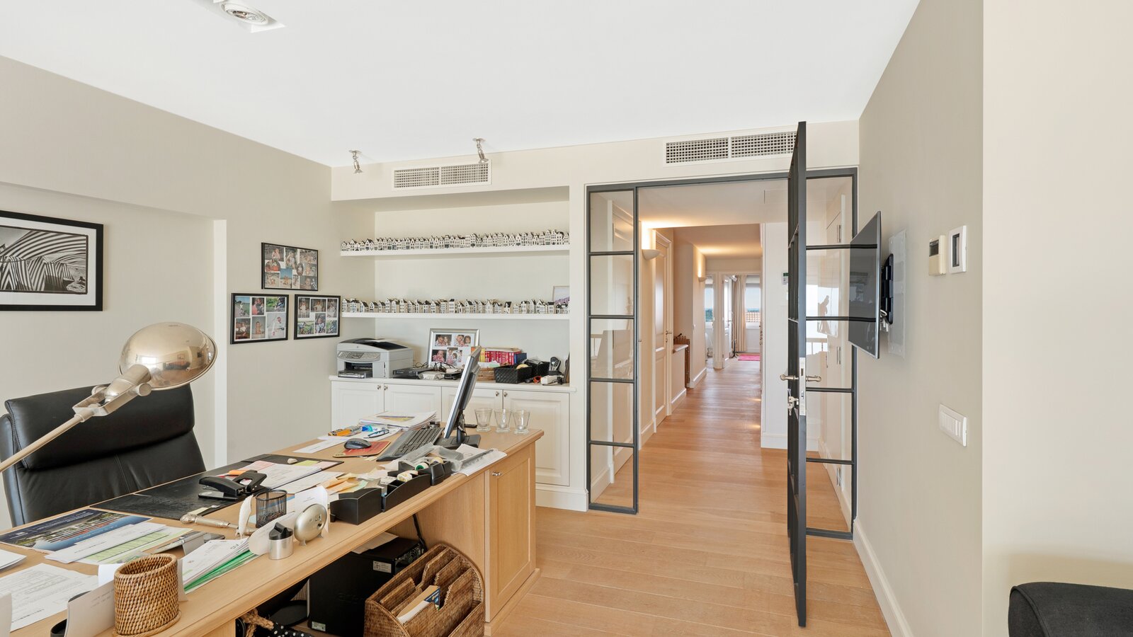 La mezzanine, accessible par un élégant escalier, offre un espace bureau confortable avec des placards et des vues sur la mer. Vous y trouverez également des toilettes séparées, des rangements supplémentaires et une buanderie fonctionnelle. À l'arrière, il y a deux chambres de taille normale, chacune avec des armoires encastrées et une salle de bains ou une salle de douche en-suite.