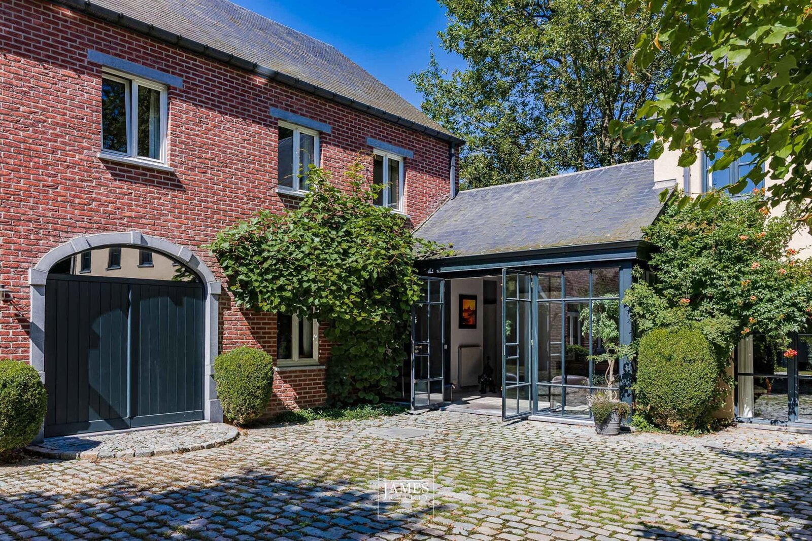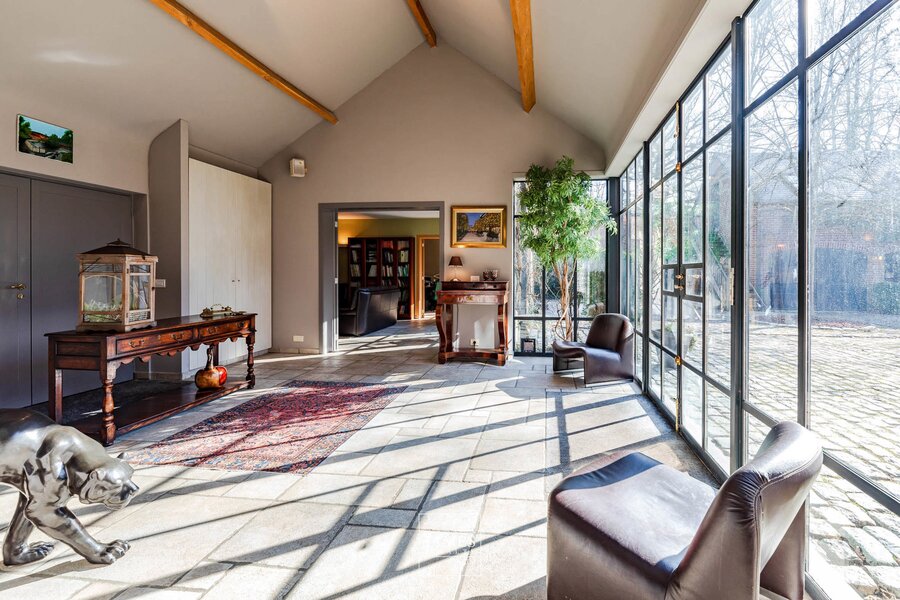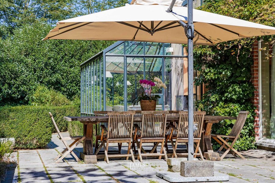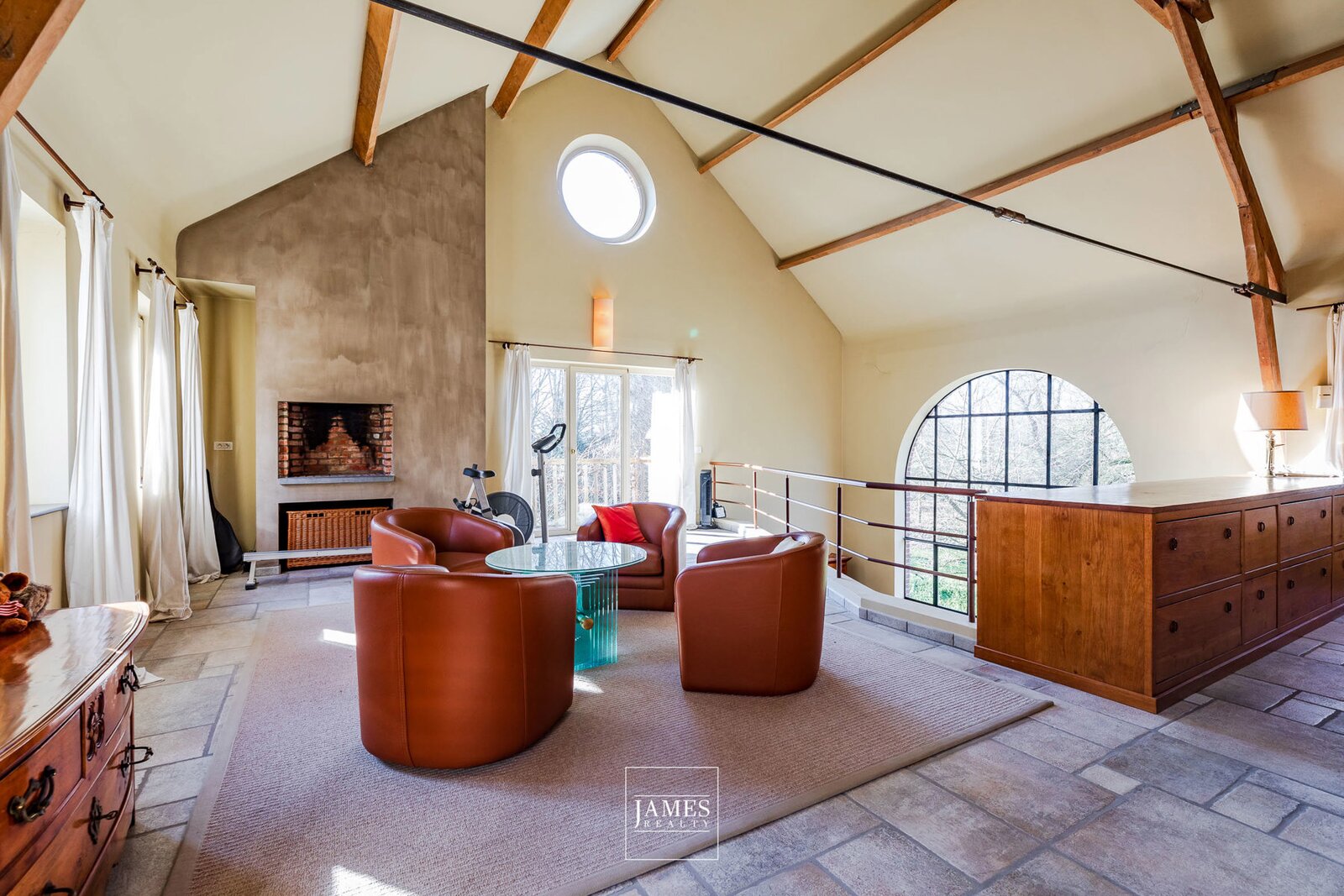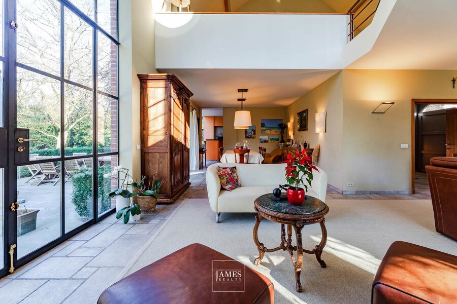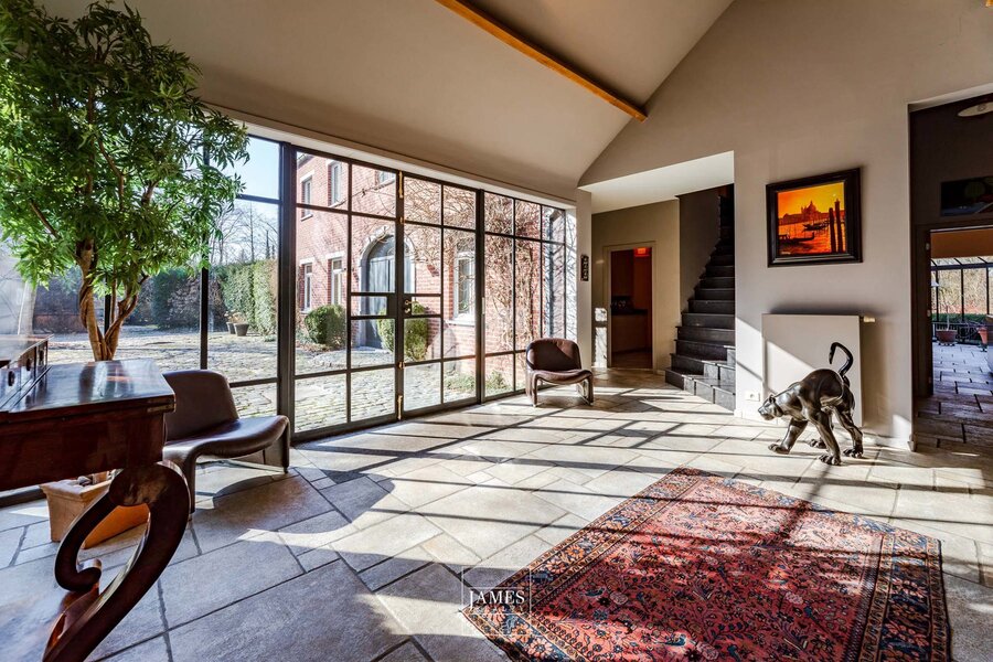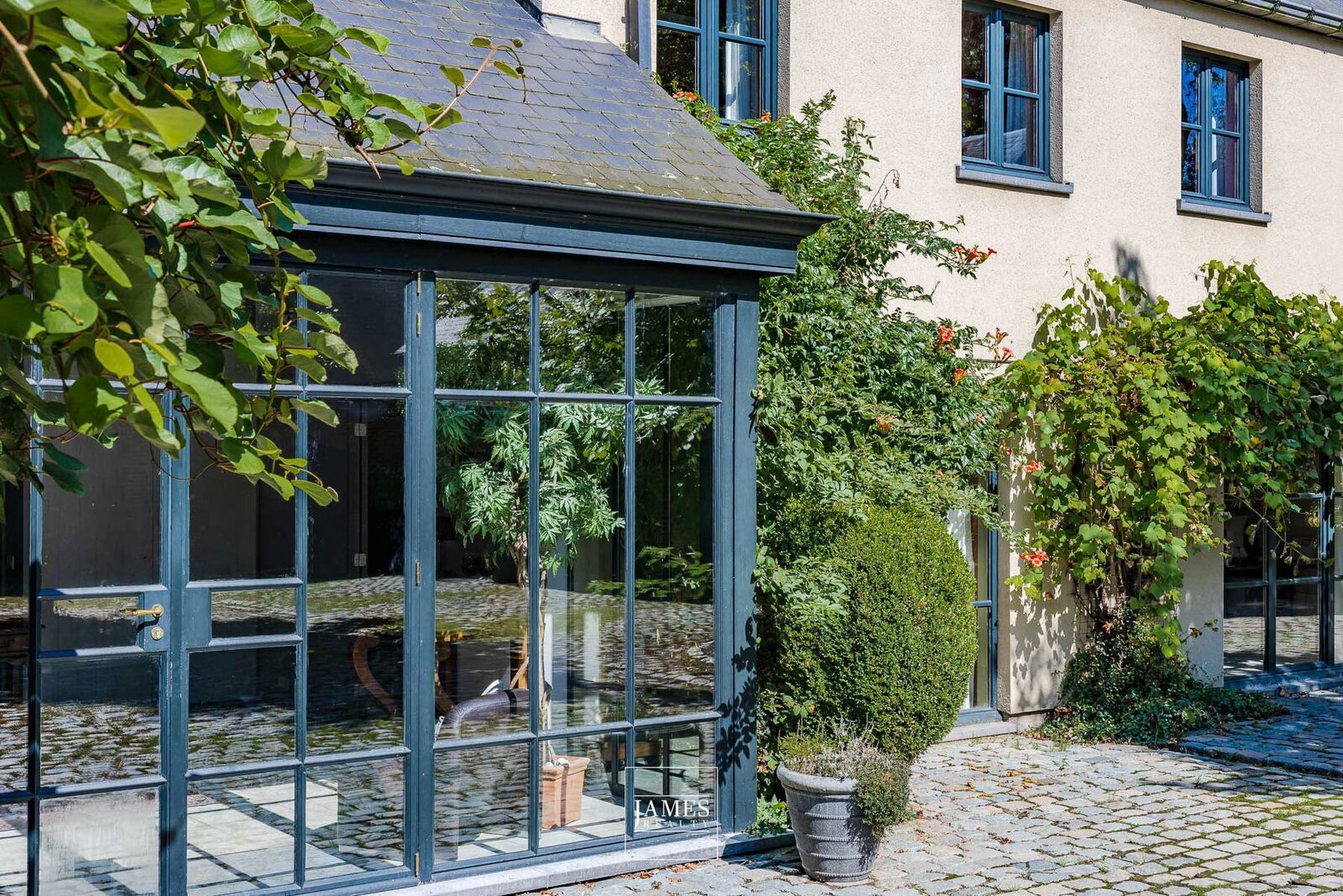 Le bâtiment principal de cette propriété d'exception offre un aménagement spacieux et luxueux, idéal pour une vie familiale raffinée et l'organisation de réceptions. En entrant, un hall d'entrée élégant avec vestiaire et toilettes pour invités vous accueille. Les réceptions se composent d'un vaste salon doté d'un feu ouvert, avec un accès direct à la terrasse, en suite avec la salle à manger. La cuisine principale, équipée d'une arrière-cuisine, s'ouvre sur une véranda lumineuse avec un feu ouvert à cassette et un accès au jardin. Une seconde cuisine, accompagnée d'une buanderie, se trouve à l'arrière du bâtiment et dispose d'une entrée privative dédiée aux réceptions. Le sous-sol offre plusieurs caves, une chaufferie, et un système de filtration pour la piscine.