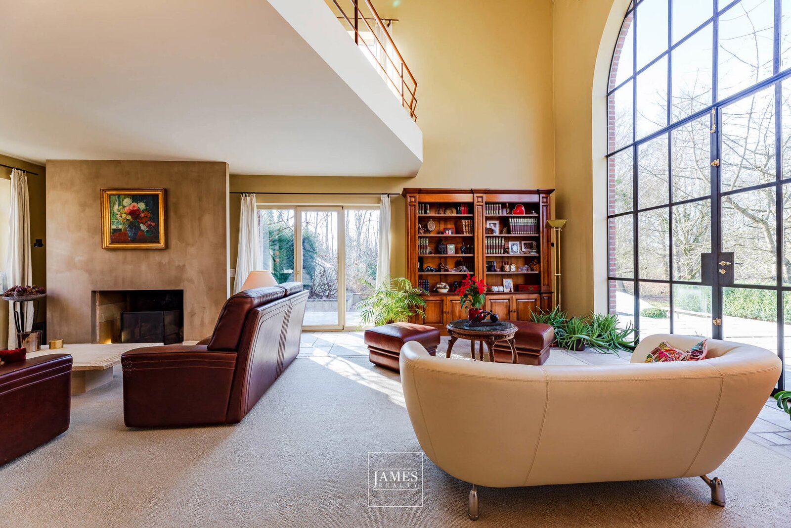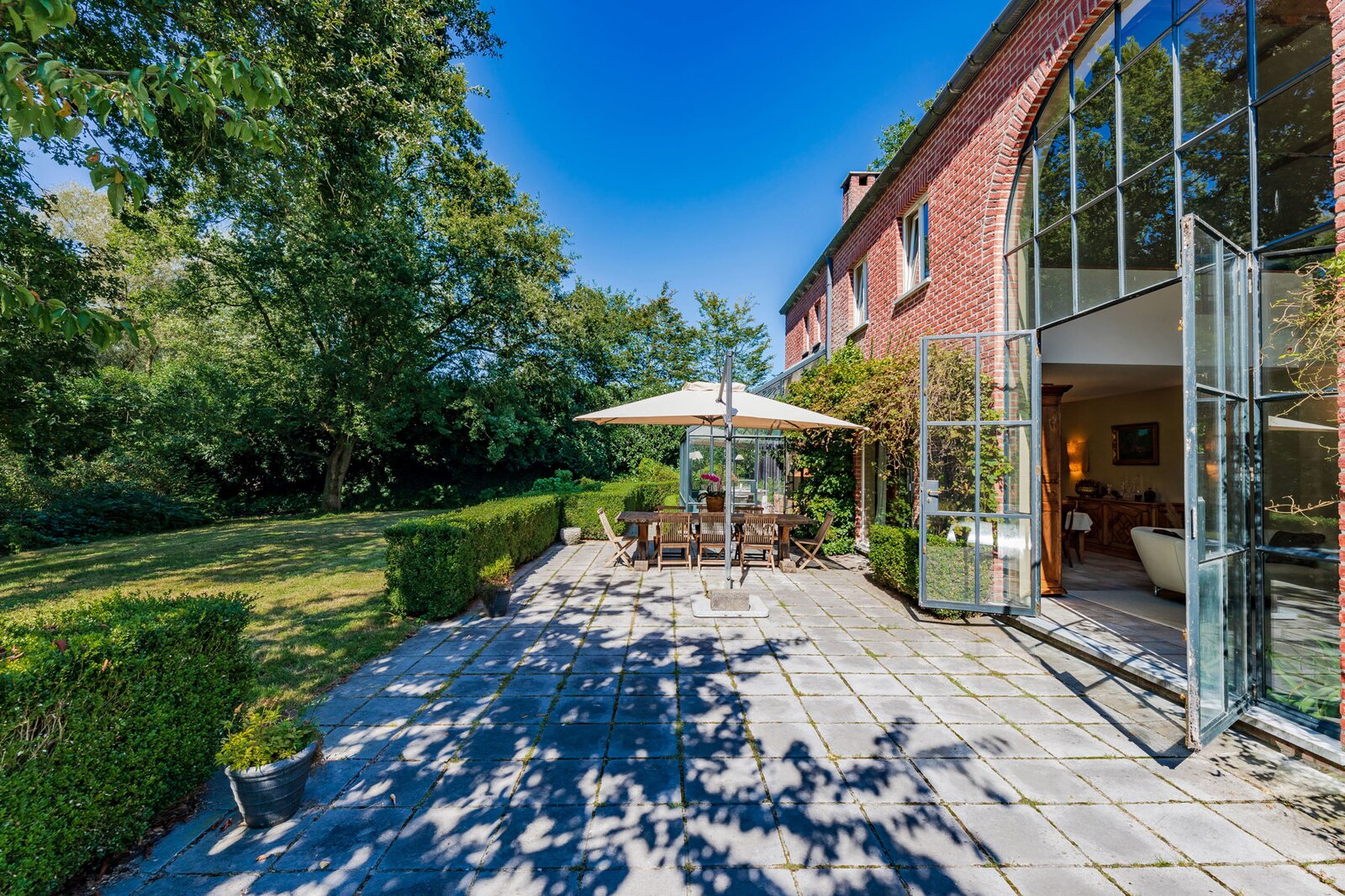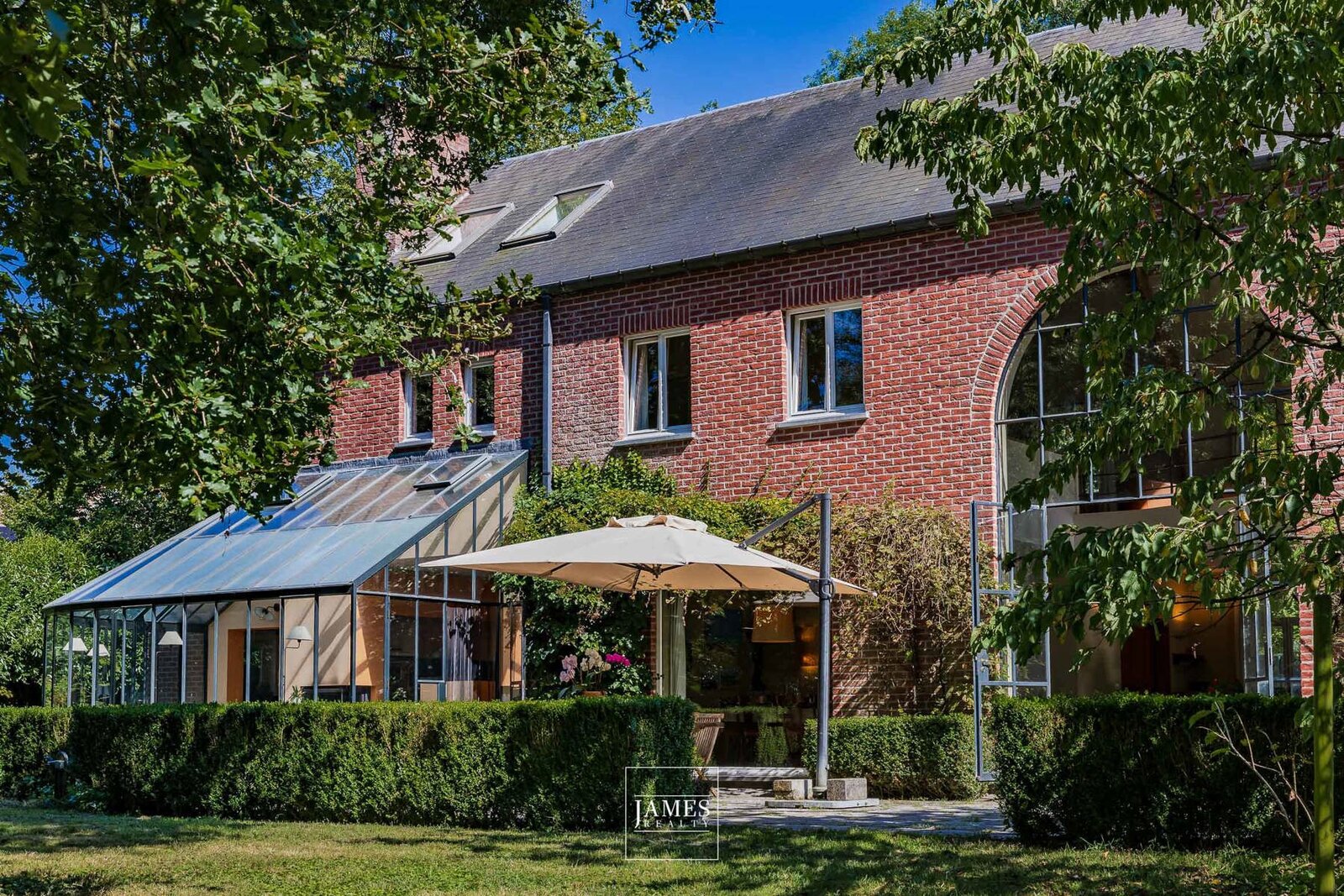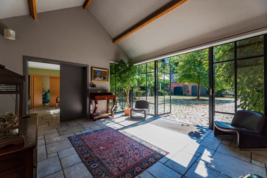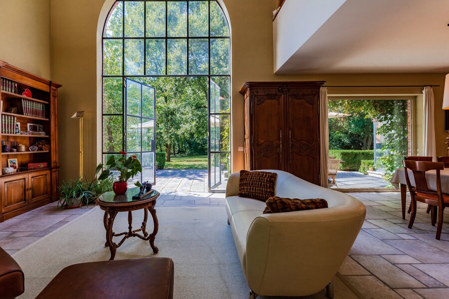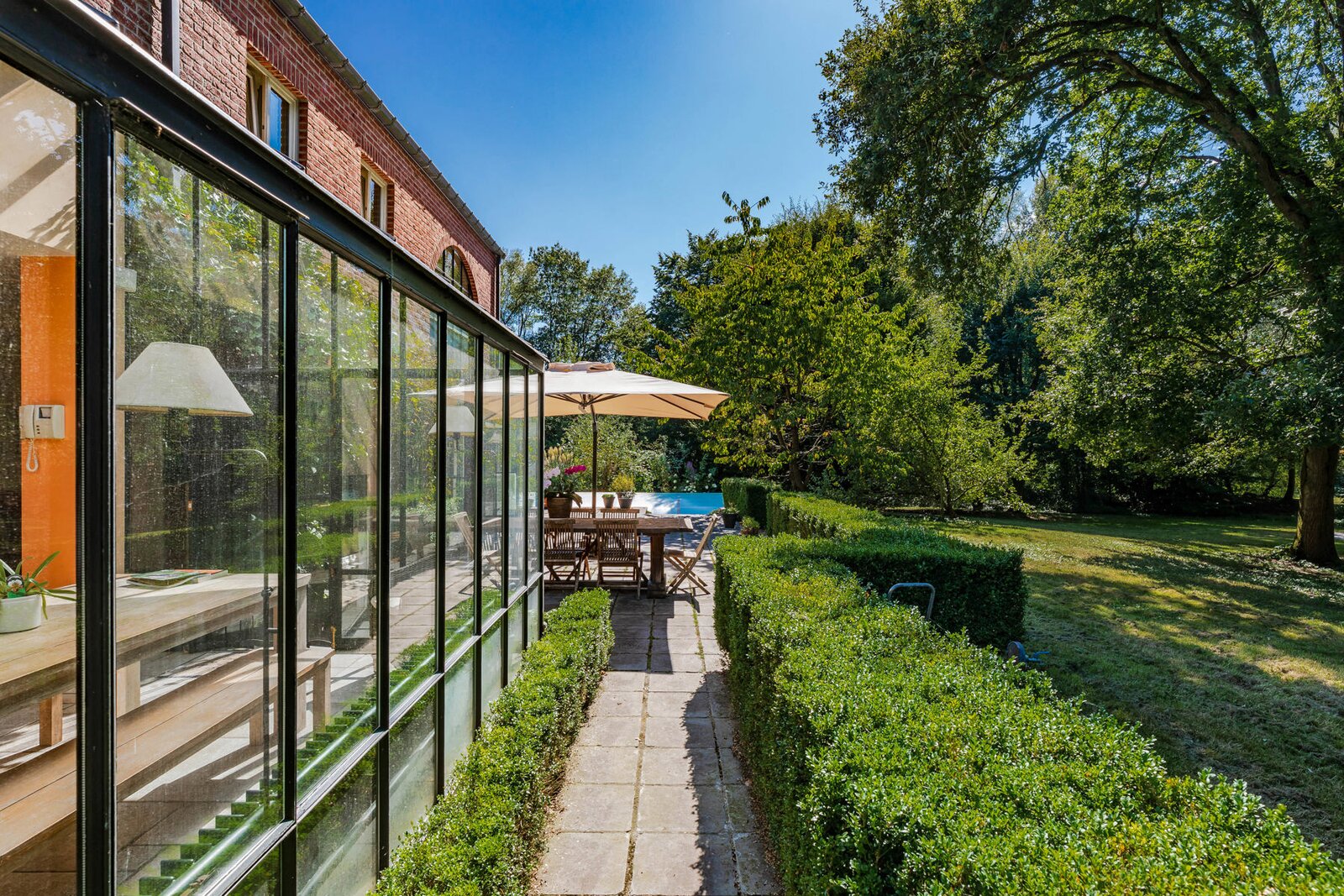 Le bâtiment principal de cette propriété d'exception offre un aménagement spacieux et luxueux, idéal pour une vie familiale raffinée et l'organisation de réceptions. En entrant, un hall d'entrée élégant avec vestiaire et toilettes pour invités vous accueille. Les réceptions se composent d'un vaste salon doté d'un feu ouvert, avec un accès direct à la terrasse, en suite avec la salle à manger. La cuisine principale, équipée d'une arrière-cuisine, s'ouvre sur une véranda lumineuse avec un feu ouvert à cassette et un accès au jardin. Une seconde cuisine, accompagnée d'une buanderie, se trouve à l'arrière du bâtiment et dispose d'une entrée privative dédiée aux réceptions. Le sous-sol offre plusieurs caves, une chaufferie, et un système de filtration pour la piscine.