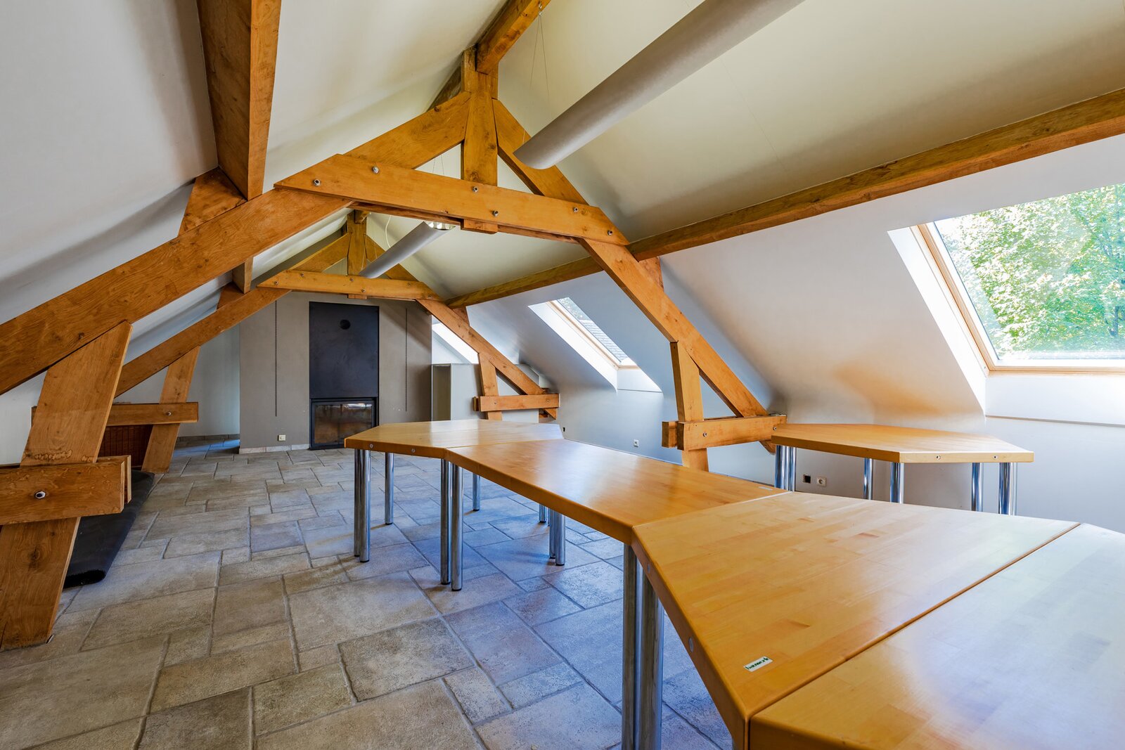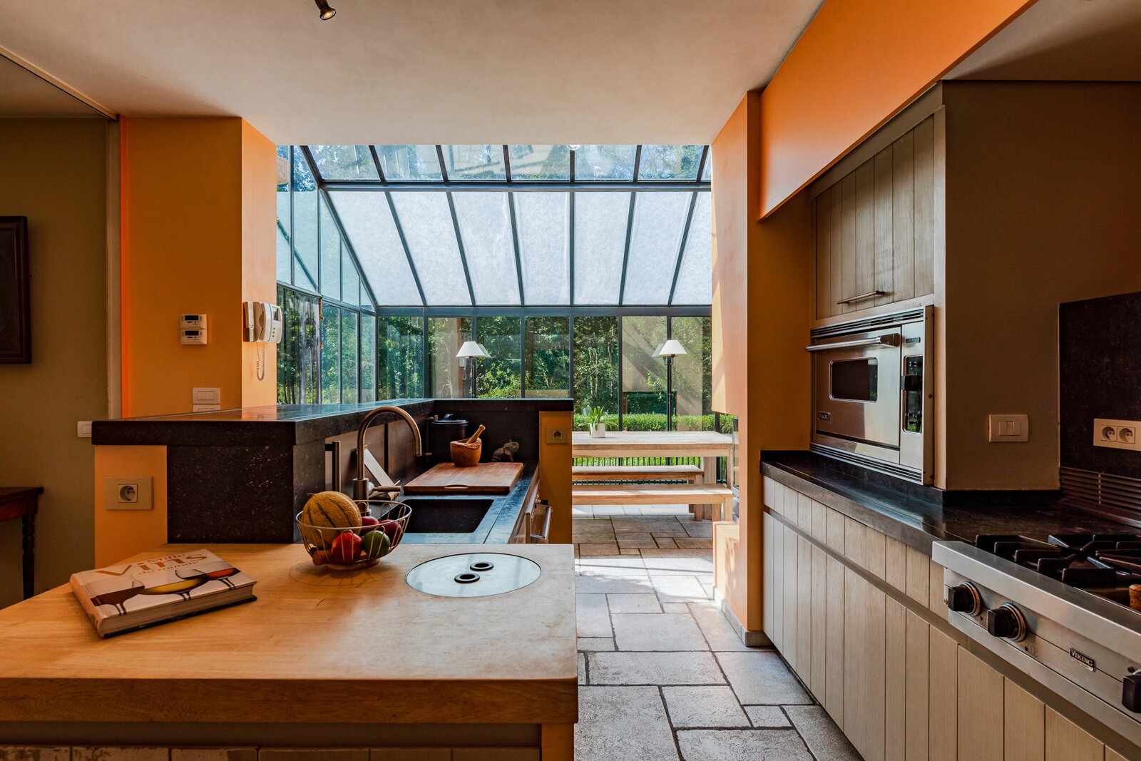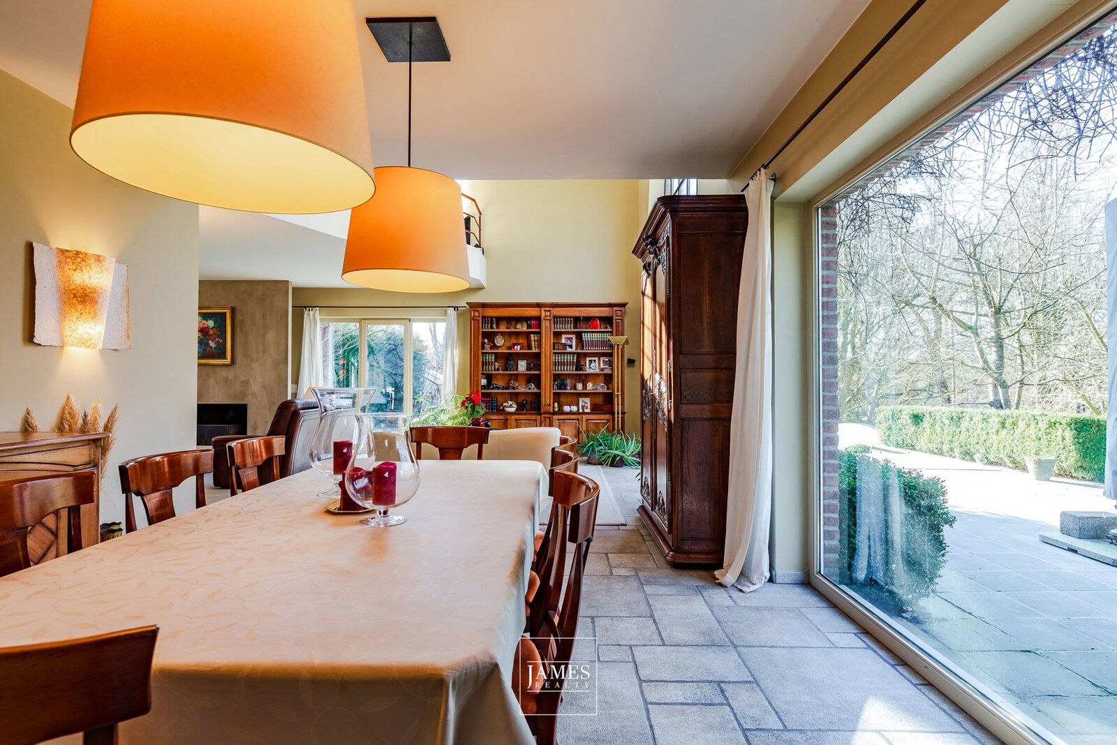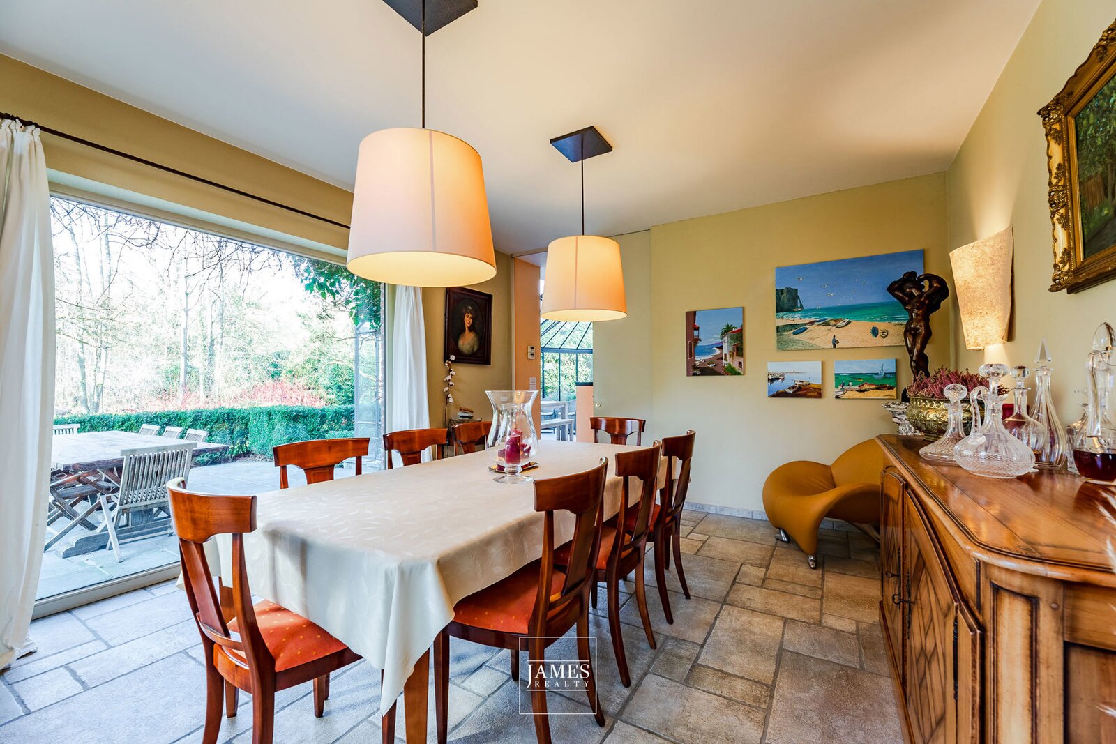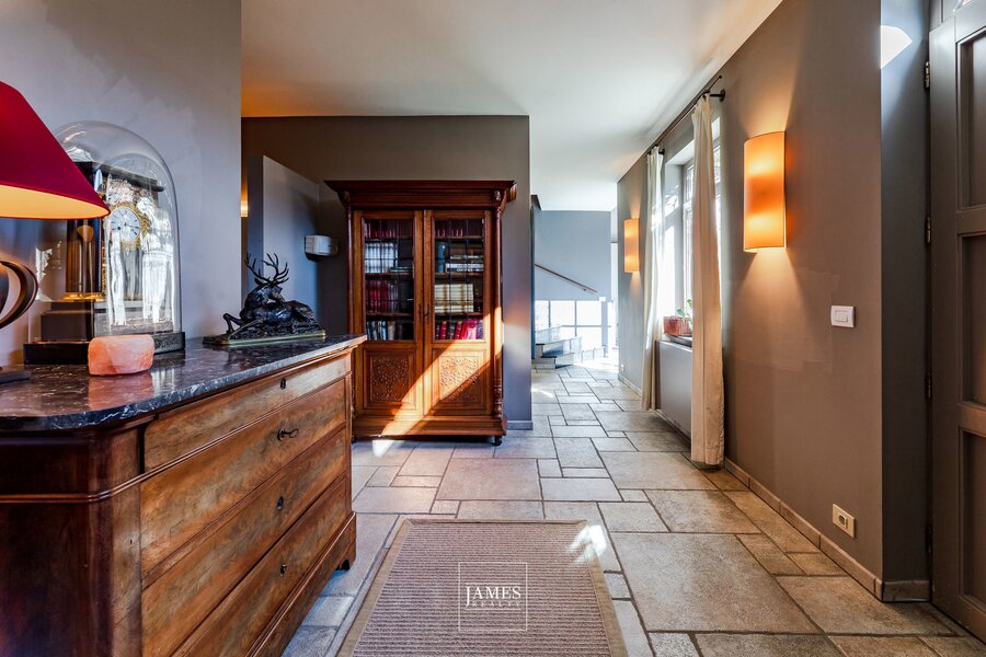 Le bâtiment principal de cette propriété d'exception offre un aménagement spacieux et luxueux, idéal pour une vie familiale raffinée et l'organisation de réceptions. En entrant, un hall d'entrée élégant avec vestiaire et toilettes pour invités vous accueille. Les réceptions se composent d'un vaste salon doté d'un feu ouvert, avec un accès direct à la terrasse, en suite avec la salle à manger. La cuisine principale, équipée d'une arrière-cuisine, s'ouvre sur une véranda lumineuse avec un feu ouvert à cassette et un accès au jardin. Une seconde cuisine, accompagnée d'une buanderie, se trouve à l'arrière du bâtiment et dispose d'une entrée privative dédiée aux réceptions. Le sous-sol offre plusieurs caves, une chaufferie, et un système de filtration pour la piscine.