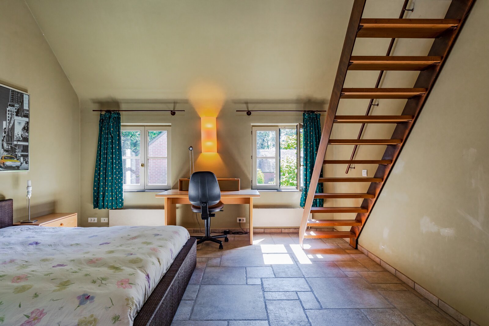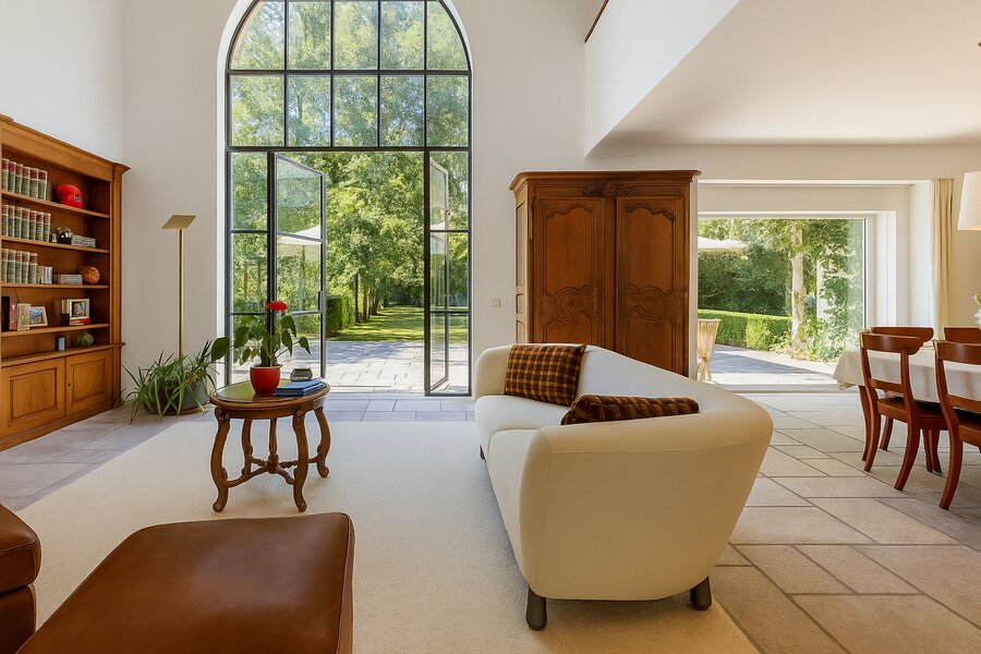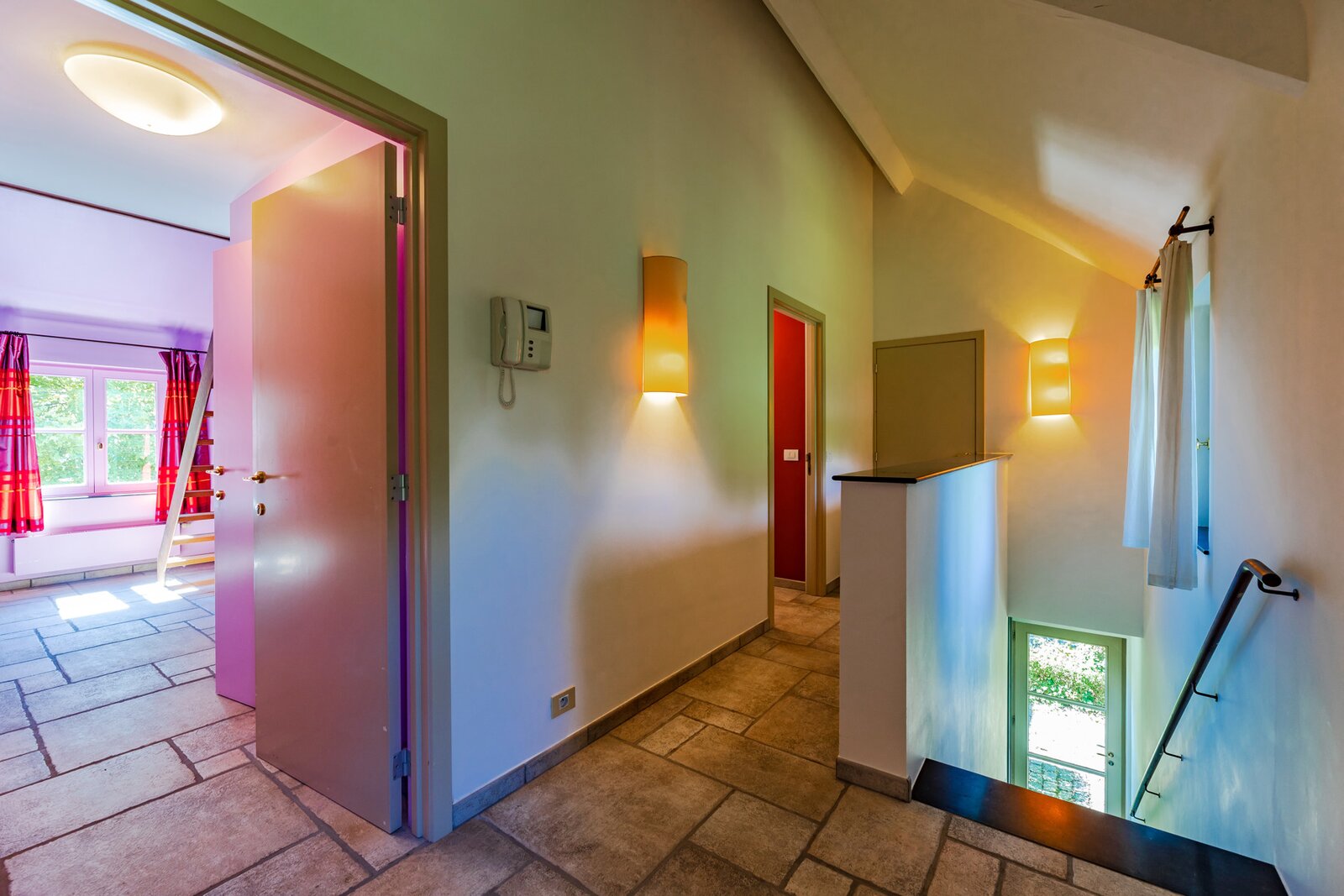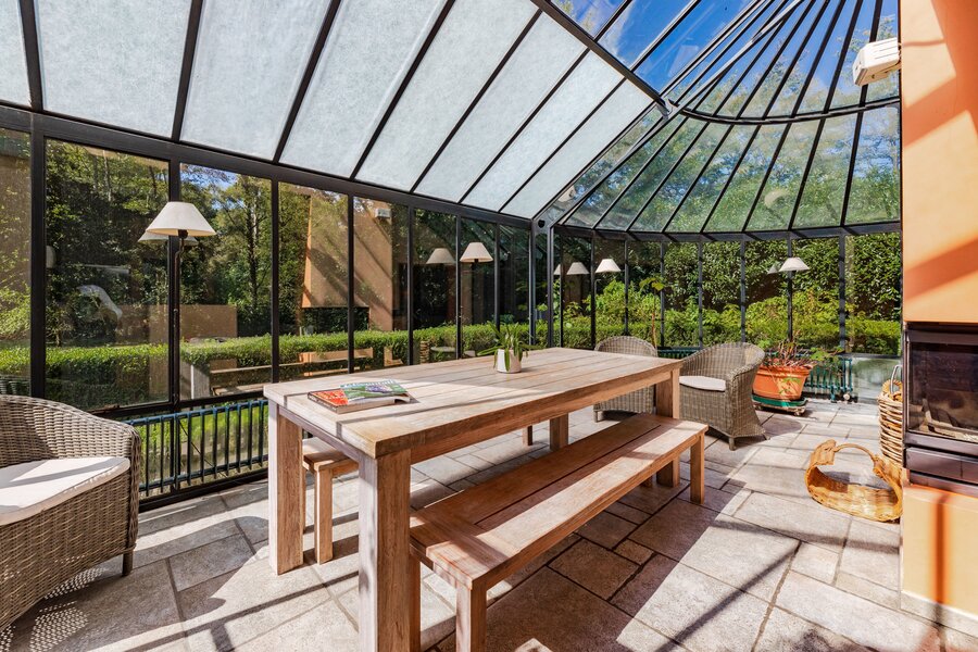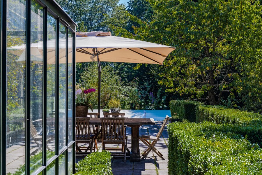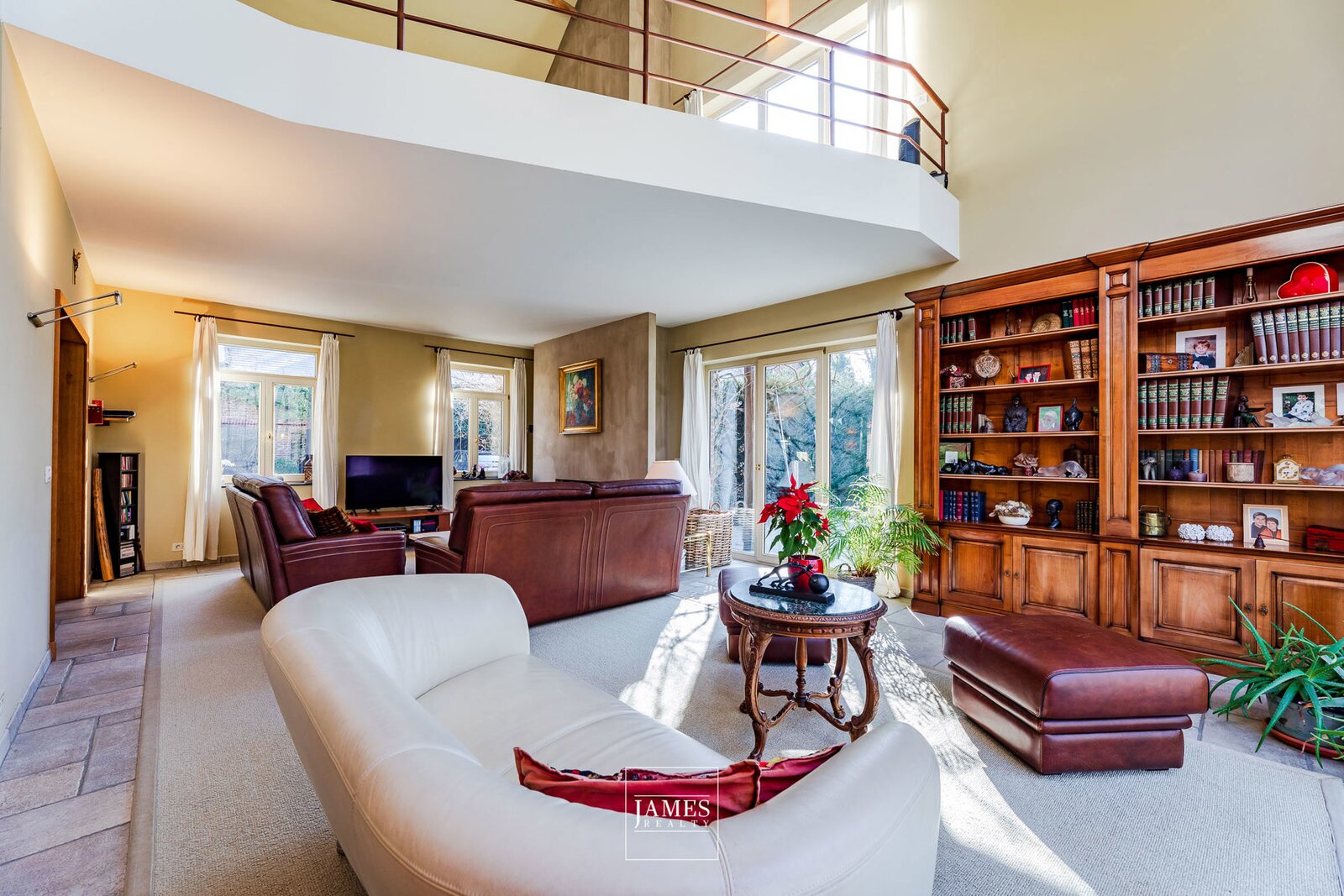 Le bâtiment principal de cette propriété d'exception offre un aménagement spacieux et luxueux, idéal pour une vie familiale raffinée et l'organisation de réceptions. En entrant, un hall d'entrée élégant avec vestiaire et toilettes pour invités vous accueille. Les réceptions se composent d'un vaste salon doté d'un feu ouvert, avec un accès direct à la terrasse, en suite avec la salle à manger. La cuisine principale, équipée d'une arrière-cuisine, s'ouvre sur une véranda lumineuse avec un feu ouvert à cassette et un accès au jardin. Une seconde cuisine, accompagnée d'une buanderie, se trouve à l'arrière du bâtiment et dispose d'une entrée privative dédiée aux réceptions. Le sous-sol offre plusieurs caves, une chaufferie, et un système de filtration pour la piscine.