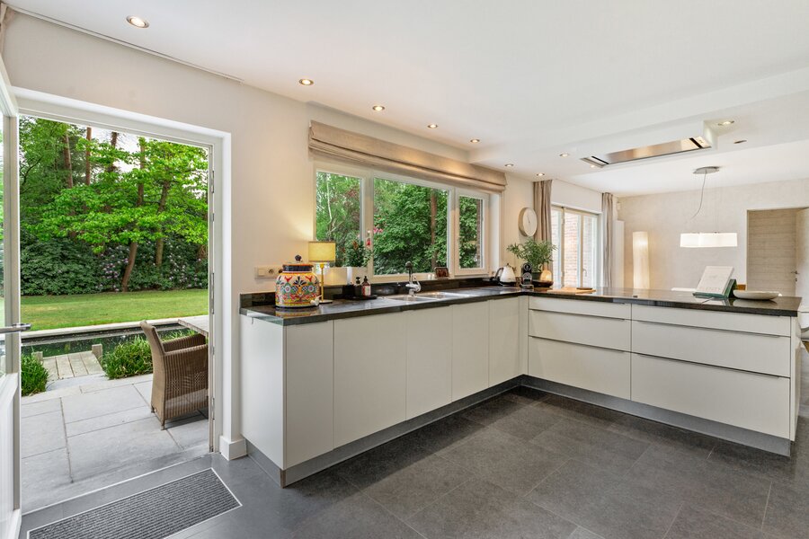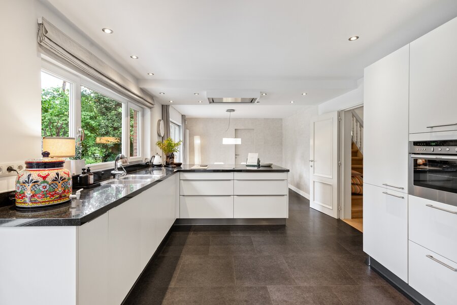 De volledig uitgeruste keuken beschikt over een granieten werkblad en is voorzien van een dubbele spoelbak, vaatwasser, inductiekookplaat, dampkap, oven, combi-oven en een ruime eethoek. Vanuit de keuken is er toegang tot een tweede hal met aparte dienstingang, extra toilet en toegang tot een berging/wasplaats.