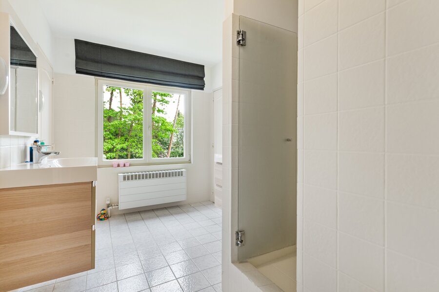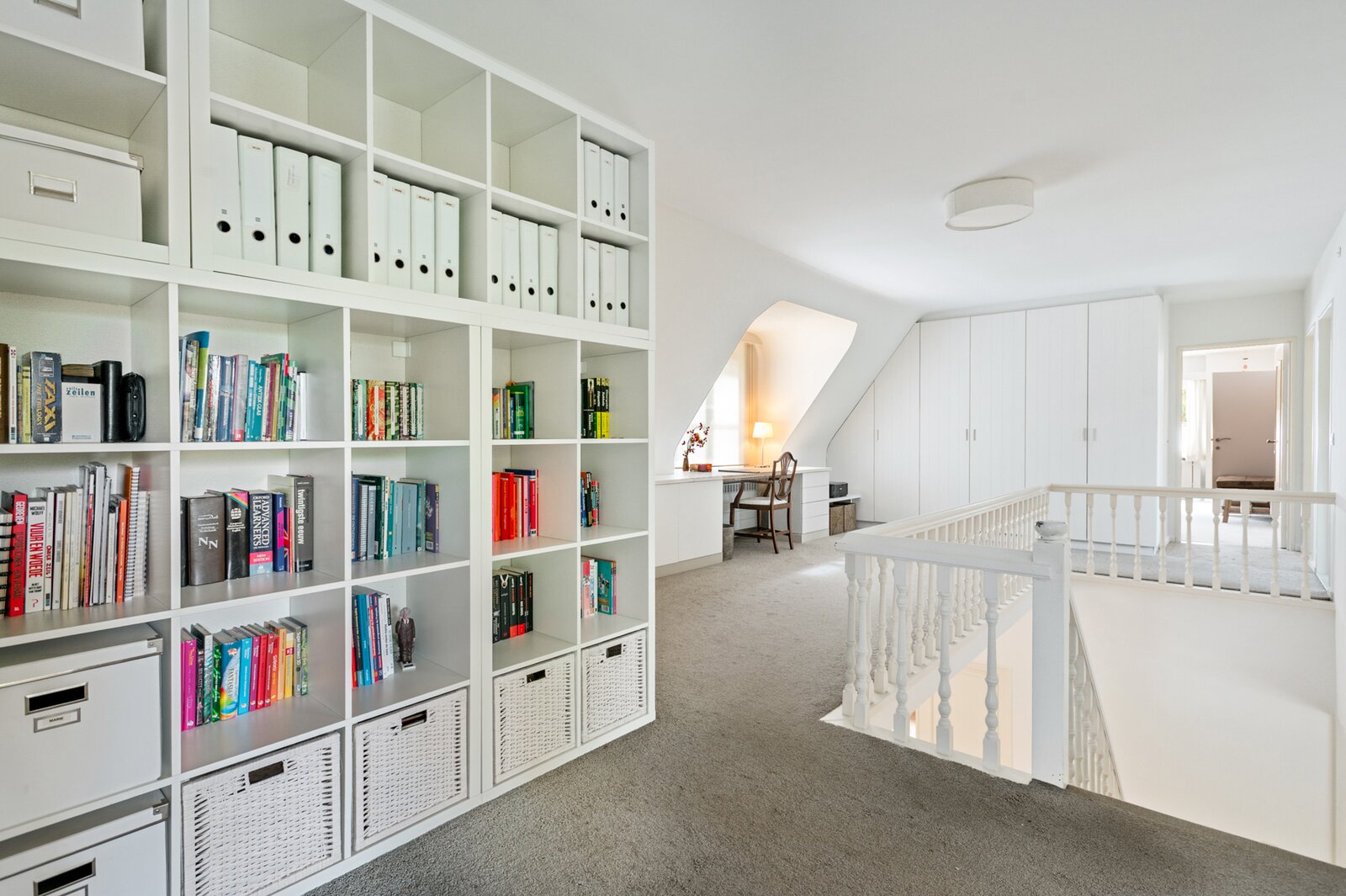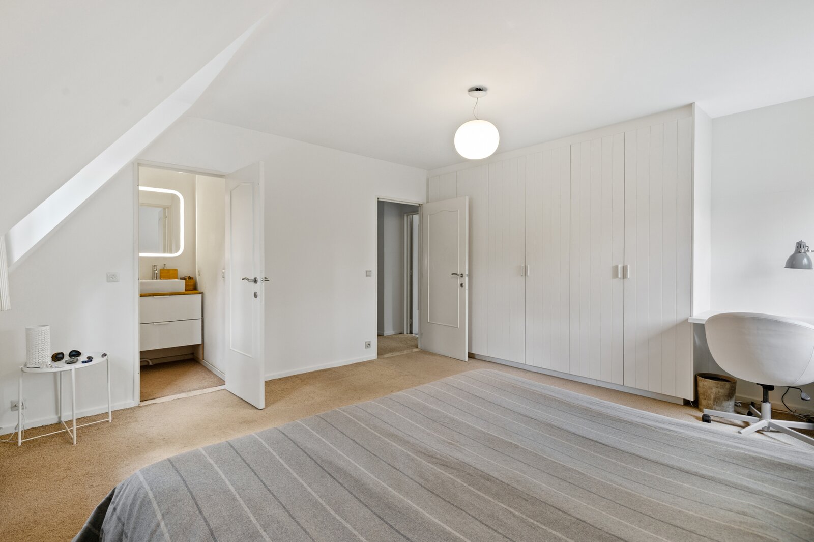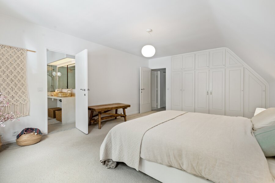 De ruime overloop geeft toegang tot vijf volwaardige slaapkamers. De hoofdslaapkamer beschikt over een badkamer en suite, ingericht met een dubbele lavabo, ligbad en inloopdouche. Twee slaapkamers delen een communicerende douchekamer met dubbele lavabo en douche. Het nachttoilet bevindt zich op de gang. De bergzolder is bereikbaar via een uitschuifbare vlizotrap.