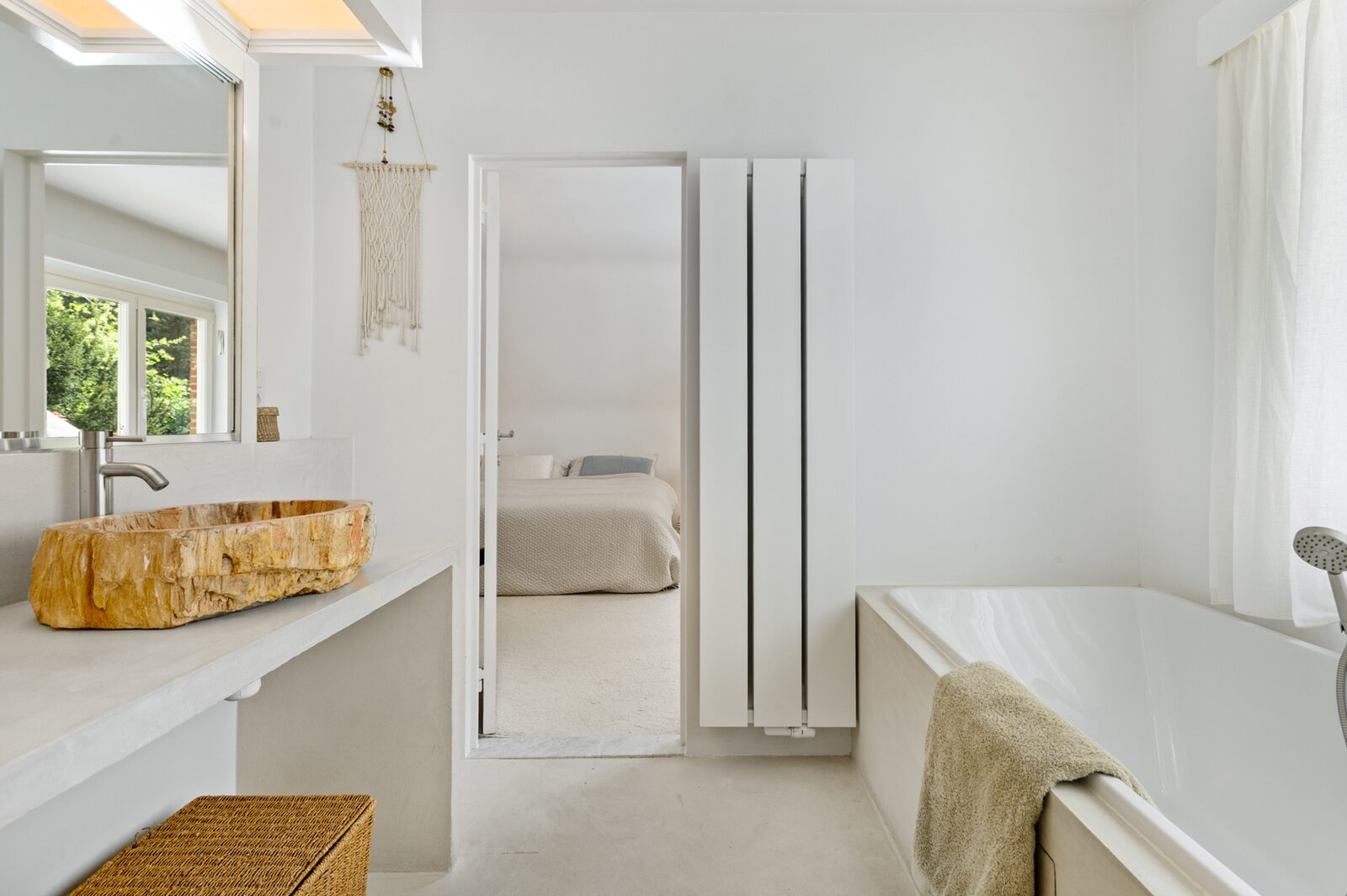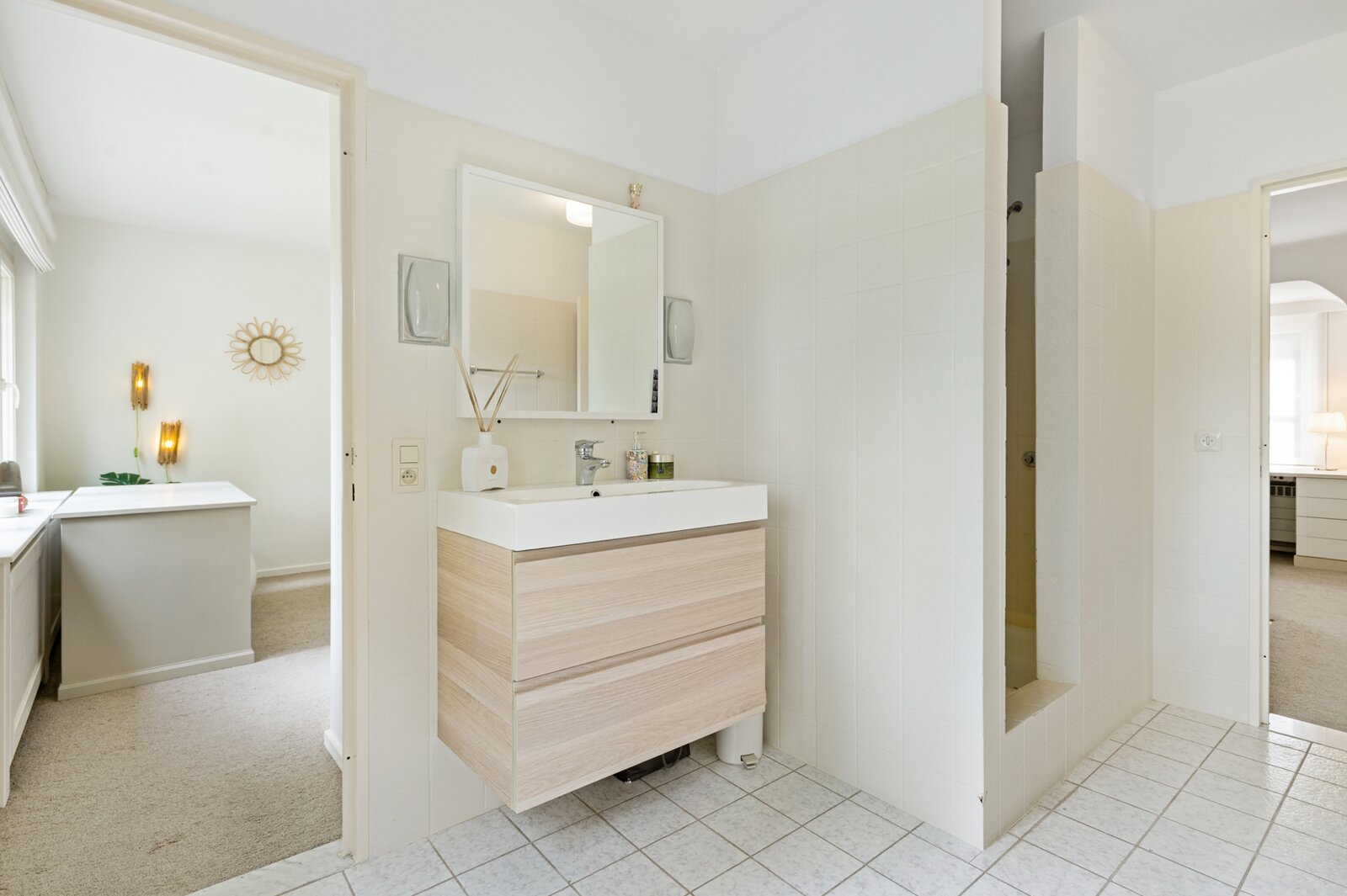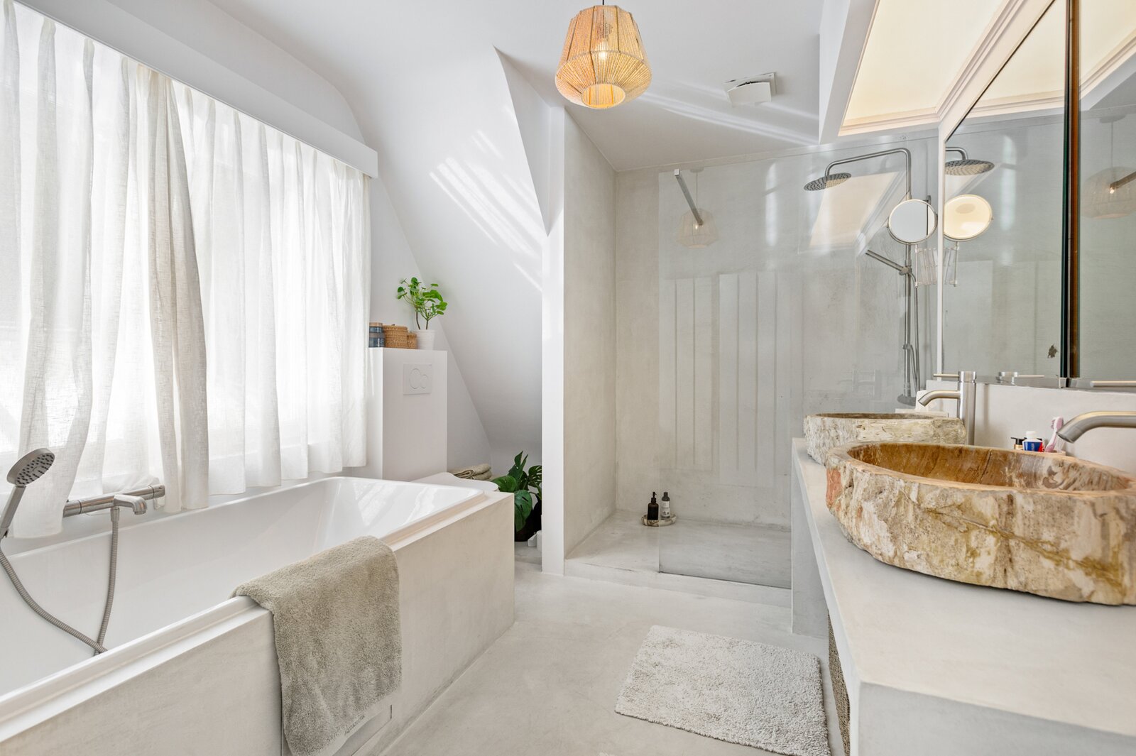 De ruime overloop geeft toegang tot vijf volwaardige slaapkamers. De hoofdslaapkamer beschikt over een badkamer en suite, ingericht met een dubbele lavabo, ligbad en inloopdouche. Twee slaapkamers delen een communicerende douchekamer met dubbele lavabo en douche. Het nachttoilet bevindt zich op de gang. De bergzolder is bereikbaar via een uitschuifbare vlizotrap.