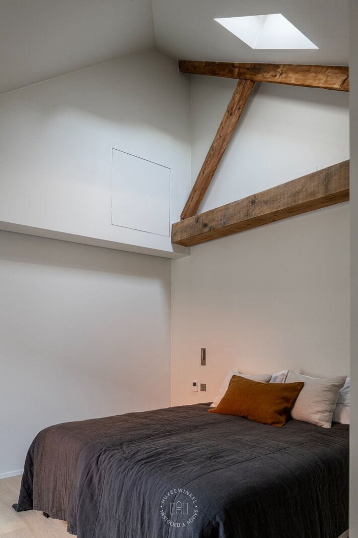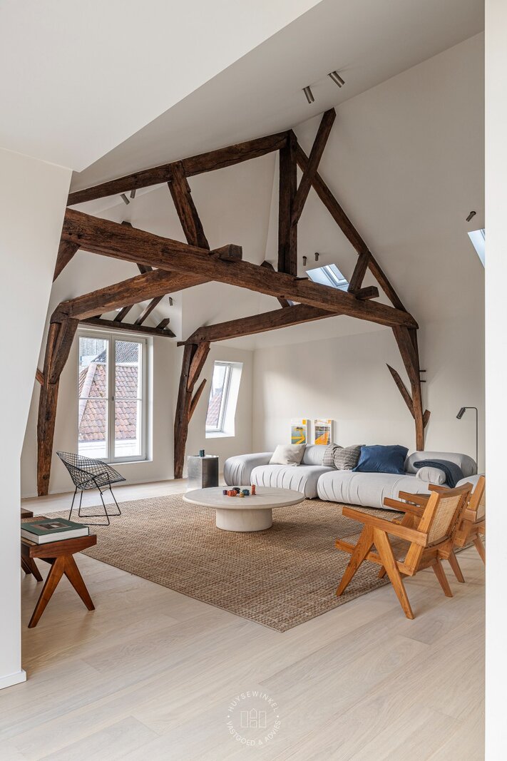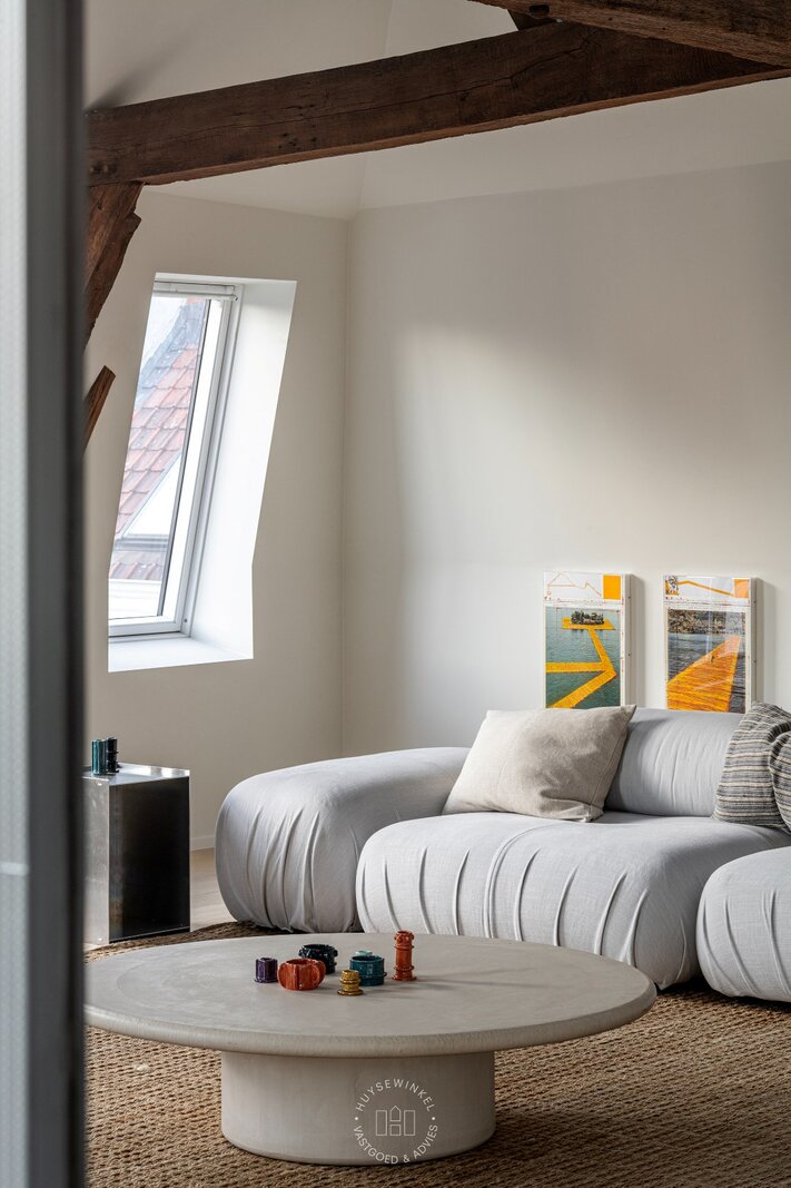 De woning bevindt zich onder het dak en wordt gekenmerkt door zichtbare houten balken en leefruimtes die opengetrokken zijn tot in de nok, wat zorgt voor een uitzonderlijk gevoel van licht en ruimte. Vanuit de leefruimte geniet u van een prachtig uitzicht over de Gentse skyline.