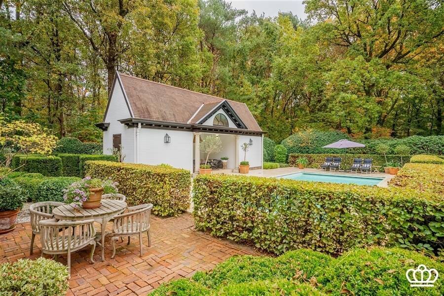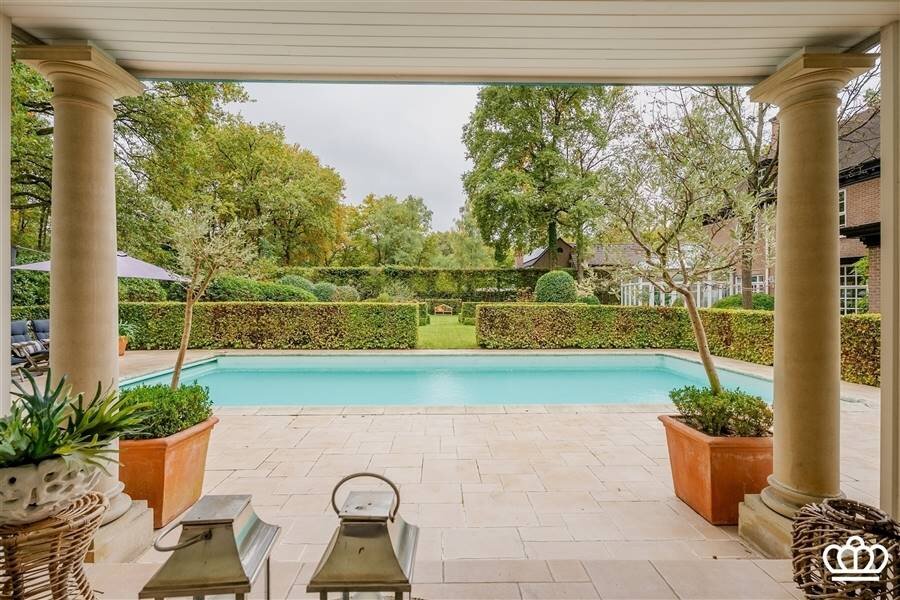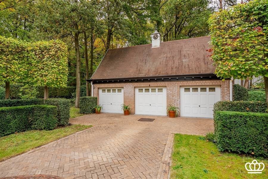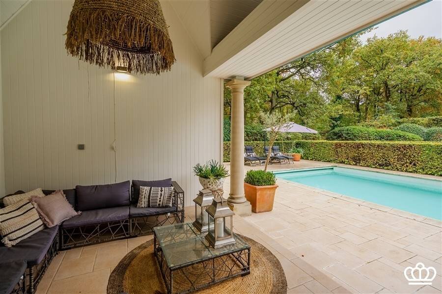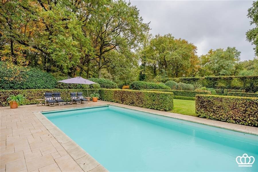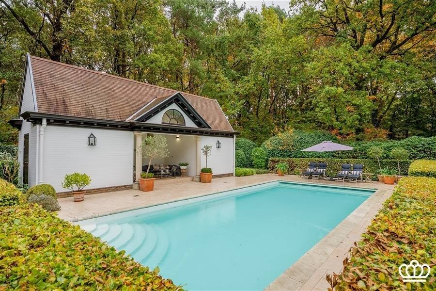 Fraai aangelegde en goed onderhouden tuin met veel zoninval overlopend in eigen (bos)park. Het perceel is geheel omheind en voorzien van een automatische toegangspoort, ruime parking voor het huis. Achter de villa bevindt zich een zwembad omgeven door een terras in natuursteen en een poolhouse dat perfect op de zon gericht is onderverdeeld in een technische ruimte, een knus overdekt lounge terras en een sanitaire ruimte met douche, toilet en lavabo. Achter op het perceel nog een tuinhuis.