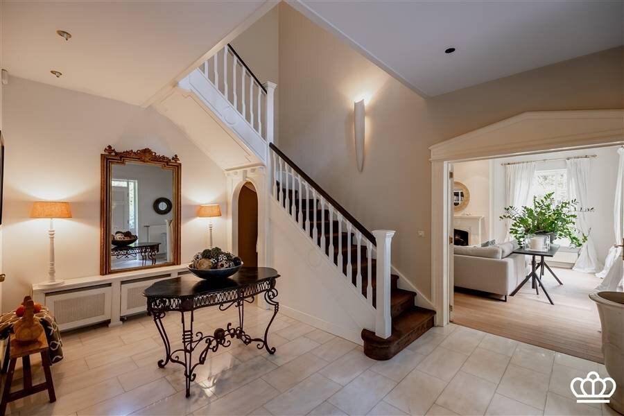 Royale inkomhal op een marmeren vloer en vide reikend tot aan de nok van het dak, vestiairehoek en gastentoilet. Links van de hal een mooie bureelruimte op parket voorzien van ingemaakte kasten.