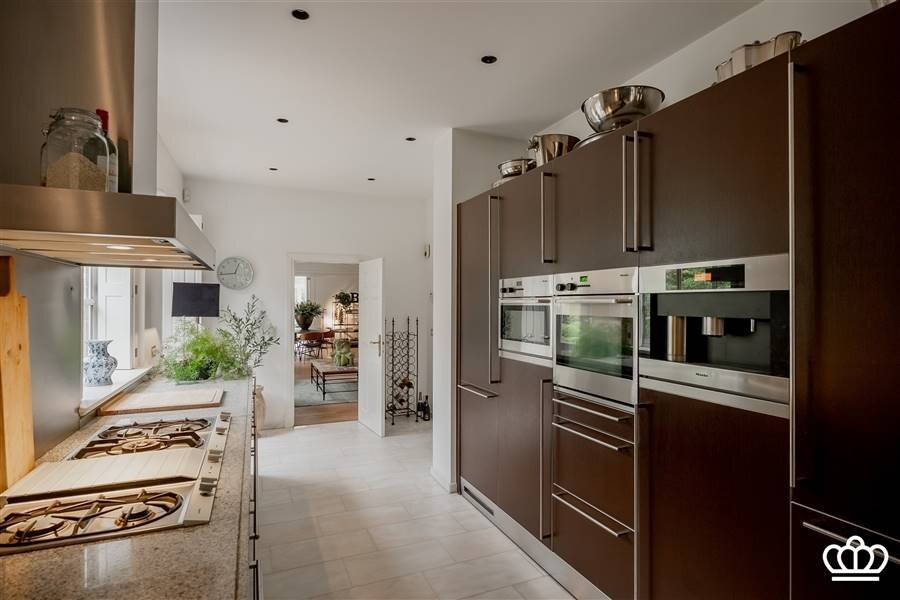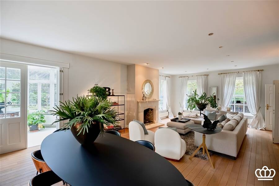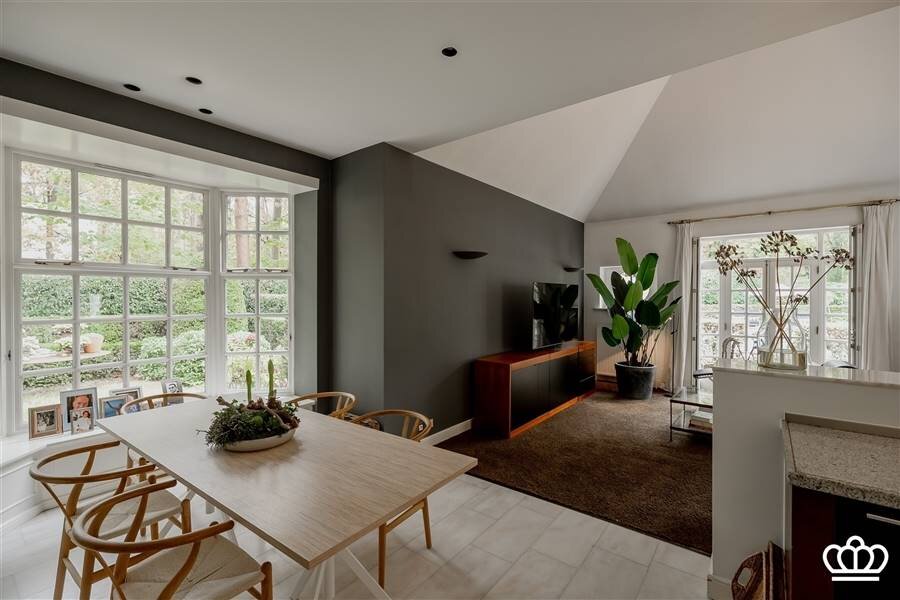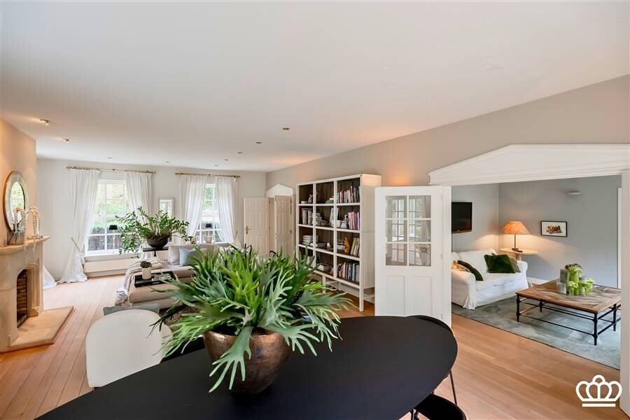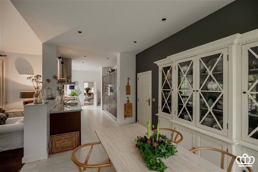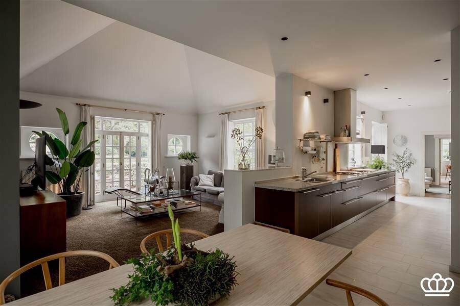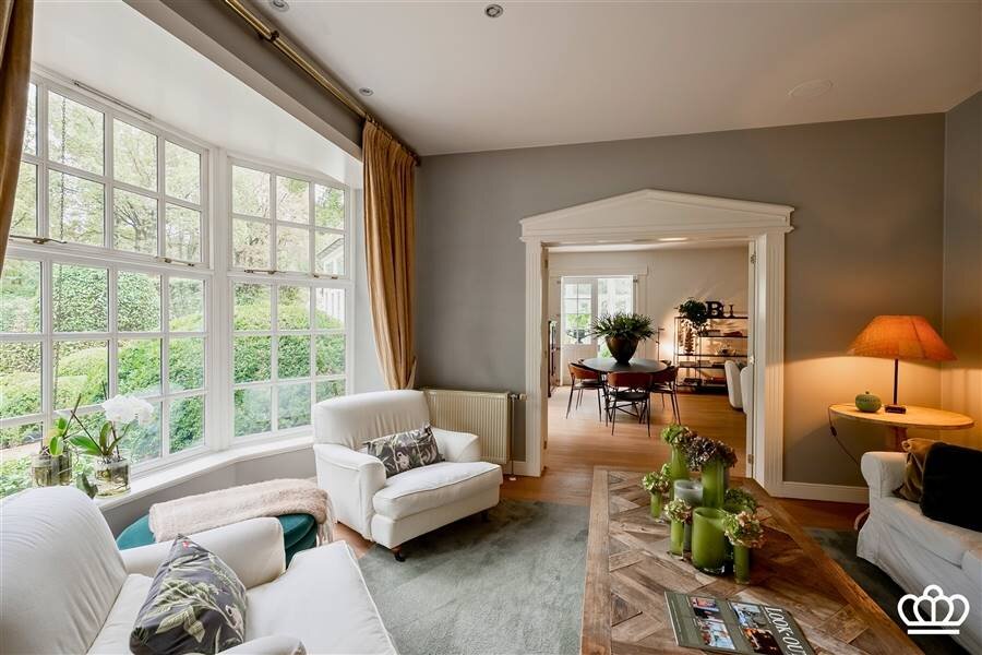 Rechts, middels dubbele deuren, toegang tot een ruime en lichte living op een eiken vloer onderverdeeld in een zithoek met openhaard op gas en een eethoek. Aansluitend een oranjerieruimte met isolerend glas en houten jaloeziën op een marmeren vloer, momenteel ingericht als bureel, met mooi uitzicht over de tuin. “Aperitiefhoek” met erker en aansluitend een ruime en luxe keuken voorzien van een granieten werkblad en uitgerust met alle inbouwapparatuur zoals o.a. koffieapparaat, oven en microgolf (Miele) en gasfornuis met gril (Gaganau) en een ontbijthoek, open verbinding met een aansluitende knusse zit / eetkamer op tapijt met directe toegang tot het terras.
