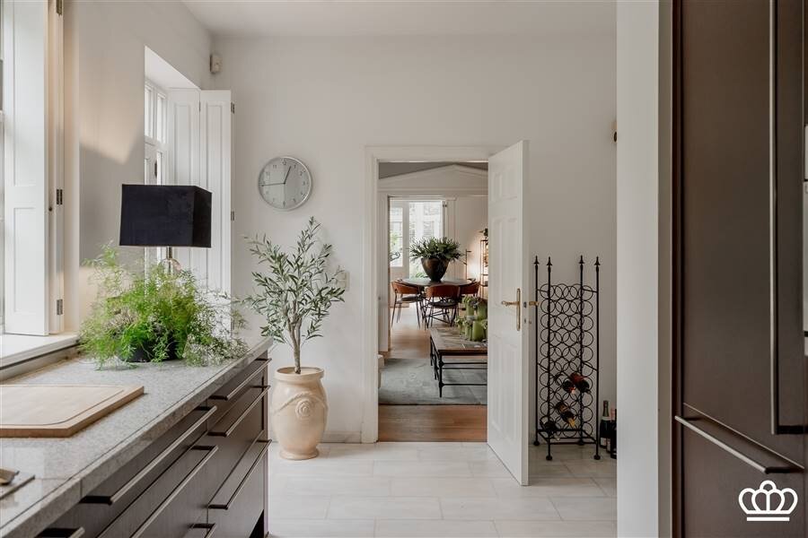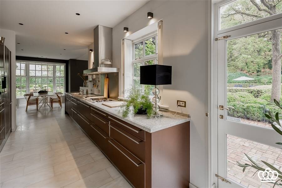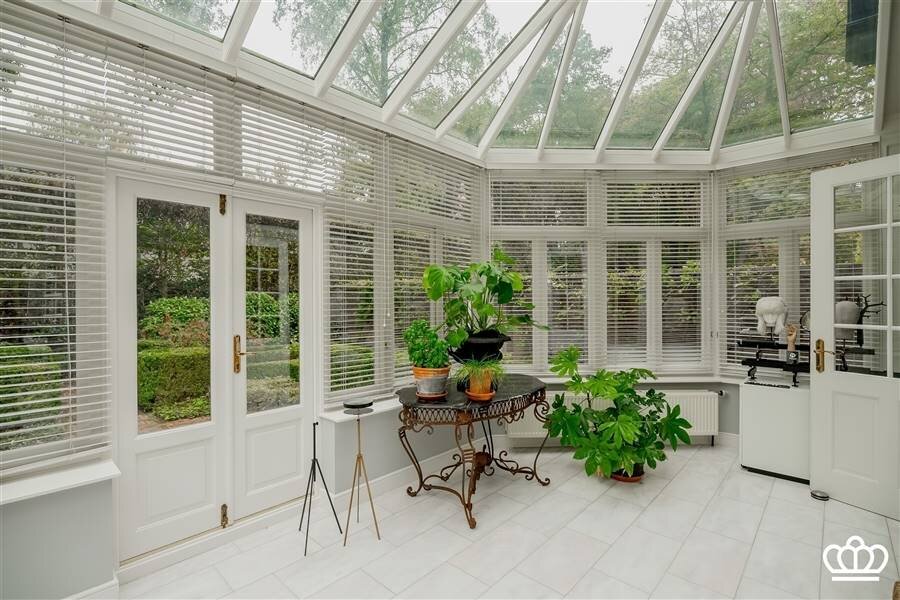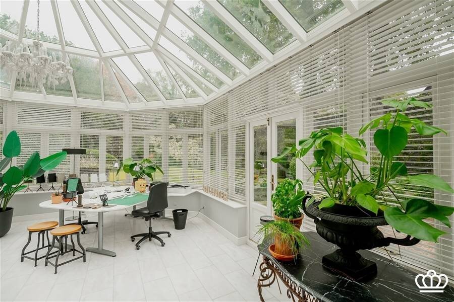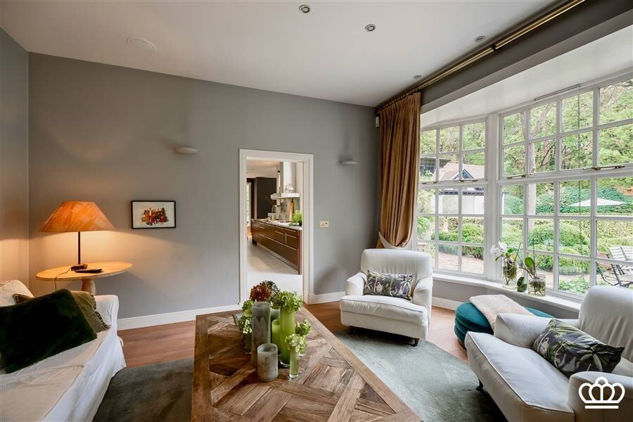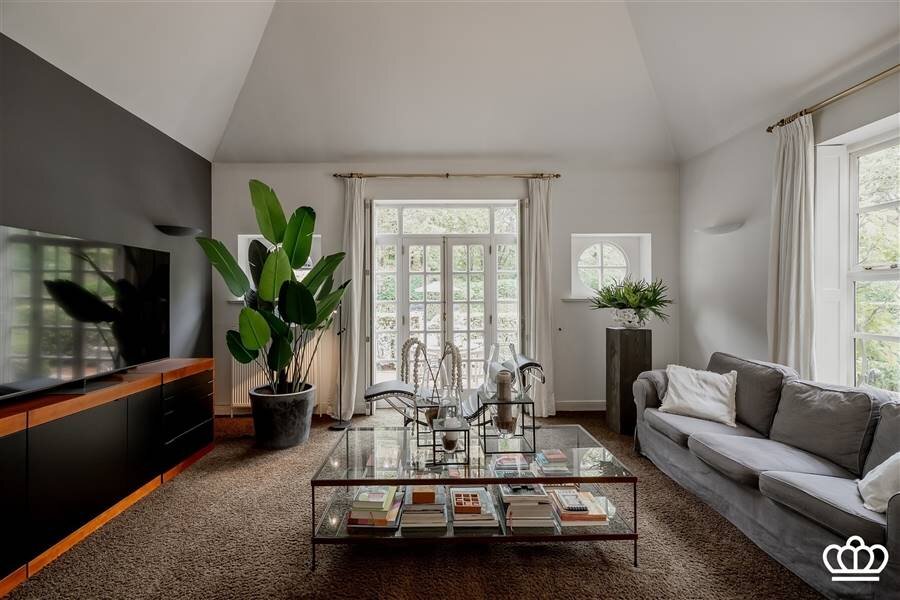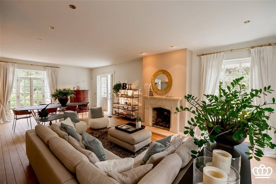 Rechts, middels dubbele deuren, toegang tot een ruime en lichte living op een eiken vloer onderverdeeld in een zithoek met openhaard op gas en een eethoek. Aansluitend een oranjerieruimte met isolerend glas en houten jaloeziën op een marmeren vloer, momenteel ingericht als bureel, met mooi uitzicht over de tuin. “Aperitiefhoek” met erker en aansluitend een ruime en luxe keuken voorzien van een granieten werkblad en uitgerust met alle inbouwapparatuur zoals o.a. koffieapparaat, oven en microgolf (Miele) en gasfornuis met gril (Gaganau) en een ontbijthoek, open verbinding met een aansluitende knusse zit / eetkamer op tapijt met directe toegang tot het terras.