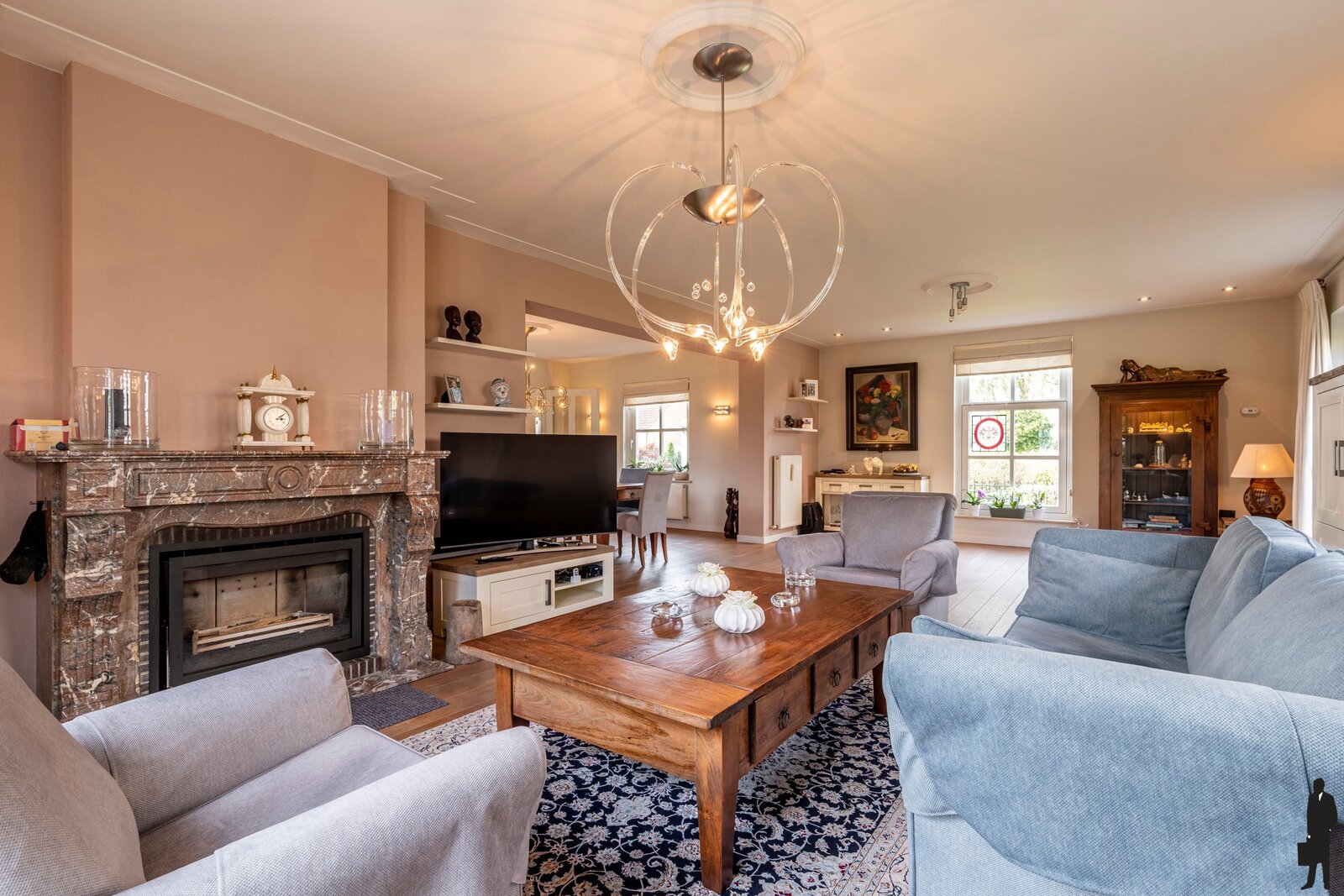 De ruime woonkamer met zijn warme eiken vloer is verdeeld in een eetgedeelte en zitgedeelte met open haard en tuindeuren naar het terras.