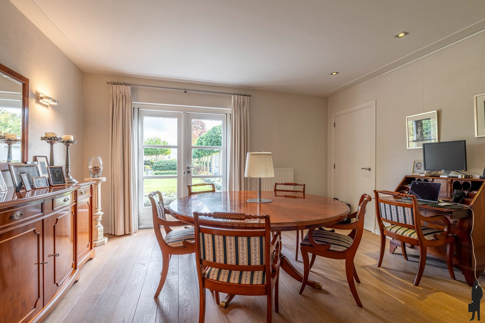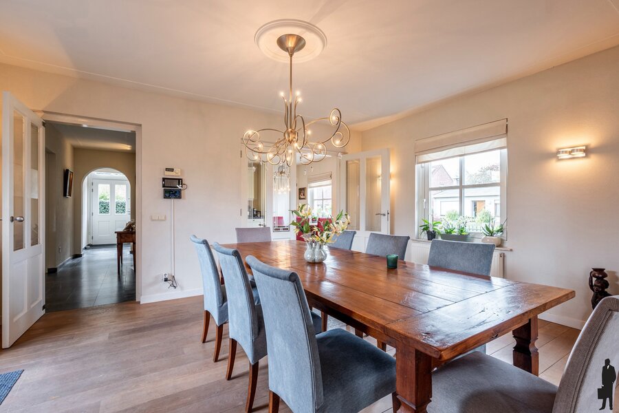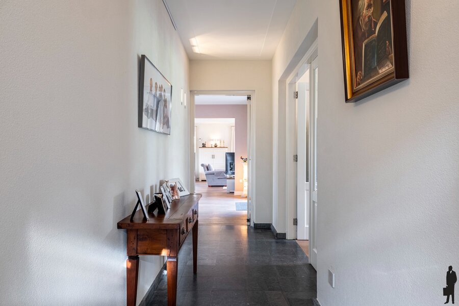 U betreedt de woning via de riante inkomhal met gastentoilet en toegang tot de eetkamer/kantoor met tuindeuren naar het terras.