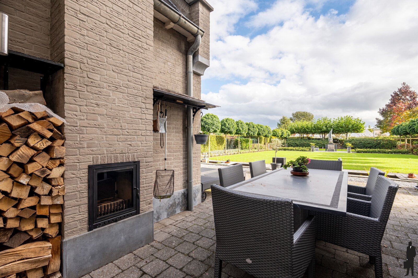 De aangelegde achtertuin met gazon heeft meerdere terrassen waaronder 1 met buitenhaard.