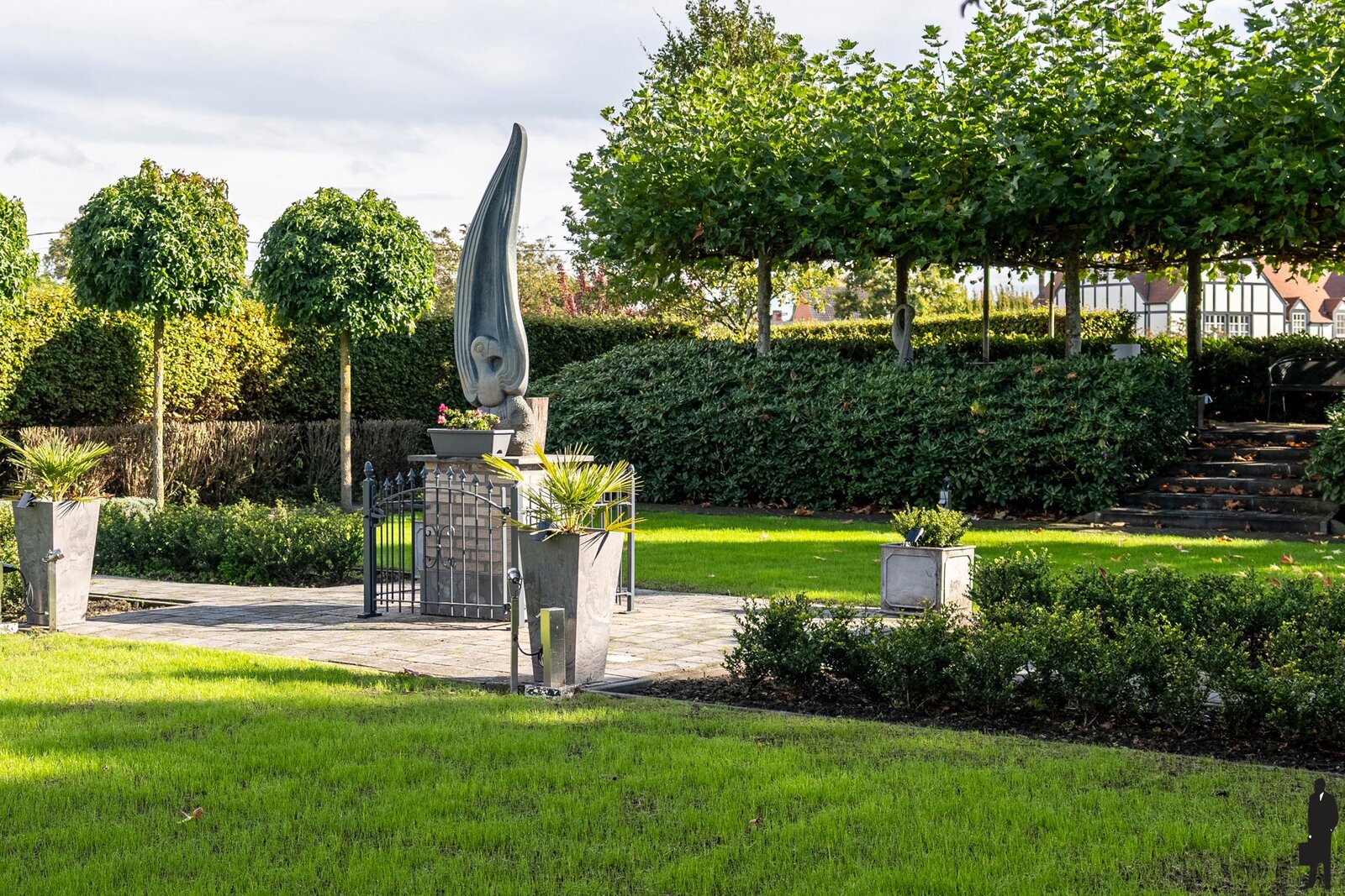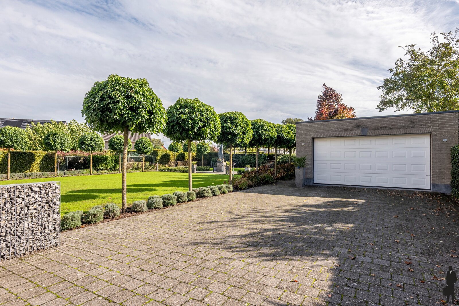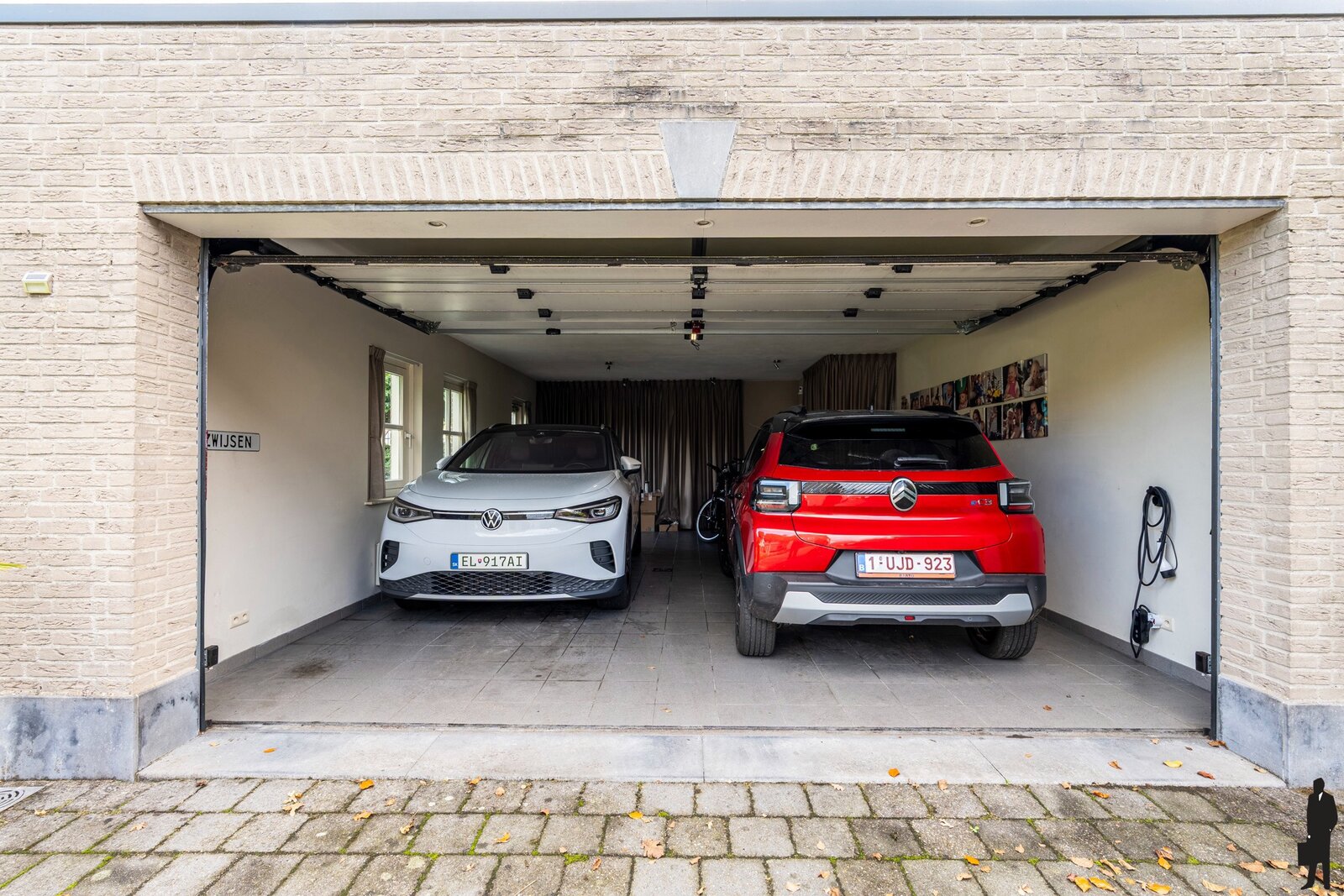 De oprit aan de zijkant is geschikt voor meerdere auto's en wordt afgesloten door een automatische poort.