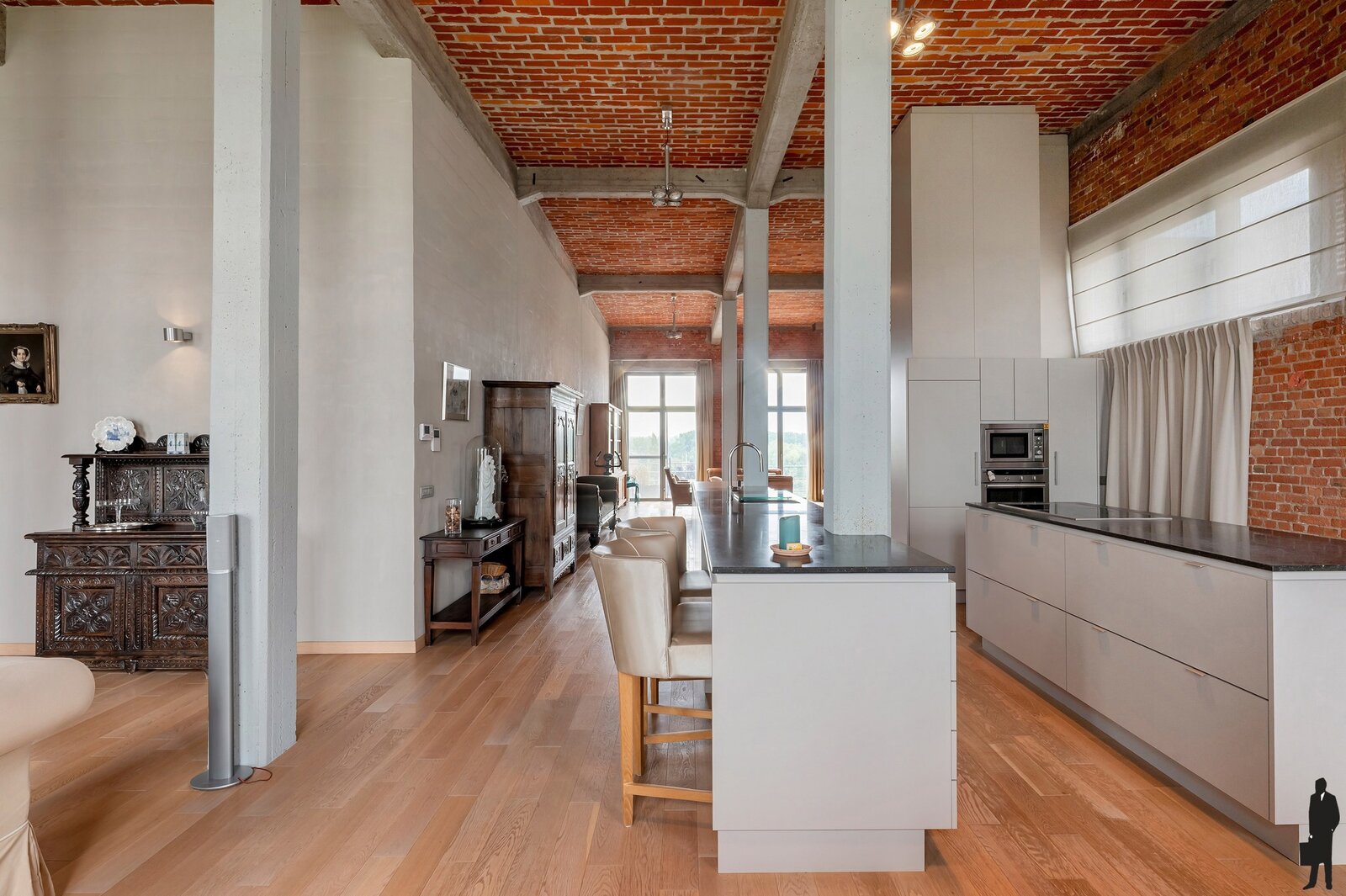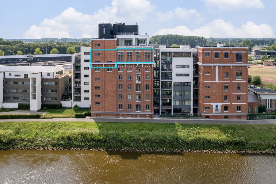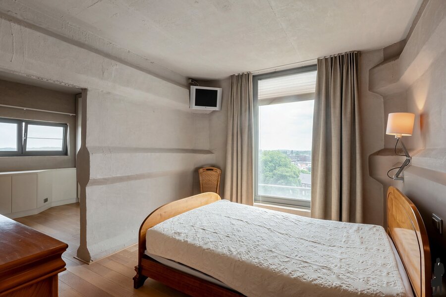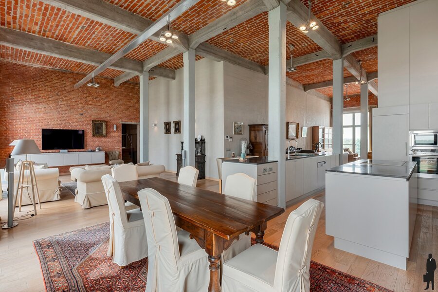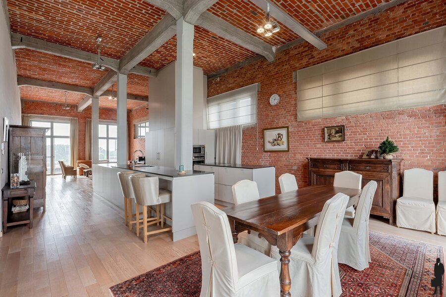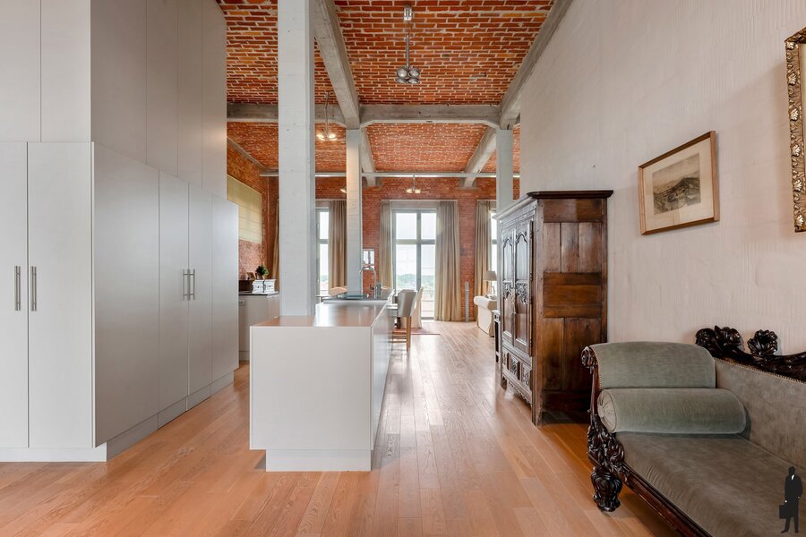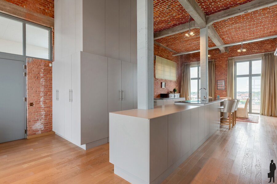 Je betreedt de loft in een indrukwekkende en karaktervolle leefruimte op parket met veel natuurlijk licht en met een panoramisch uitzicht over de oude stadskern en de Nete. De open keuken met hoogwaardige afwerking vormt het hart van deze woonst – ideaal voor kookliefhebbers én gasten