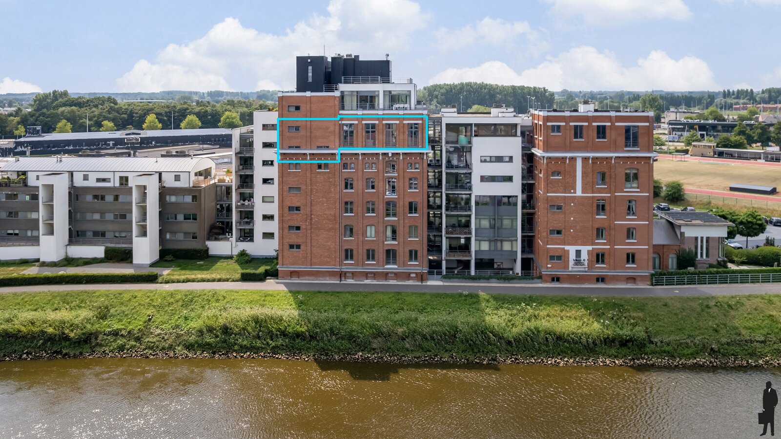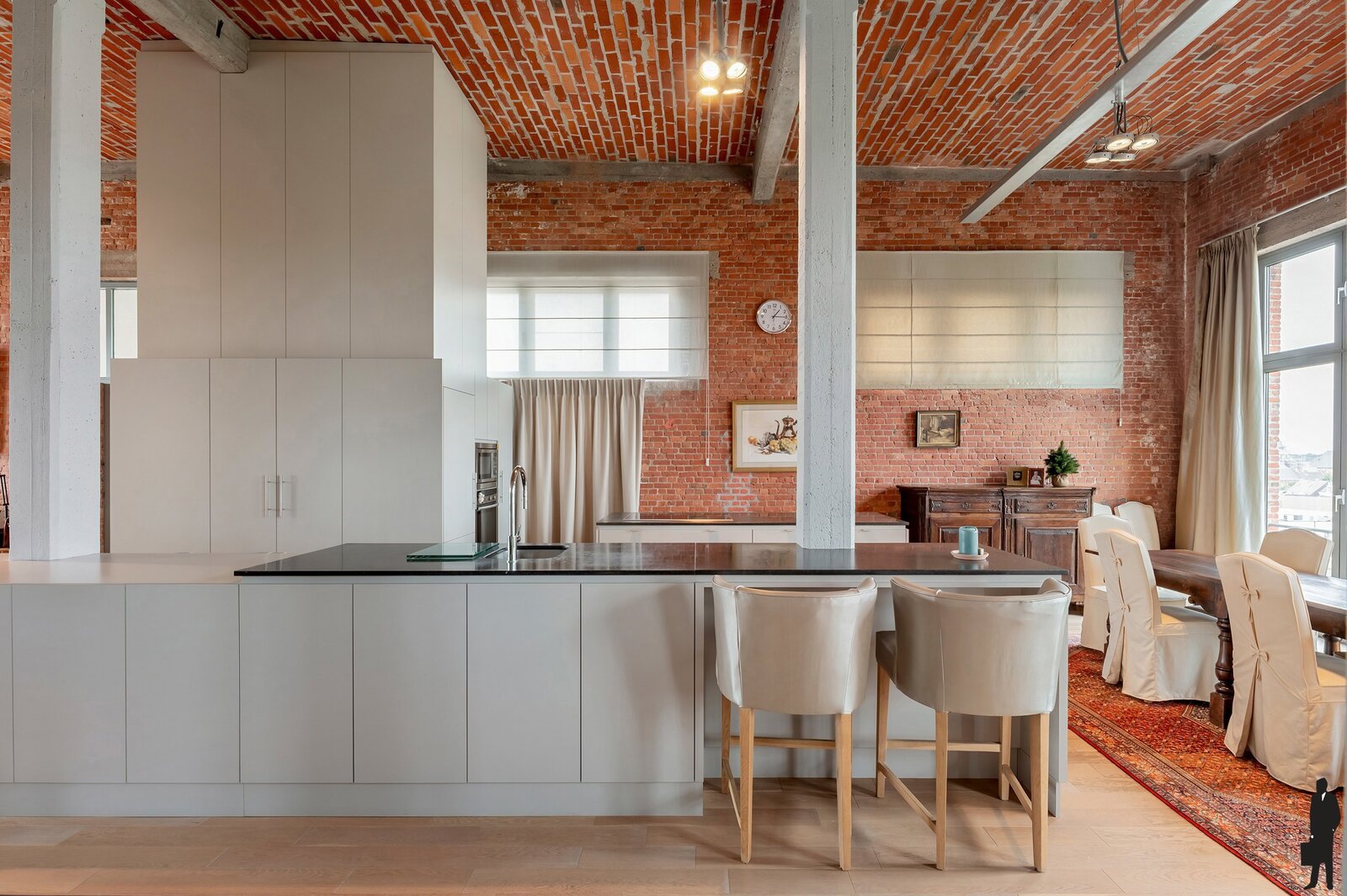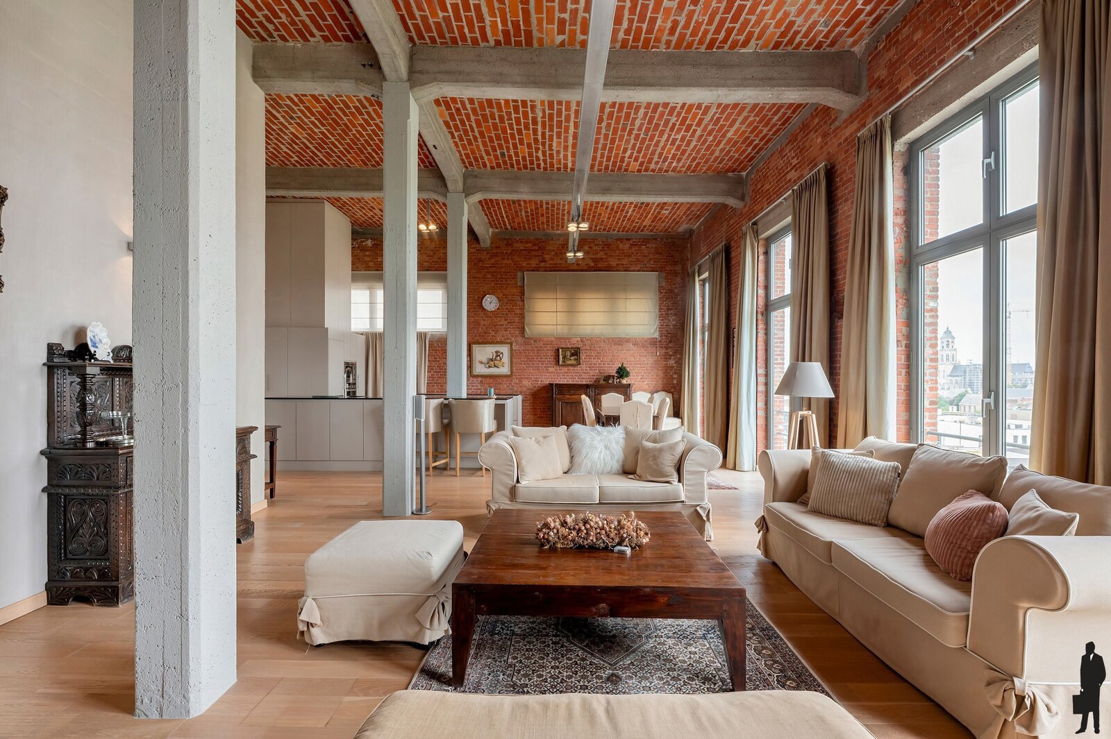 Je betreedt de loft in een indrukwekkende en karaktervolle leefruimte op parket met veel natuurlijk licht en met een panoramisch uitzicht over de oude stadskern en de Nete. De open keuken met hoogwaardige afwerking vormt het hart van deze woonst – ideaal voor kookliefhebbers én gasten