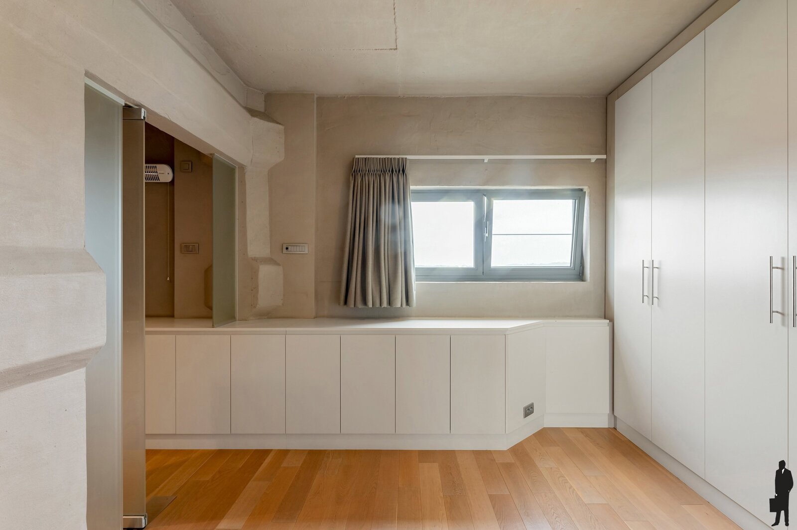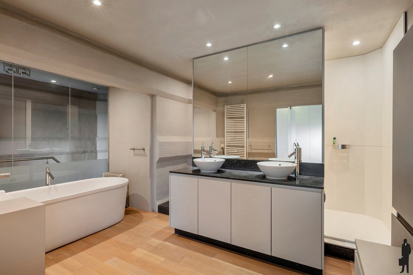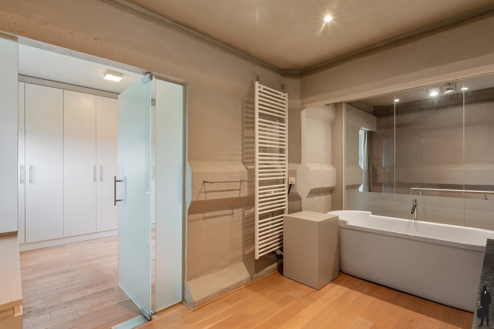 De master bedroom beschikt over een aanpalende dressing met ingebouwde kasten, én een luxueuze en-suite badkamer. De badkamer is uitgerust met een vrijstaand ligbad, een inloopdouche, een toilet en een dubbel lavabomeubel.