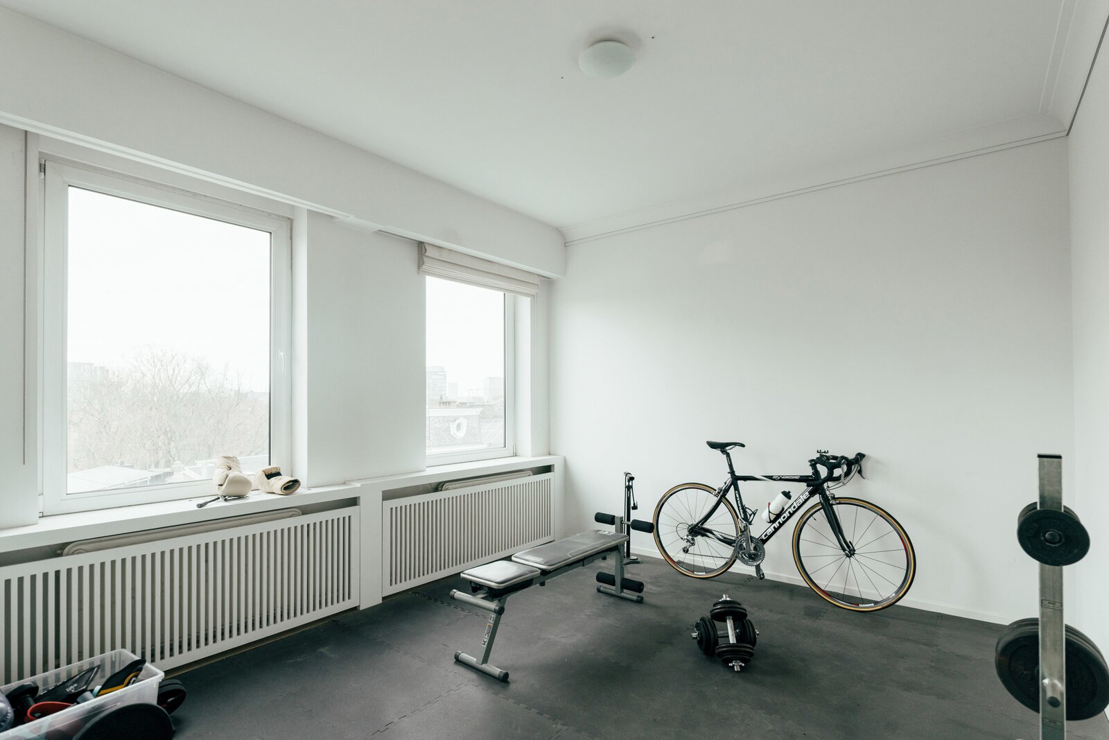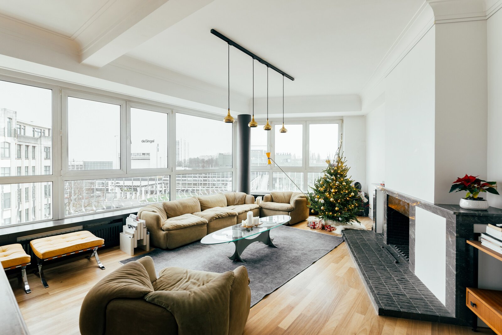 Le point fort absolu ? Le séjour. Le parquet d’origine datant de 1957, la vue panoramique sur le Singel et la ville, ainsi que la luminosité exceptionnelle rendent cet espace tout simplement remarquable. Grâce à sa configuration d’appartement d’angle, organisé autour du noyau central de l’ascenseur, chaque pièce bénéficie de lumière naturelle et d’une sensation d’espace. Ici, lumineux et aéré n’est pas une promesse en l’air.