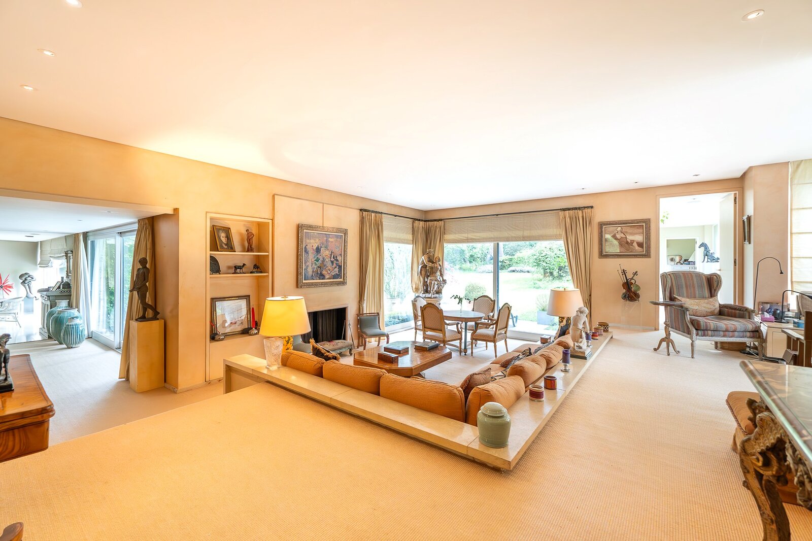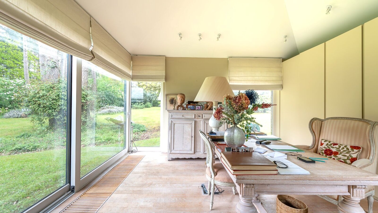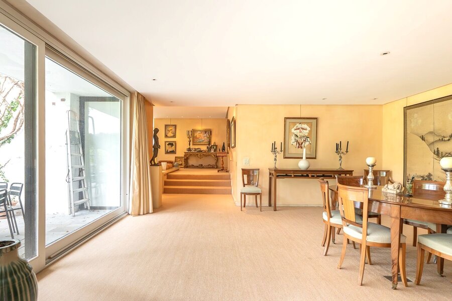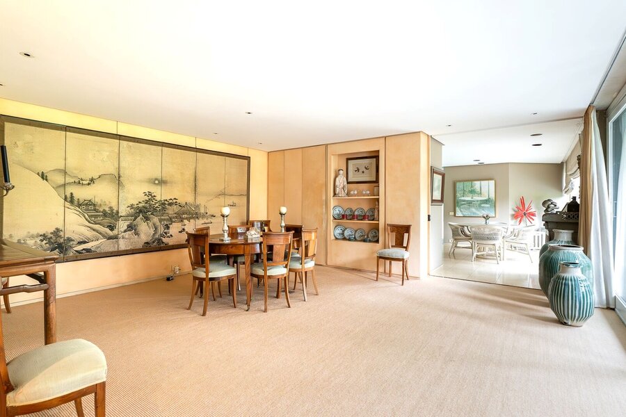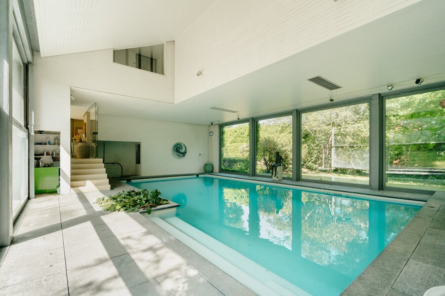 Le rez-de-chaussée (415 m²) s’ouvre sur un vaste hall d’entrée et comprend un double salon baigné de lumière avec cheminée, un bureau, une salle à manger, une cuisine séparée, ainsi qu’une somptueuse piscine intérieure ouverte sur le jardin.