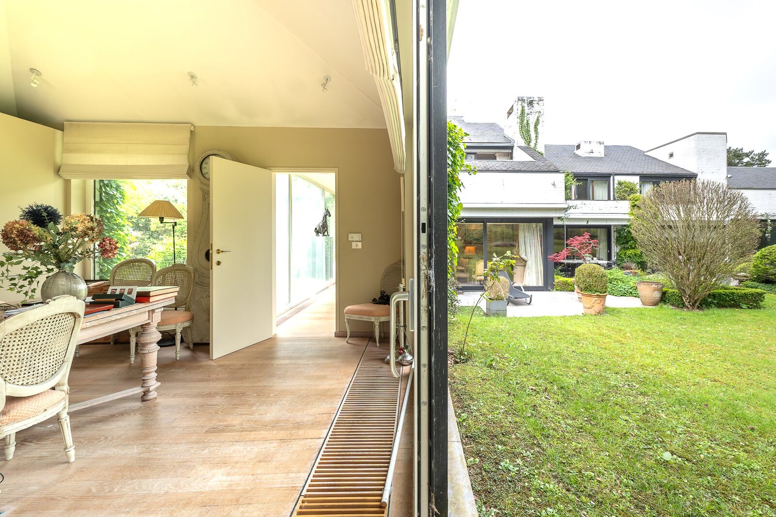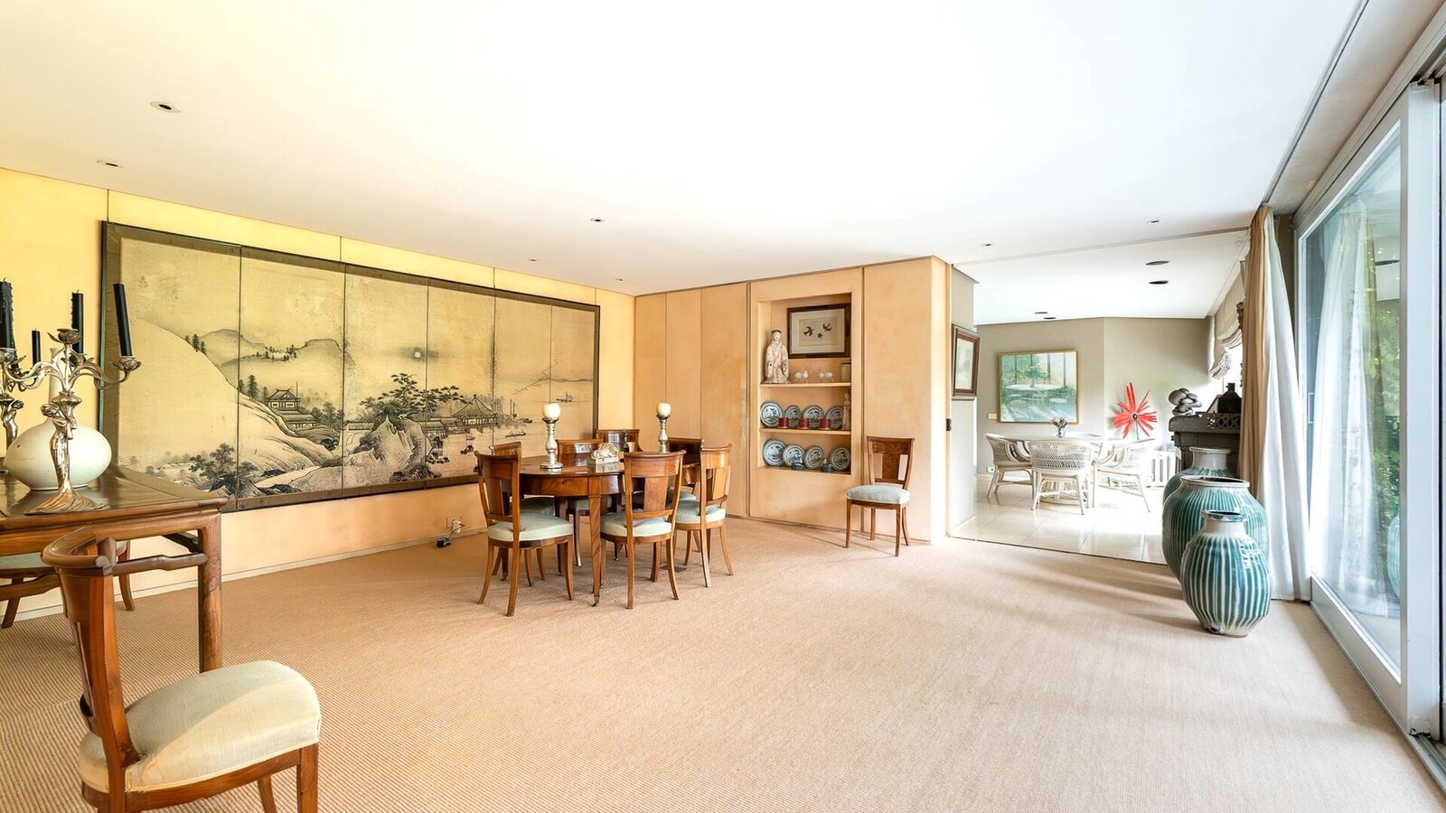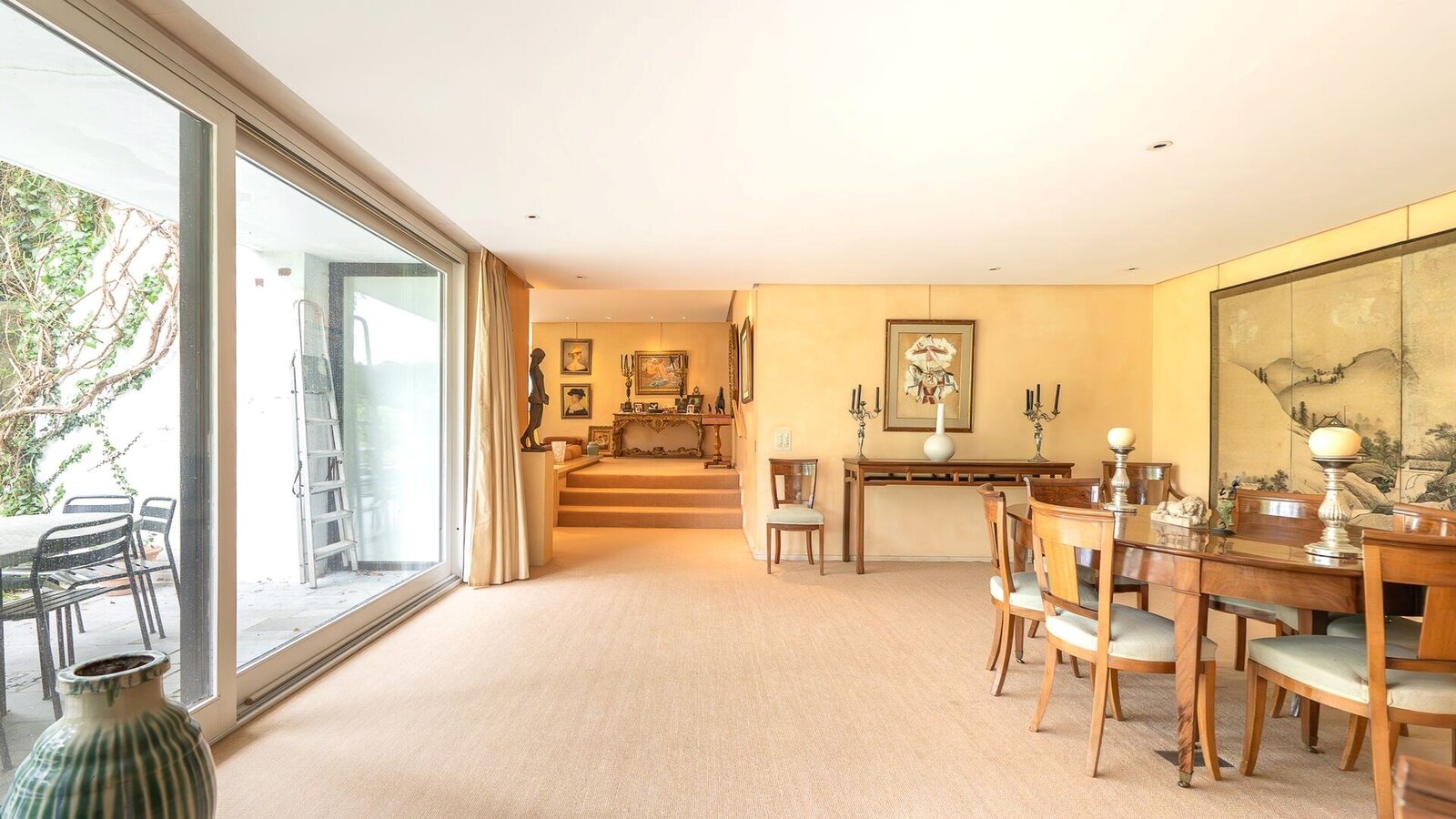Le rez-de-chaussée (415 m²) s’ouvre sur un vaste hall d’entrée et comprend un double salon baigné de lumière avec cheminée, un bureau, une salle à manger, une cuisine séparée, ainsi qu’une somptueuse piscine intérieure ouverte sur le jardin.