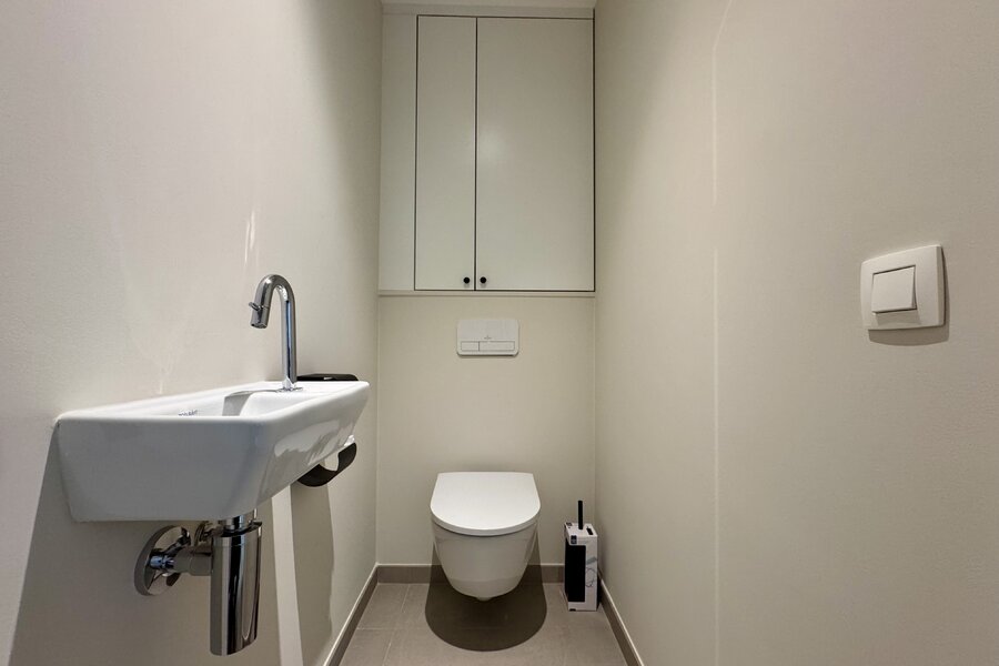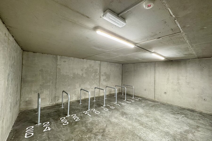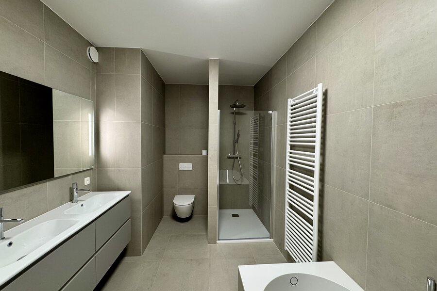 Par le vaste hall d’entrée avec vestiaire et toilettes invités séparées, vous accédez au séjour lumineux avec cuisine ouverte. Celui-ci donne accès à la terrasse couverte orientée plein sud, où vous pourrez profiter en toute tranquillité et intimité de la verdure environnante. L’appartement comprend également deux chambres à coucher de taille confortable ainsi qu’un espace bureau séparé. La salle de bains élégante est équipée d’une baignoire, d’une douche à l’italienne, d’un double lavabo et de toilettes. Une buanderie séparée est également prévue. Au sous-sol, sont inclus une spacieuse cave privative, une place de parking couverte avec borne de recharge pour véhicule électrique, ainsi que deux emplacements pour vélos. L’appartement est équipé de manière durable et tournée vers l’avenir : chauffage par le sol via une pompe à chaleur géothermique collective, panneaux solaires communs, récupération des eaux de pluie et vitrage à haut rendement. L’ensemble garantit une faible consommation énergétique et un confort de vie optimal.