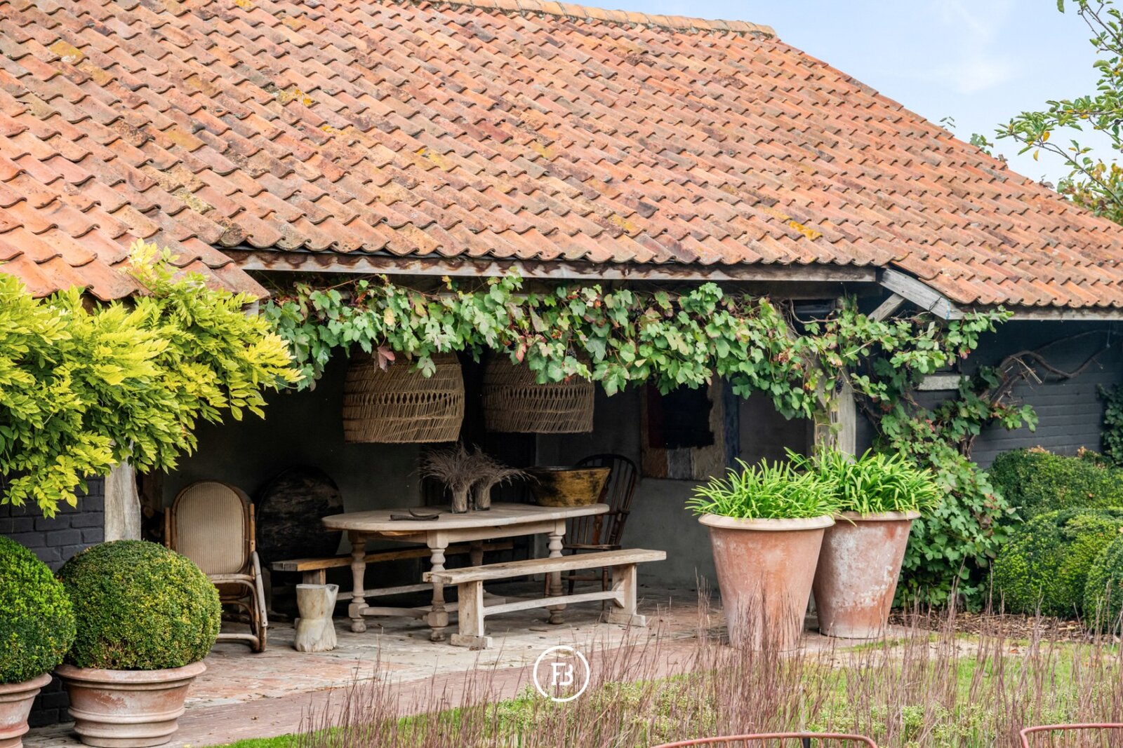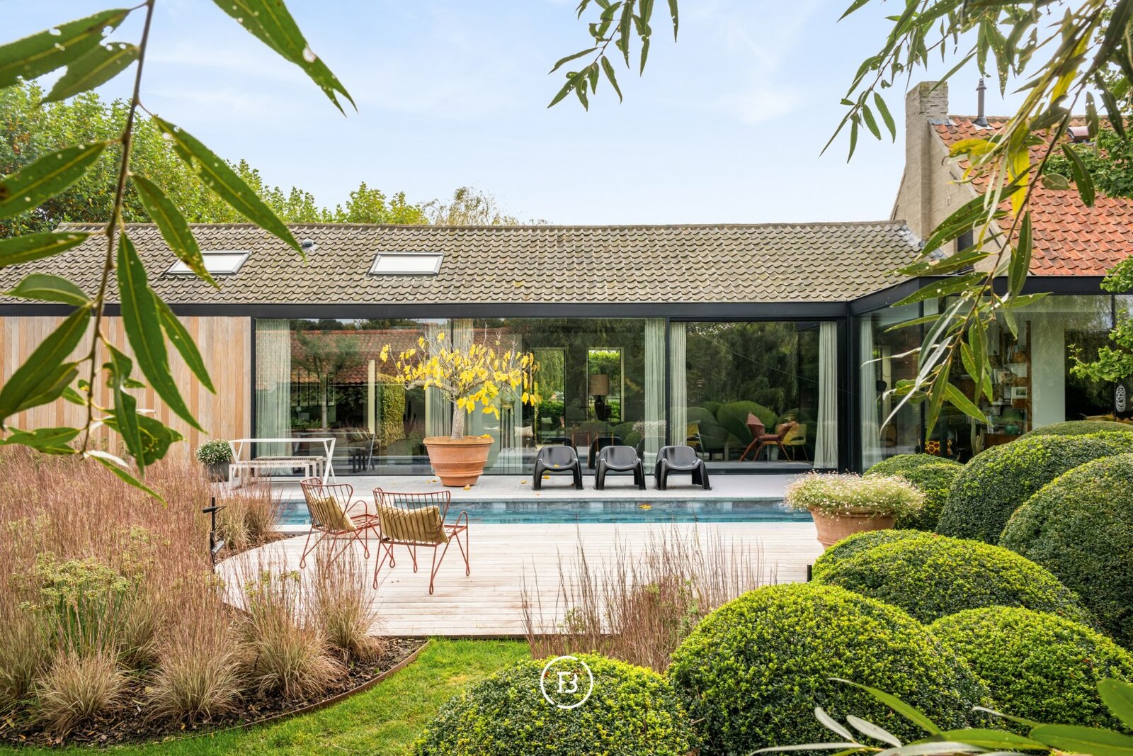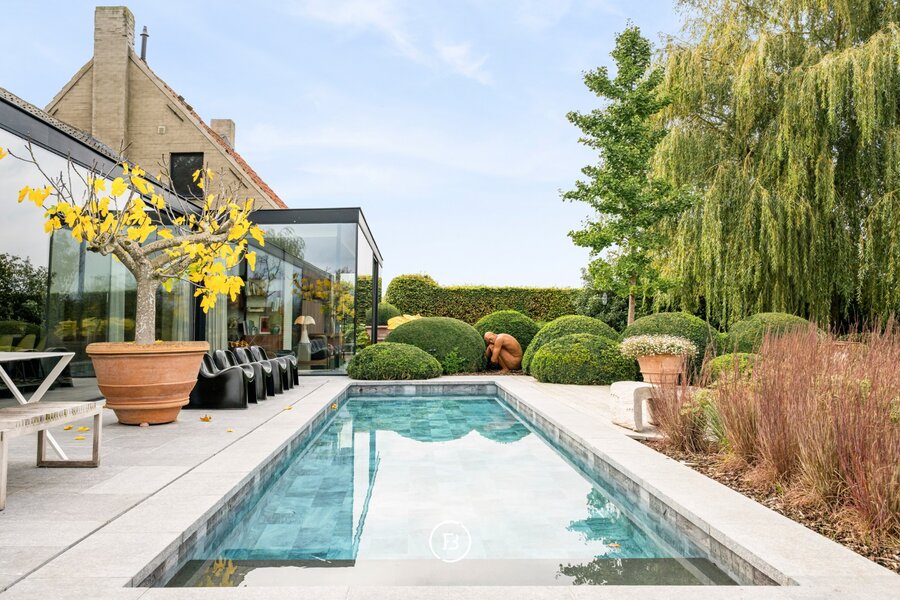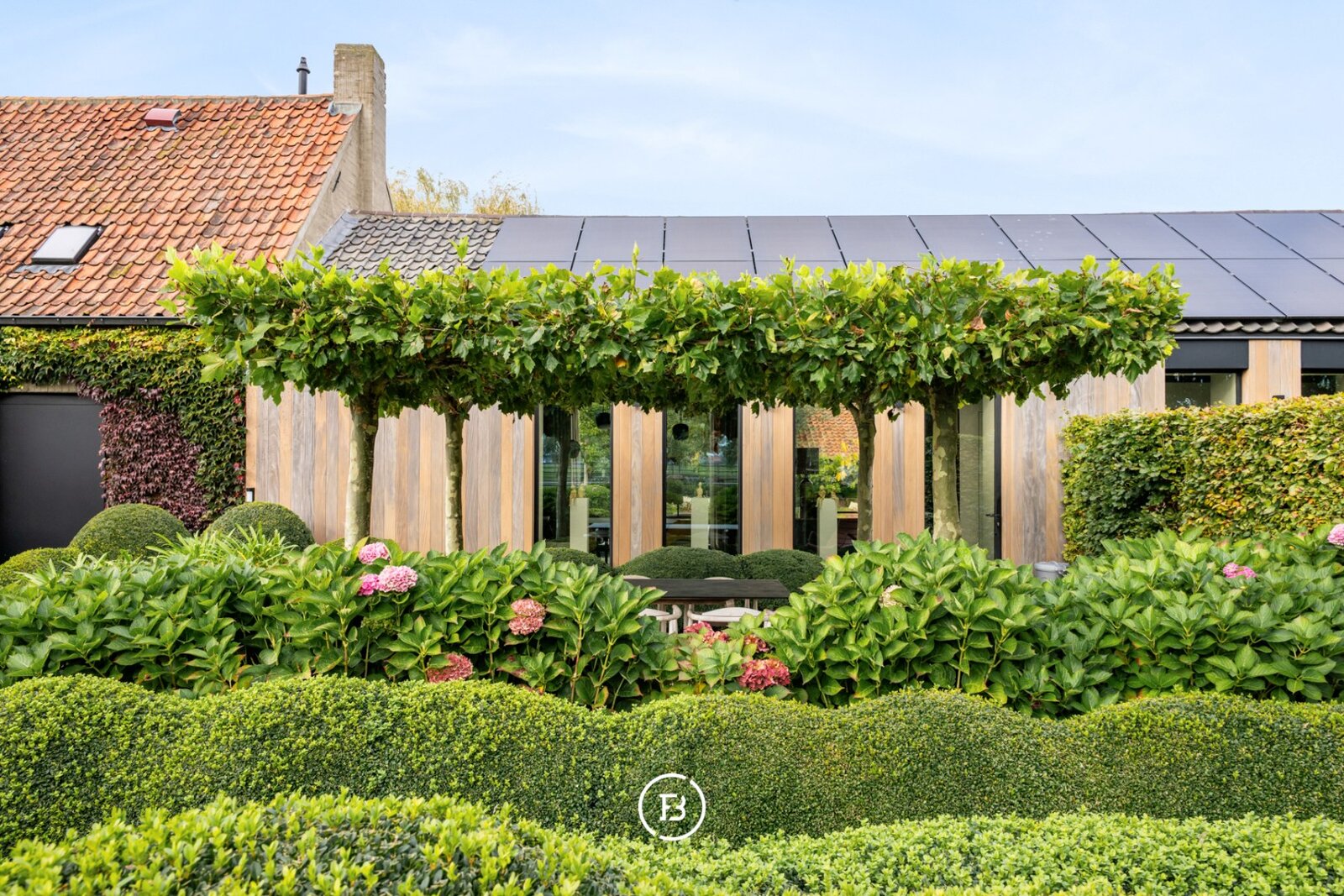 L’extérieur invite à la détente : la superbe piscine avec grande terrasse attenante au séjour et la terrasse couverte de la dépendance, parfaite comme poolhouse, transforment chaque soirée d’été en moment magique. Le jardin paysager, orné de bordures de buis et d’arbres matures, dispose d’un système d’arrosage automatique garantissant une oasis verte permanente et une ambiance de vacances instantanée. Les prairies clôturées avec abris conviennent idéalement aux amateurs d’animaux. Un double carport complète l’ensemble.