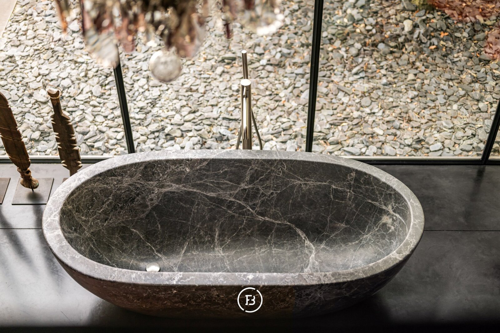 Le séjour baigné de lumière offre une vue panoramique sur le jardin et comprend un salon avec feu ouvert, un coin lecture, une salle à manger avec feu ouvert et une cuisine hyper-équipée. Le rez-de-chaussée comprend également la suite parentale (actuellement utilisée comme salle TV), une salle de douche et une salle de bain luxueuse avec baignoire et vue sur un patio intérieur. Une mezzanine peut servir de bureau ou de chambre supplémentaire. À l’étage, on trouve deux chambres, une salle de douche et une buanderie.