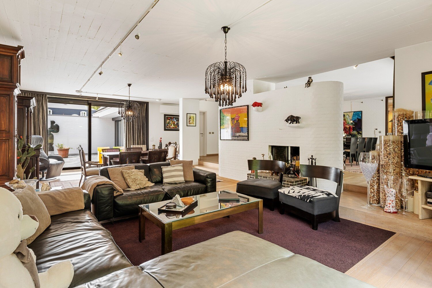Bij het betreden van de woning komt u binnen in een ruime inkomhal met vestiaire. De royale leefruimte baadt in het licht en biedt een prachtig uitzicht op de tuin en de aangrenzende terrassen. Dankzij de indeling beschikt u over een gezellige zithoek, afgescheiden van de eetruimte door een sfeervolle haard waardoor dit een perfecte plek is om tot rust te komen.